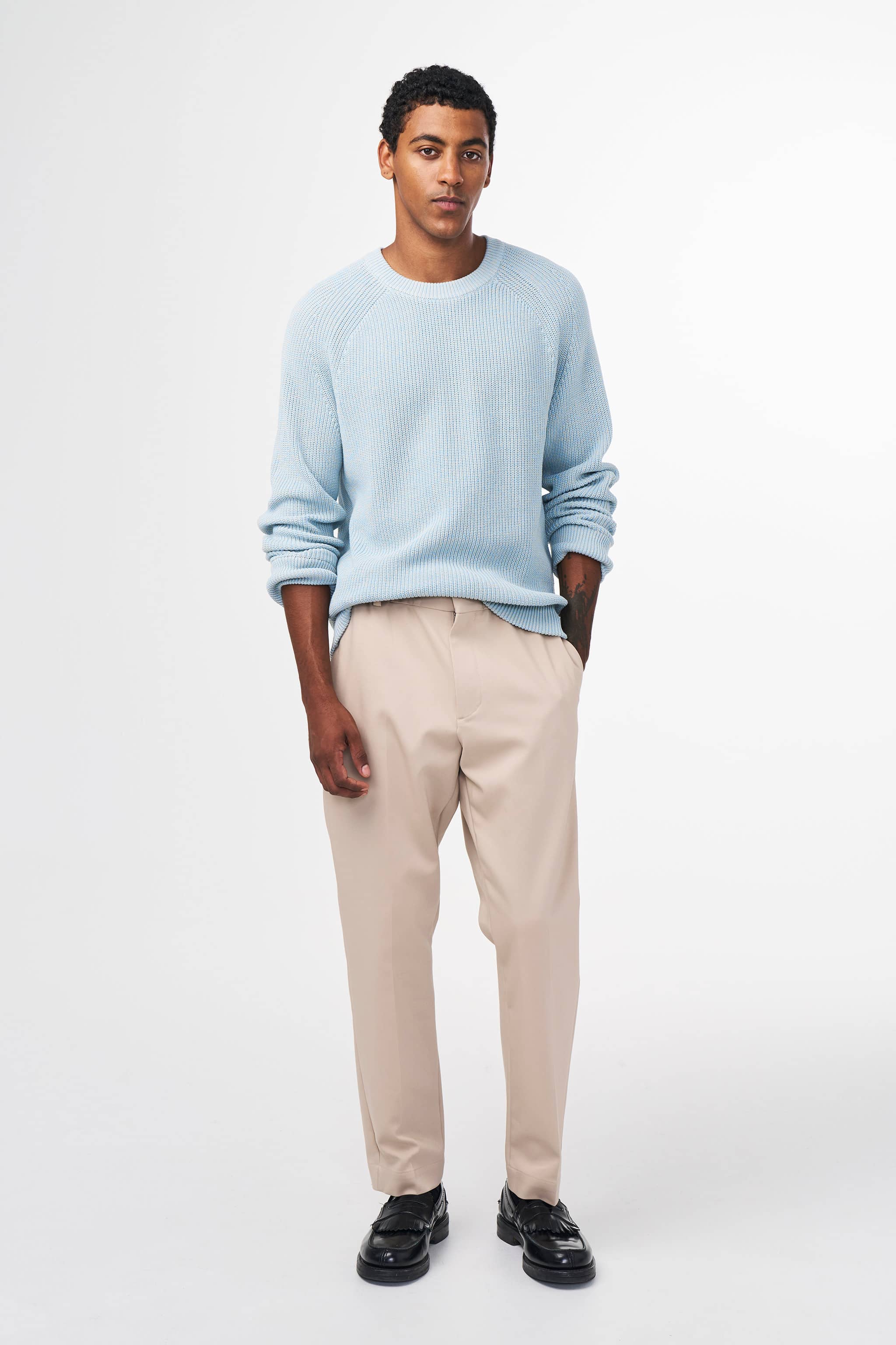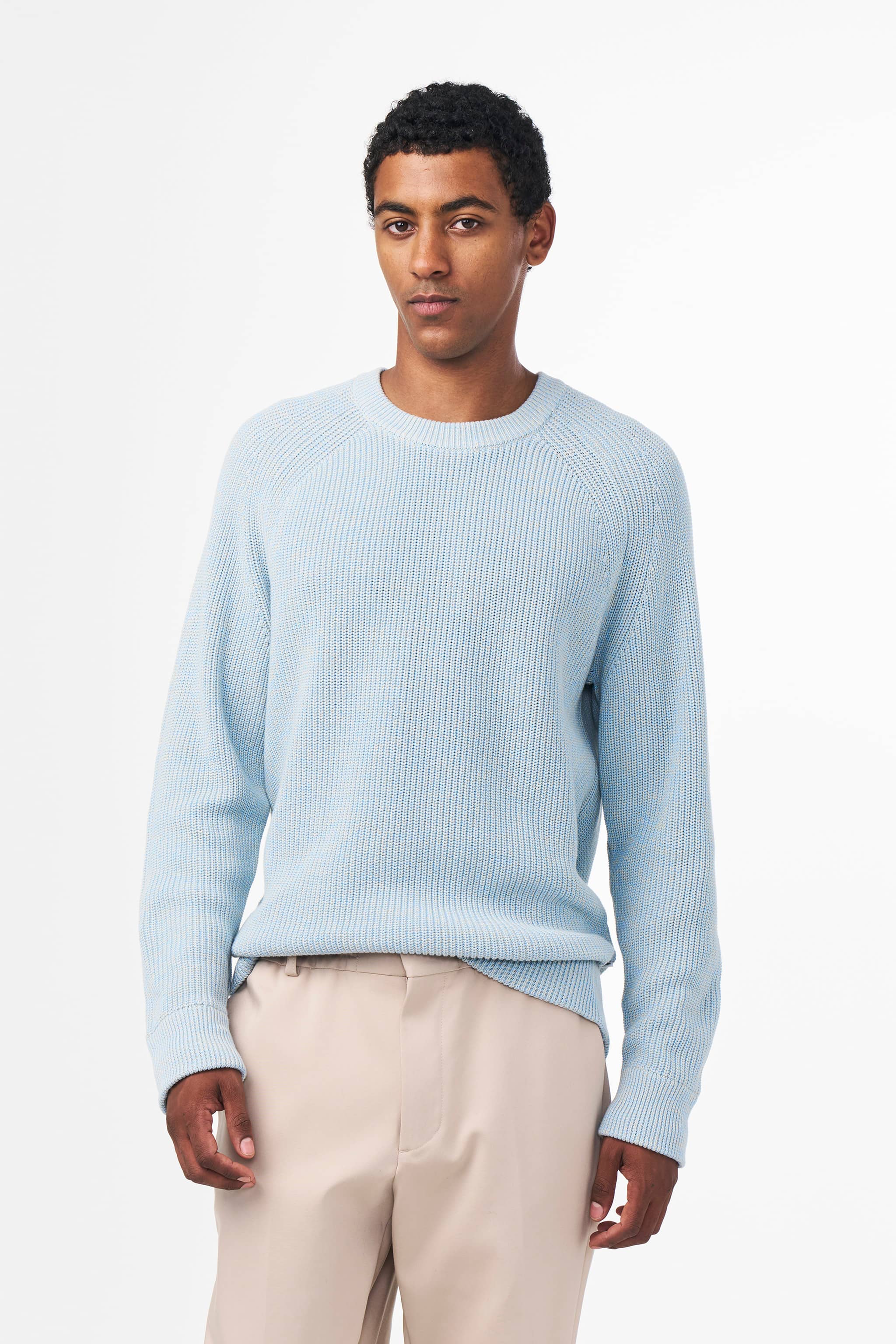 Crewneck crafted in a soft cotton, knit in a half-cardigan stitch.
