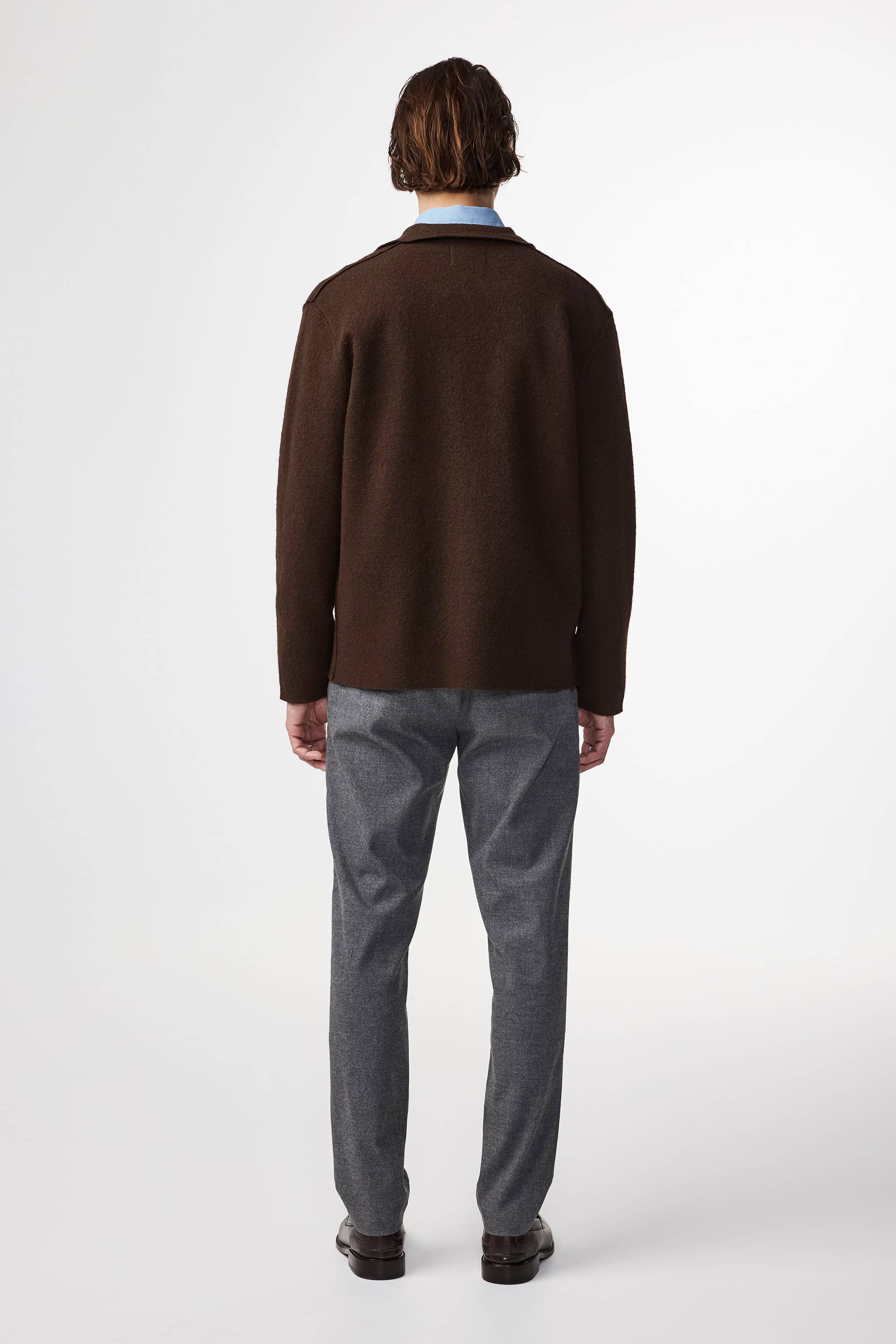 Casual overshirt crafted in soft, lightweight boiled Merino wool, designed with a shirting collar, raw edges, and NN.07 logo buttons.