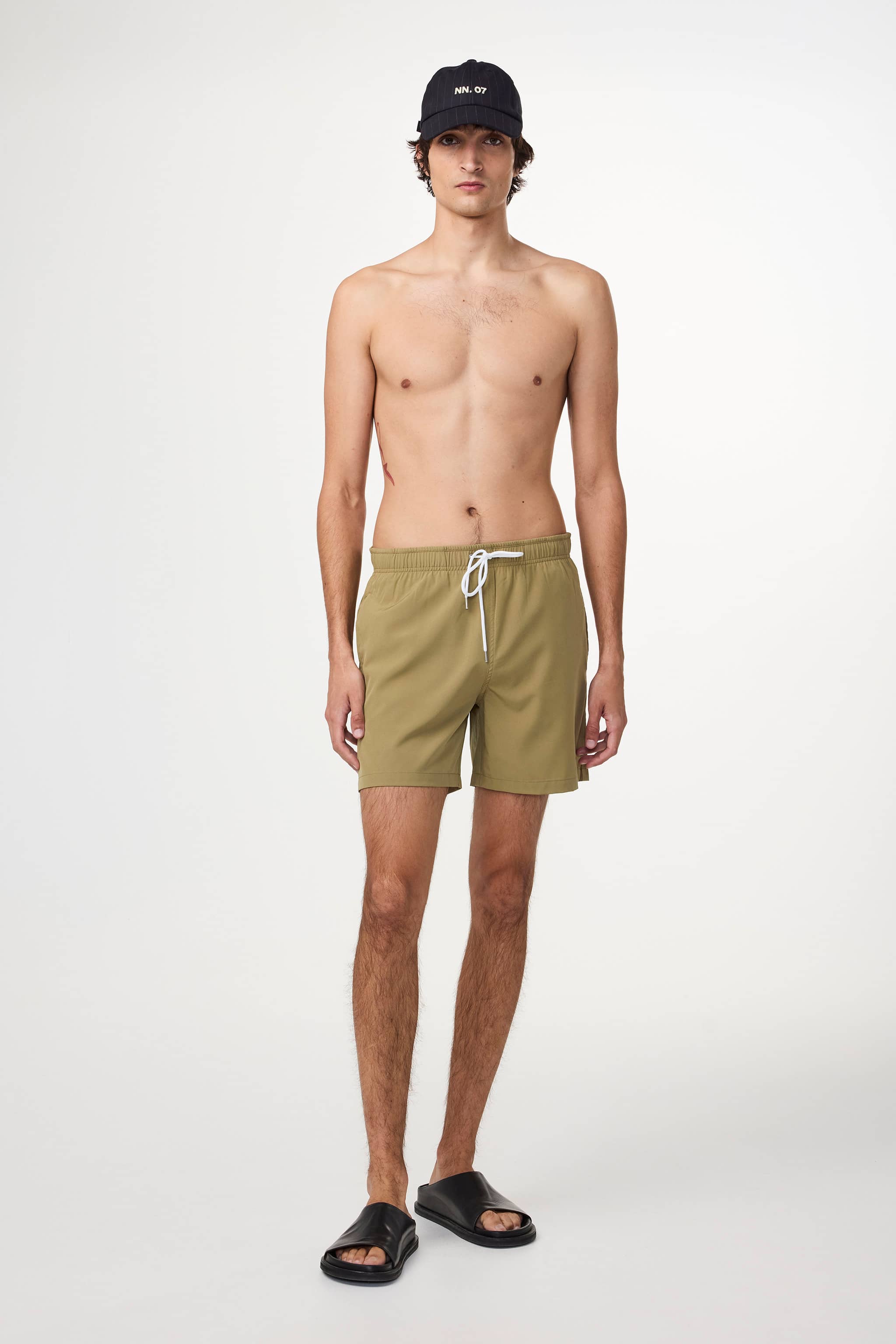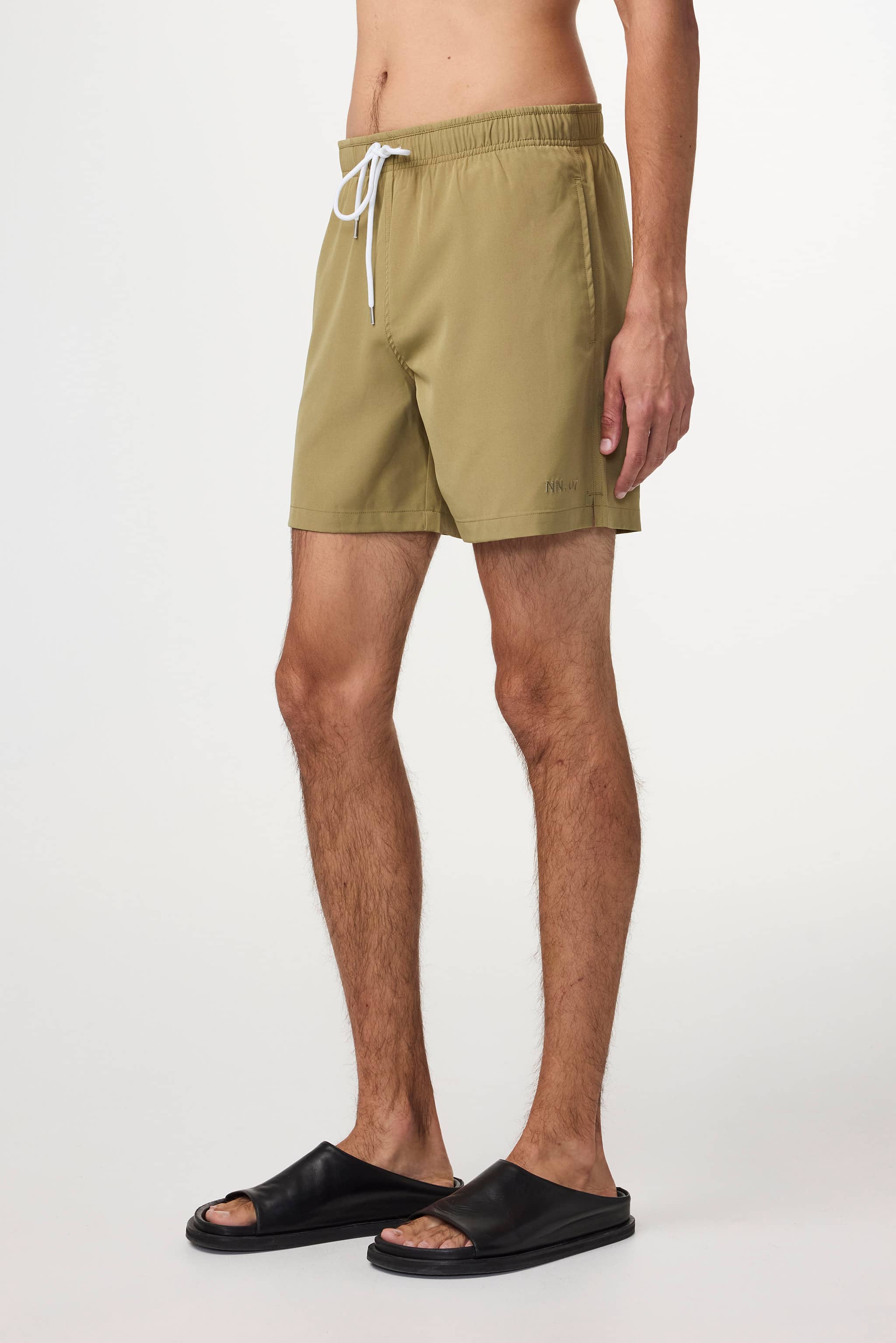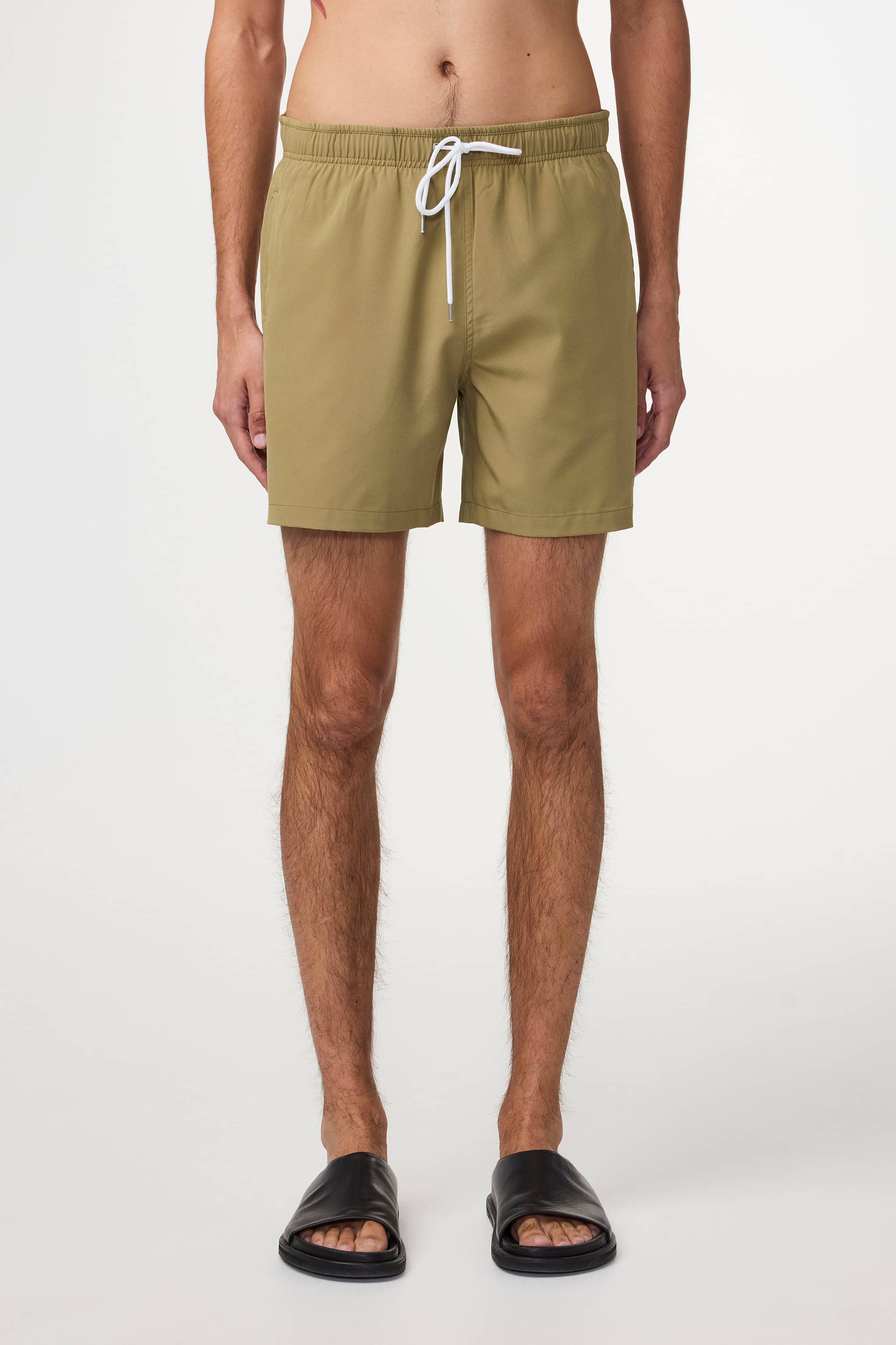 A pair of casual swim shorts made in a 120g/m2 crisp recycled polyester with a subtle stretch. Complete with an elastic waist, drawstring closure, and slanted side pockets.