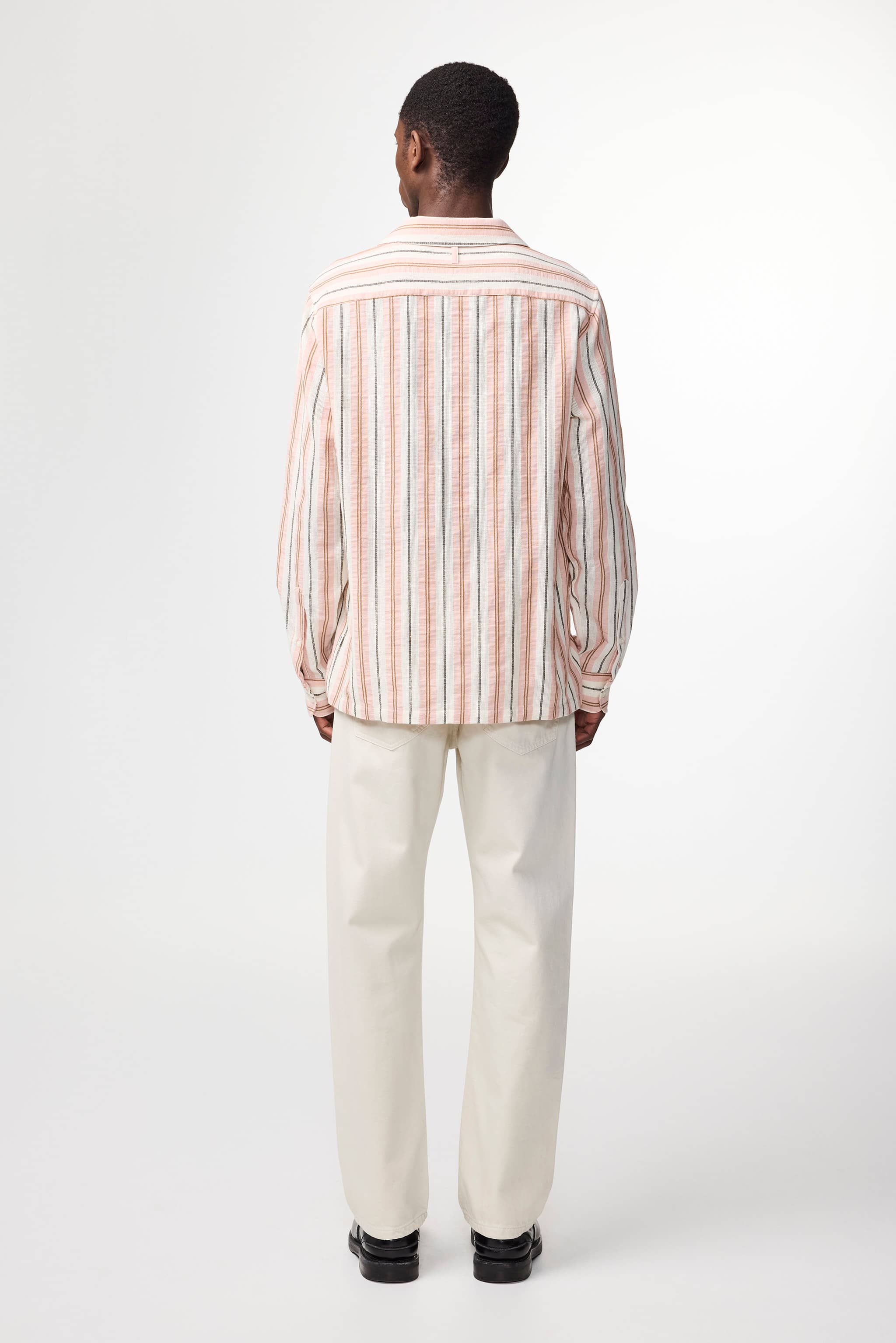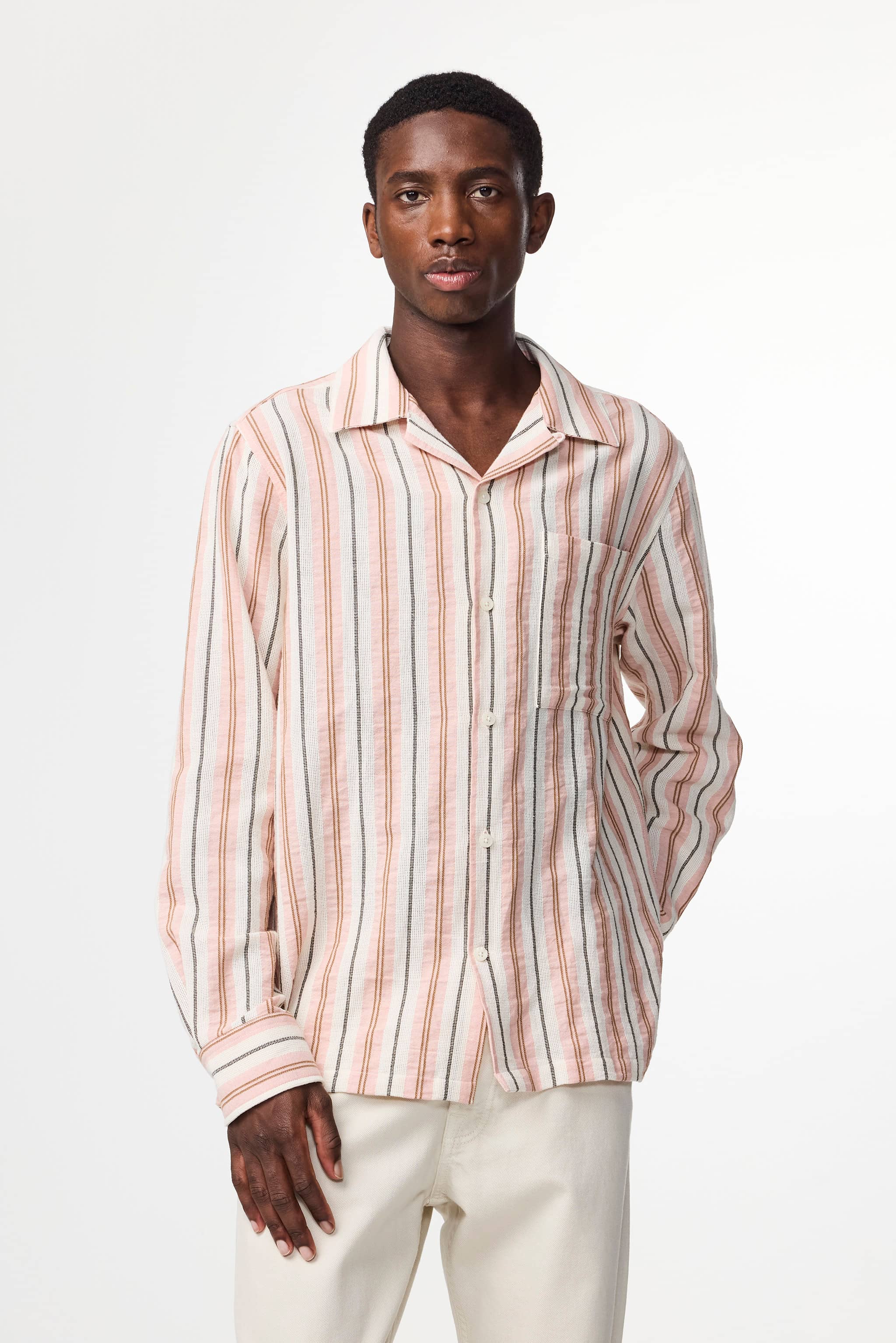 Open collar shirt crafted in a cotton and linen blend. Made in yarn dyed stripes with basket weave and finished with a single chest pocket.