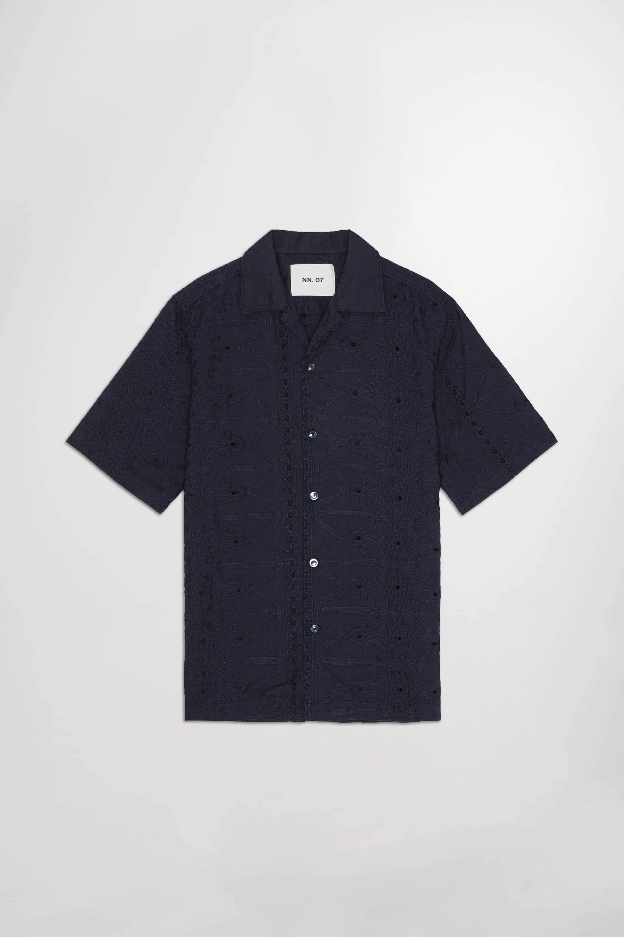 Shirt crafted in a soft cotton Embroidery Anglaise fabric, designed with an open collar.