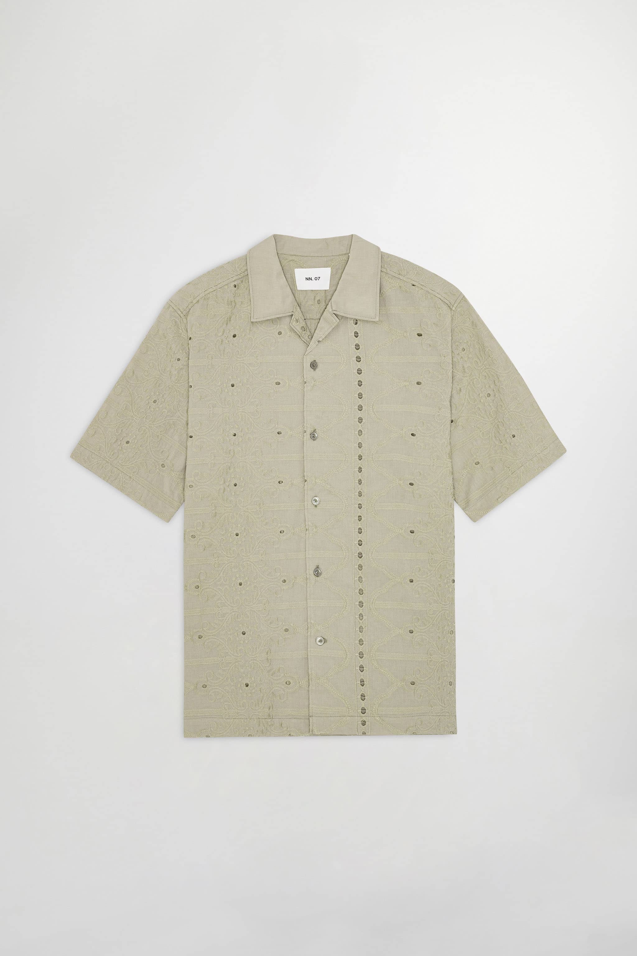 Shirt crafted in cotton, designed with an open collar and a single chest pocket complete with polyester buttons. It is in our own exclusive pattern in an embroidery anglaise.