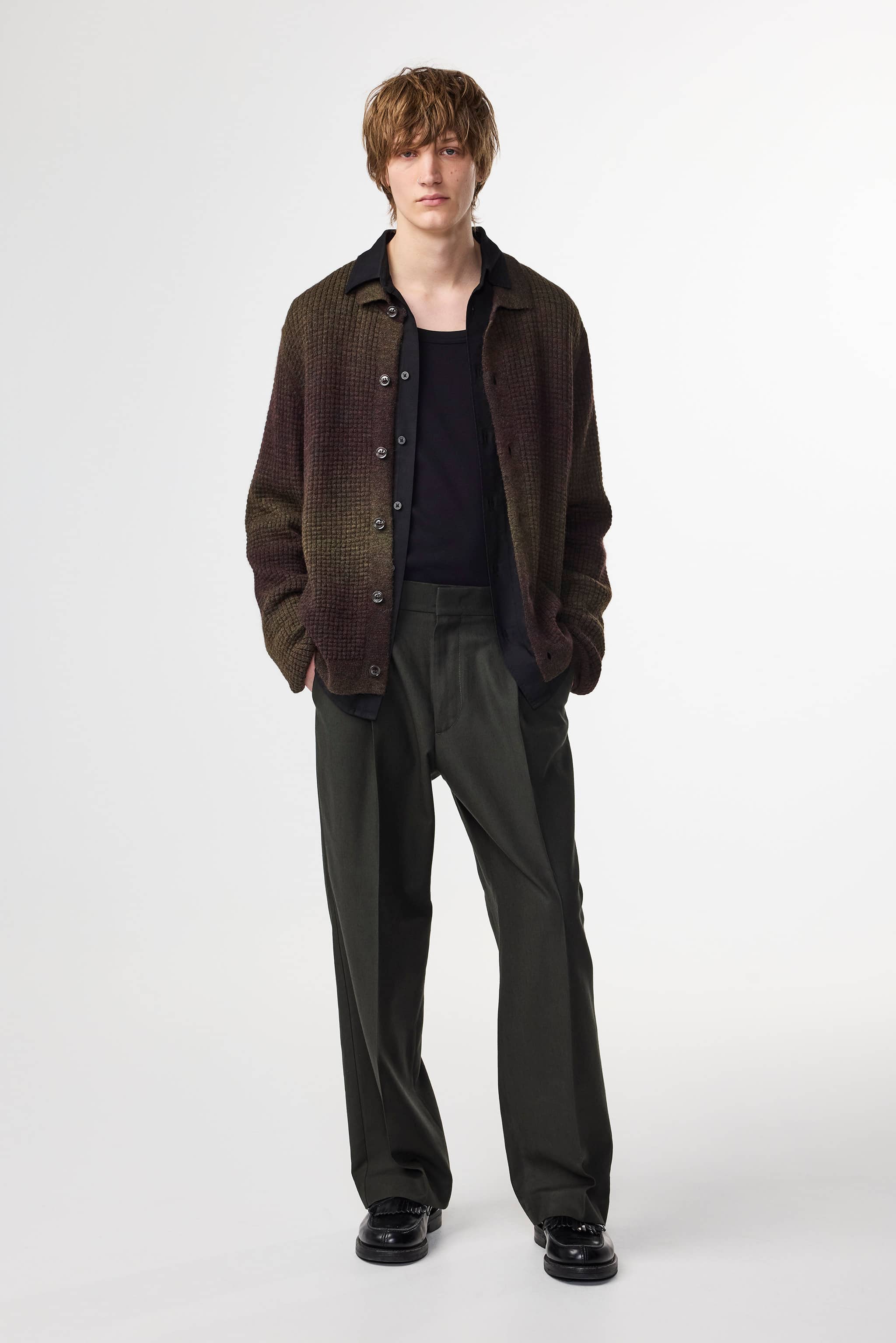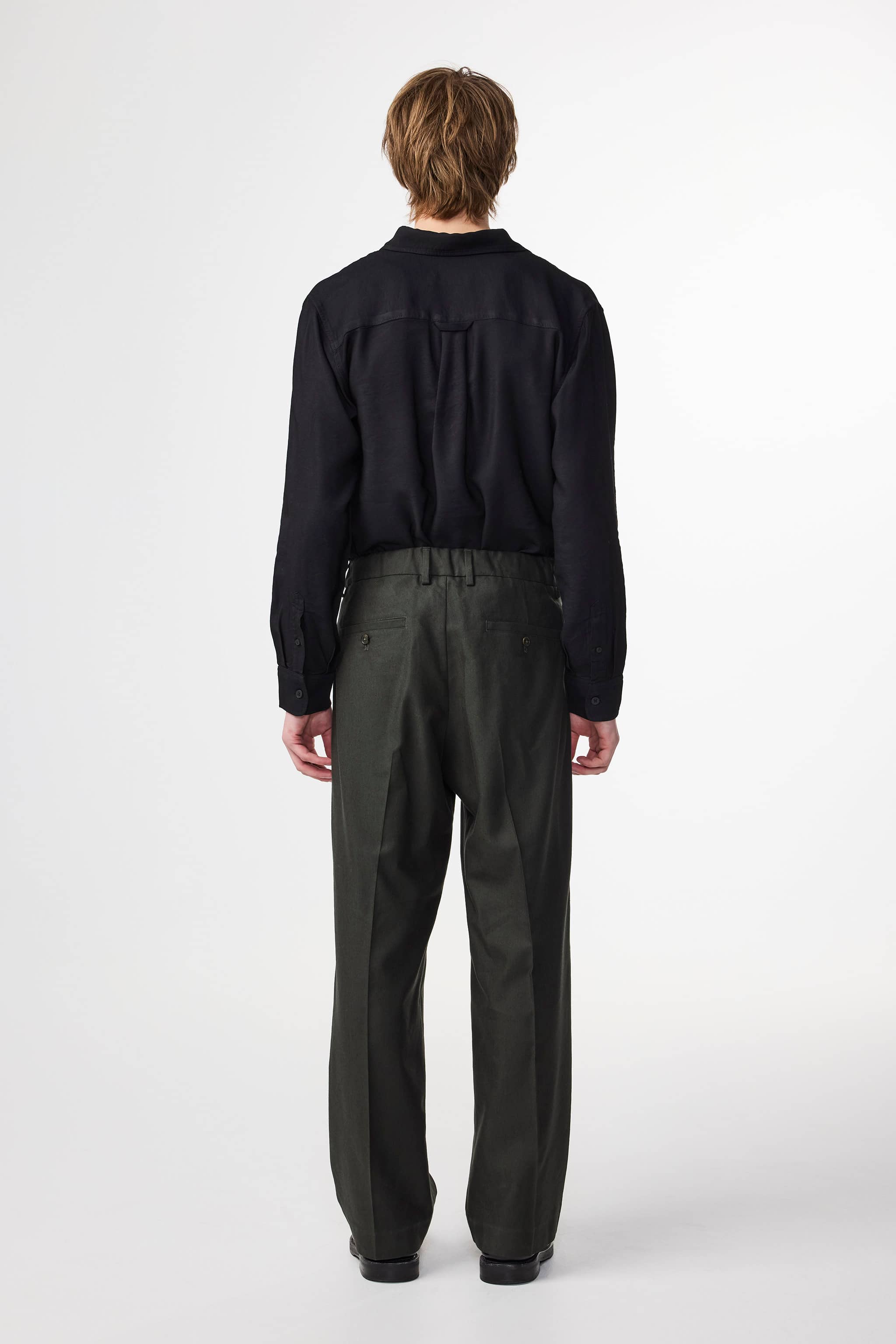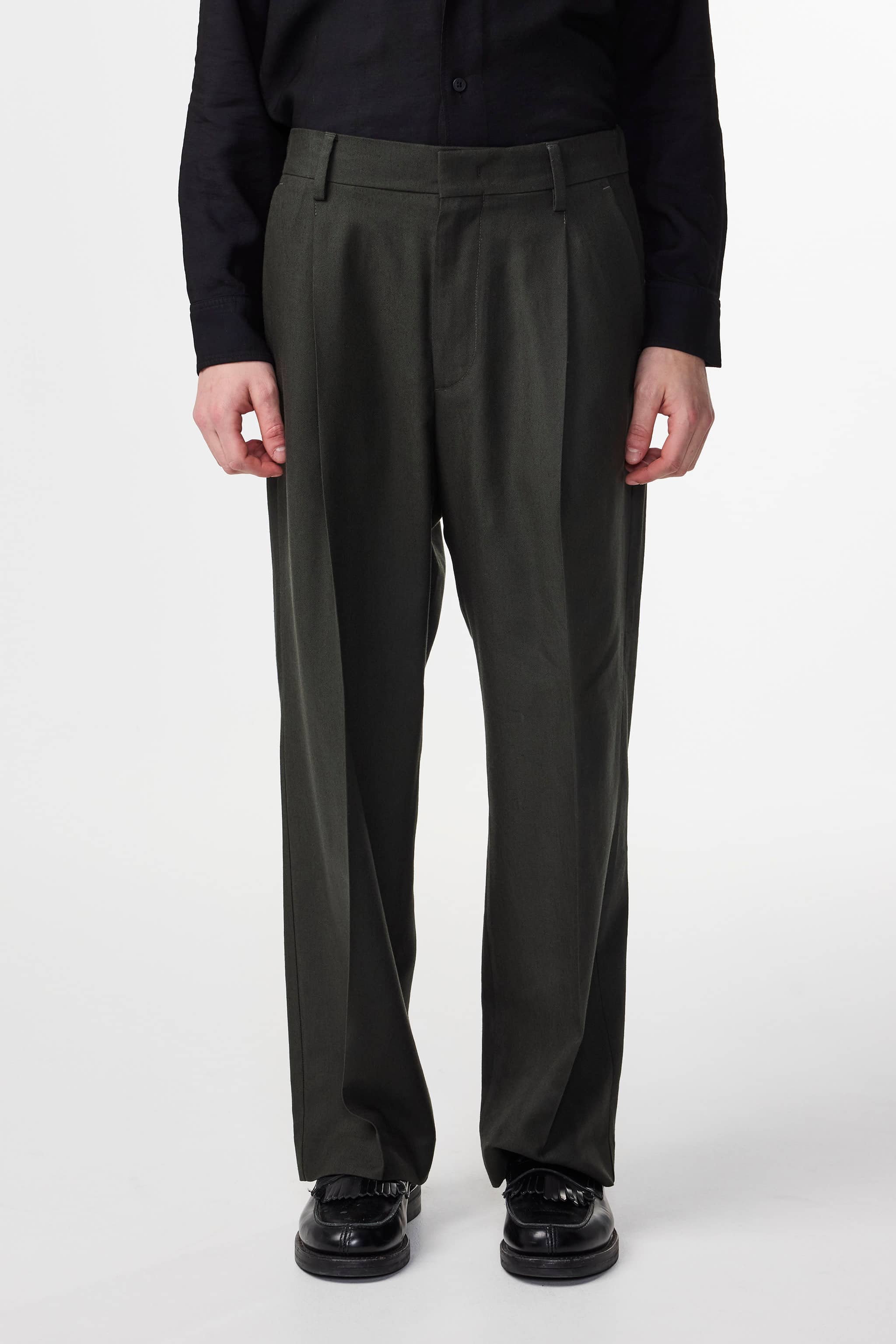 Relaxed-fit dress trousers with front pleats and a soft, drapey handfeel. Made from a 290 g/m² Panama weave fabric in a durable viscose and European linen blend. Treated with an enzyme wash and finished with back pockets and a hook-and-bar closure.