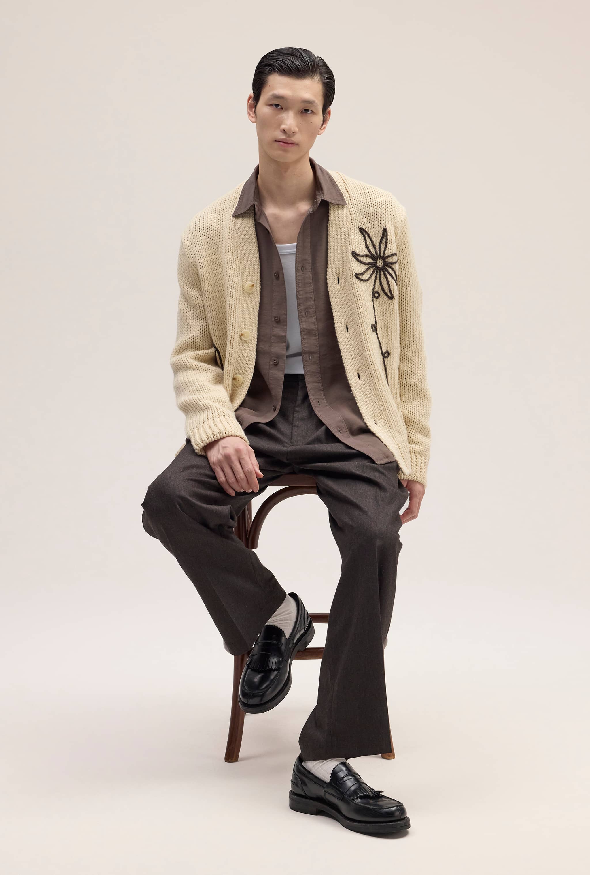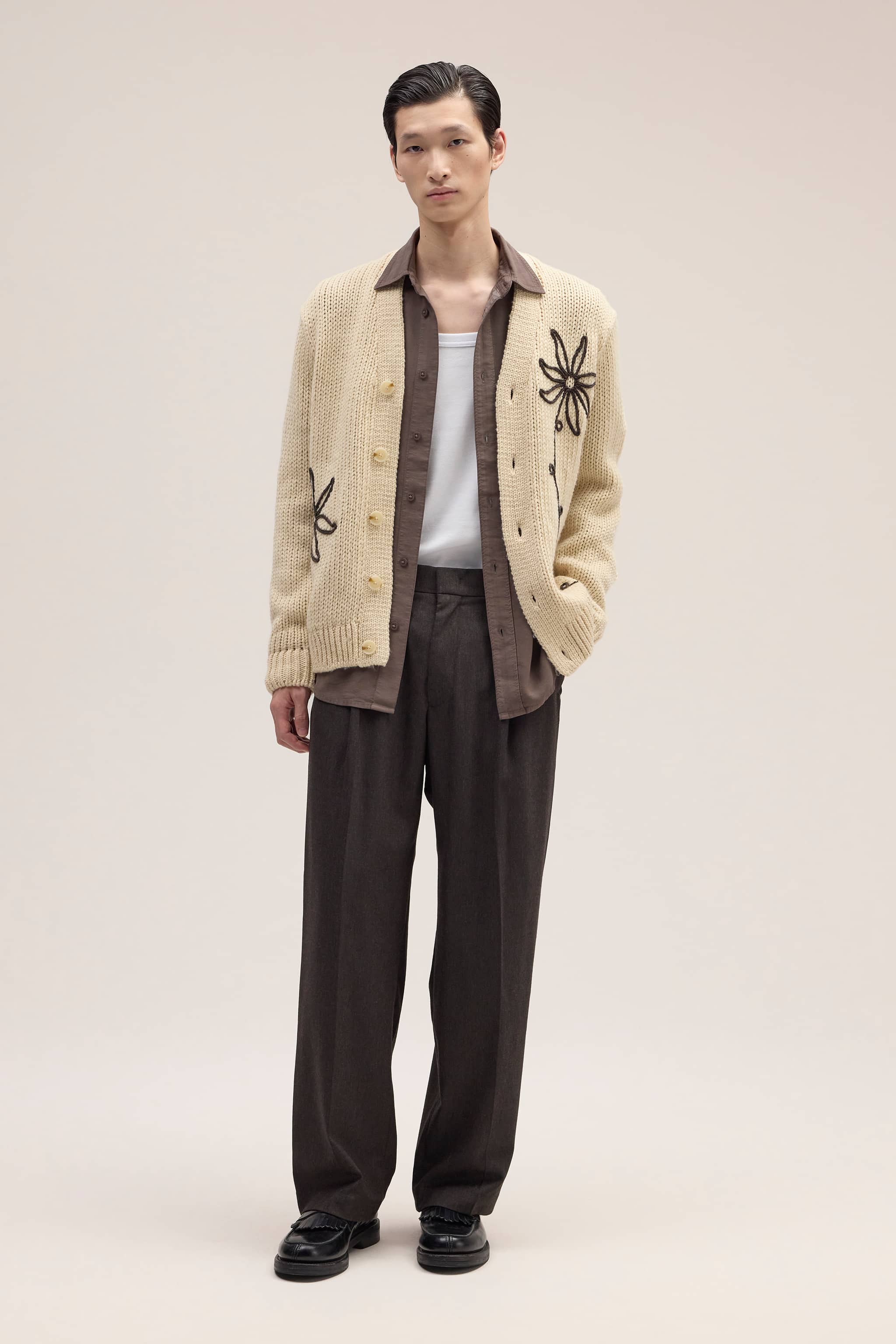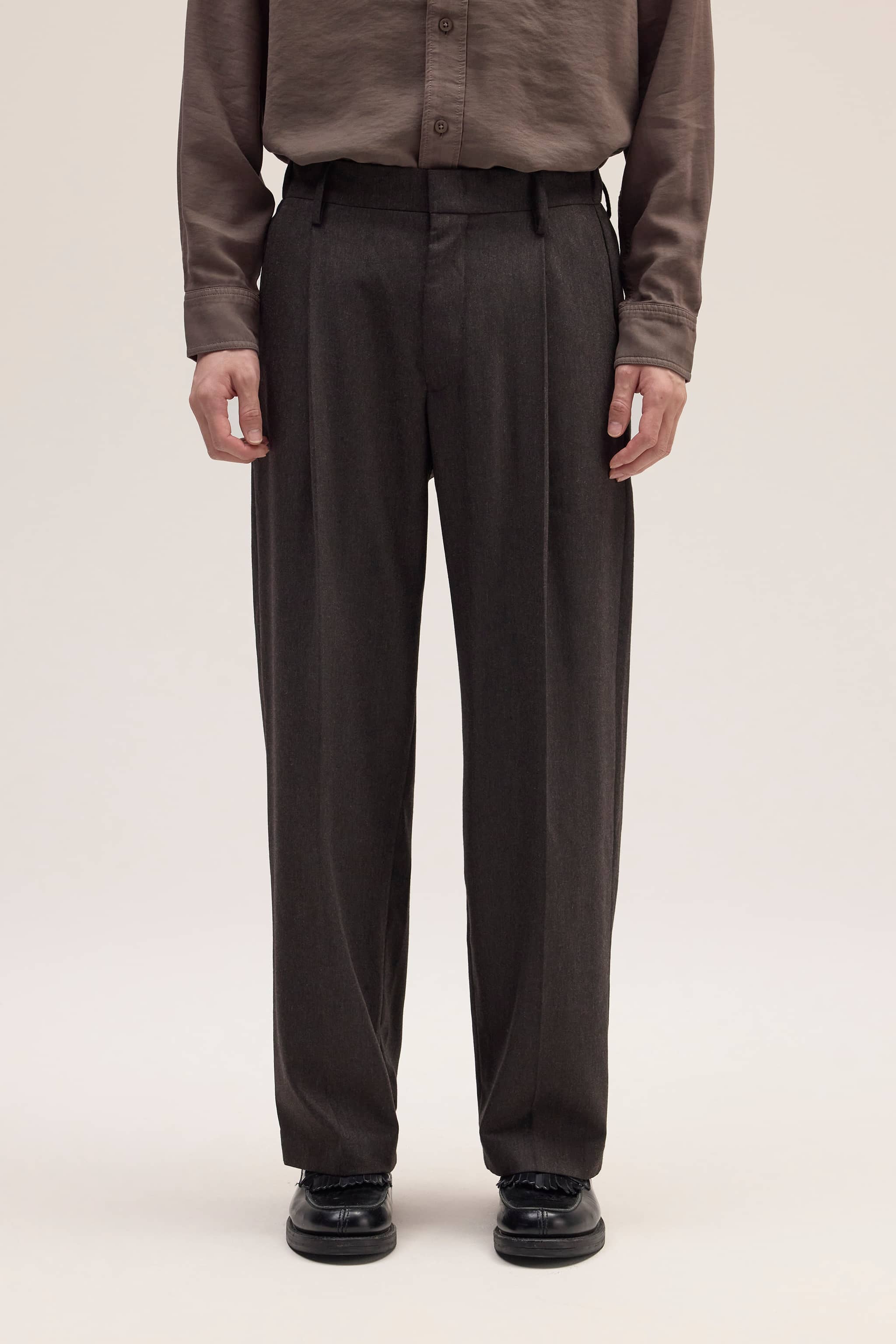 Relaxed-fit tailored pants crafted from a luxurious tweed-look fabric with a soft silk finish at 225 g/m². Designed with pleats at the front and a hook-and-bar closure for a refined look.