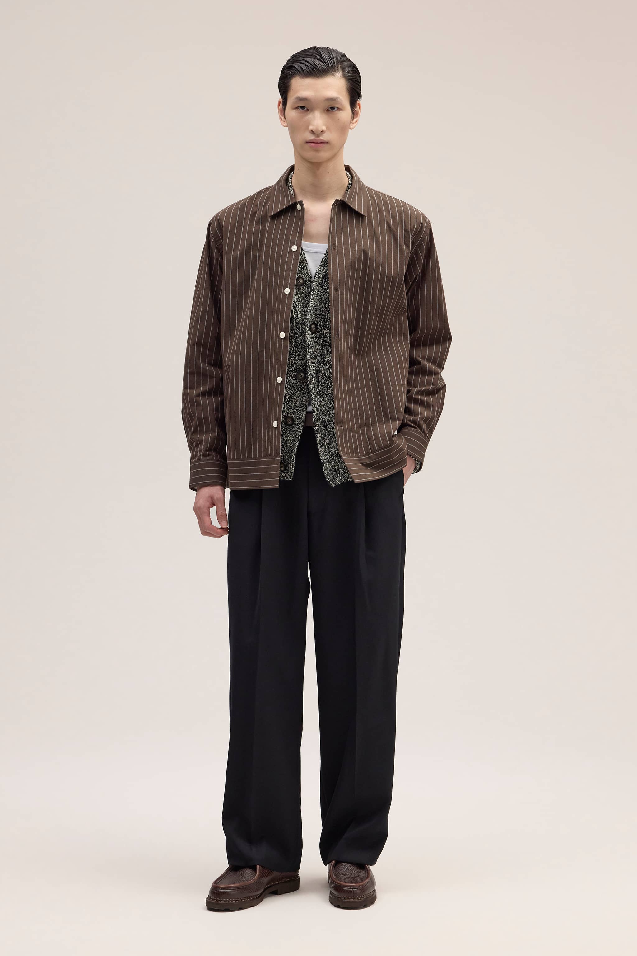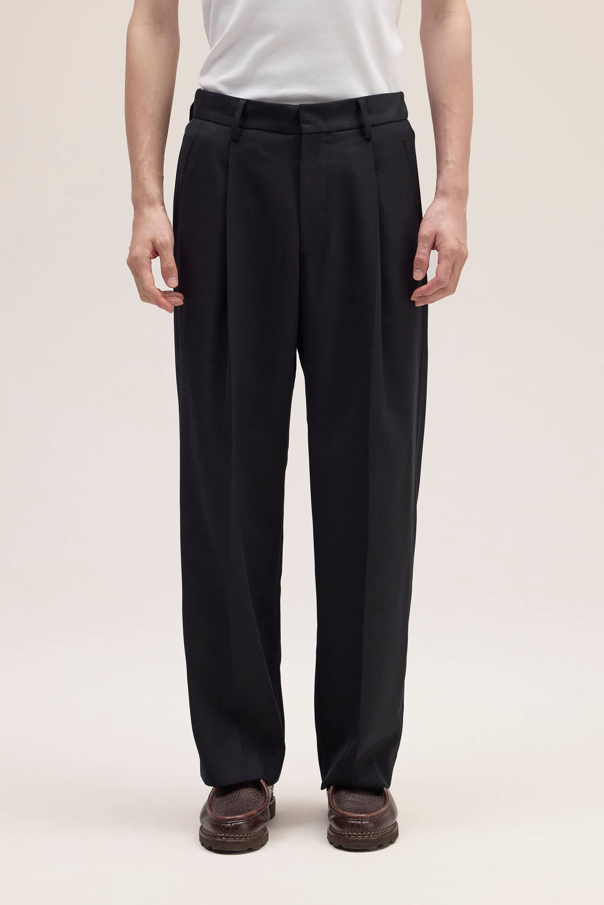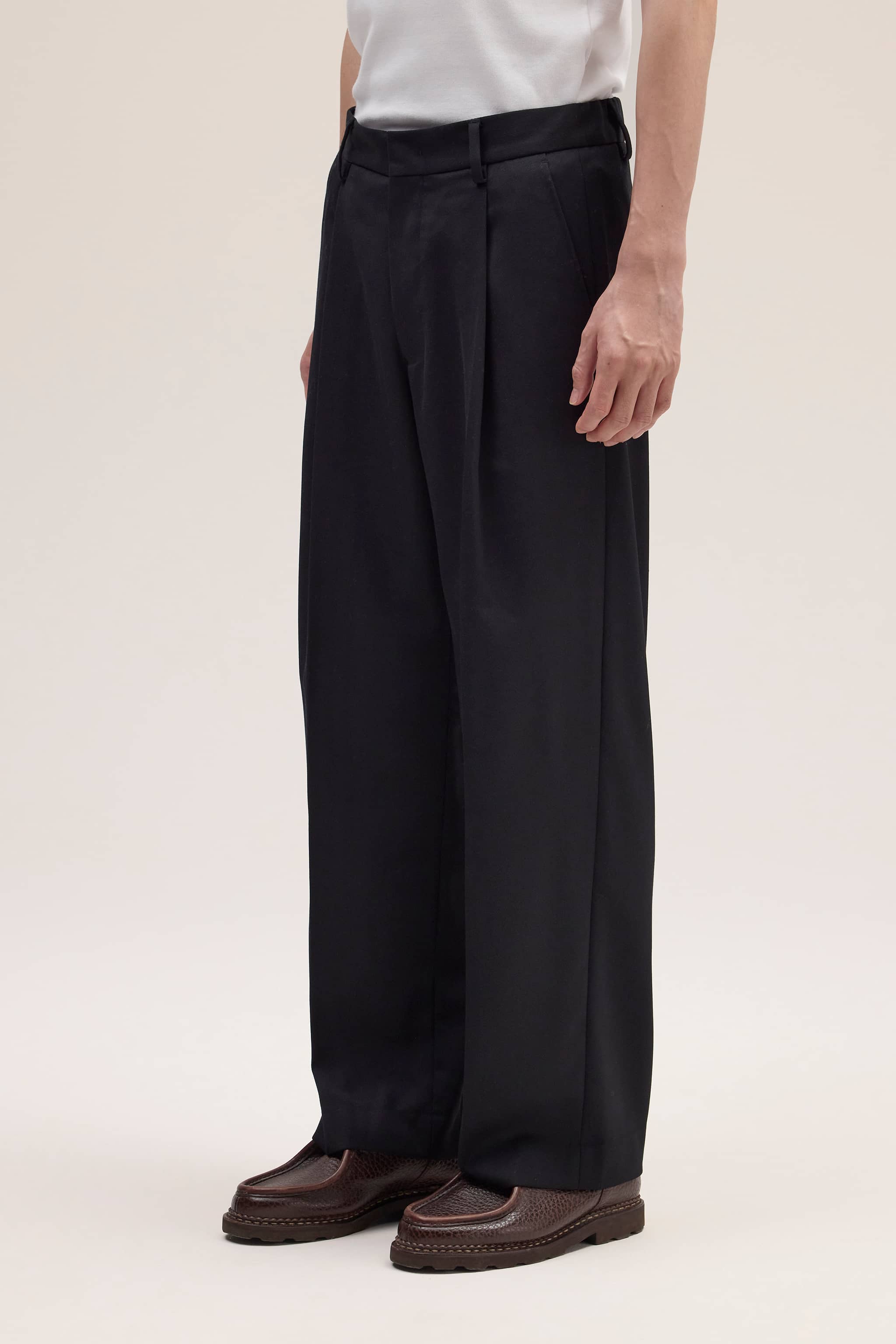 Relaxed-fit tailored trousers crafted from a heavy 410 g/m², refined wool blend twill. Designed with an elasticated waistband at the back for added comfort and front pleats for an elegant drape.