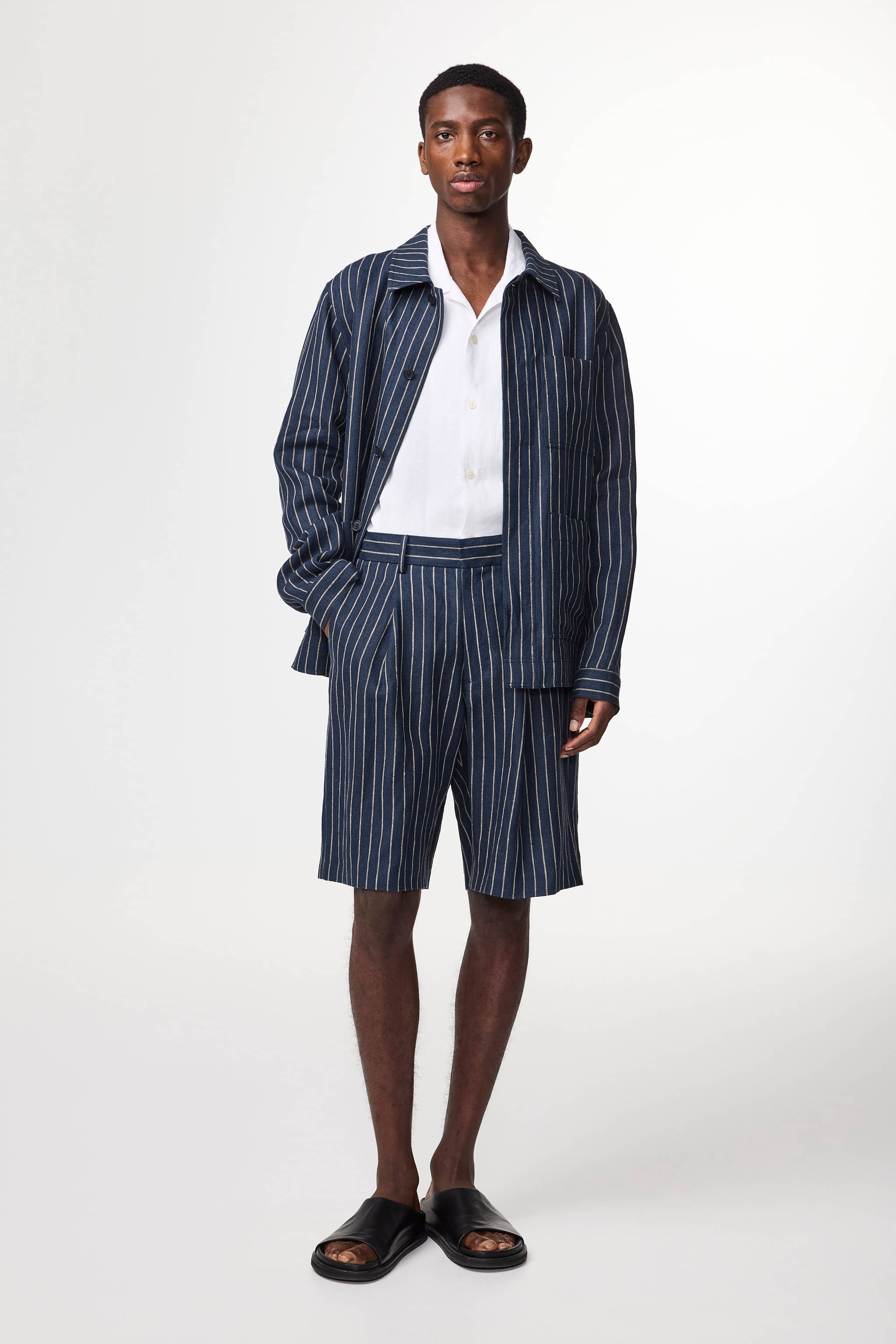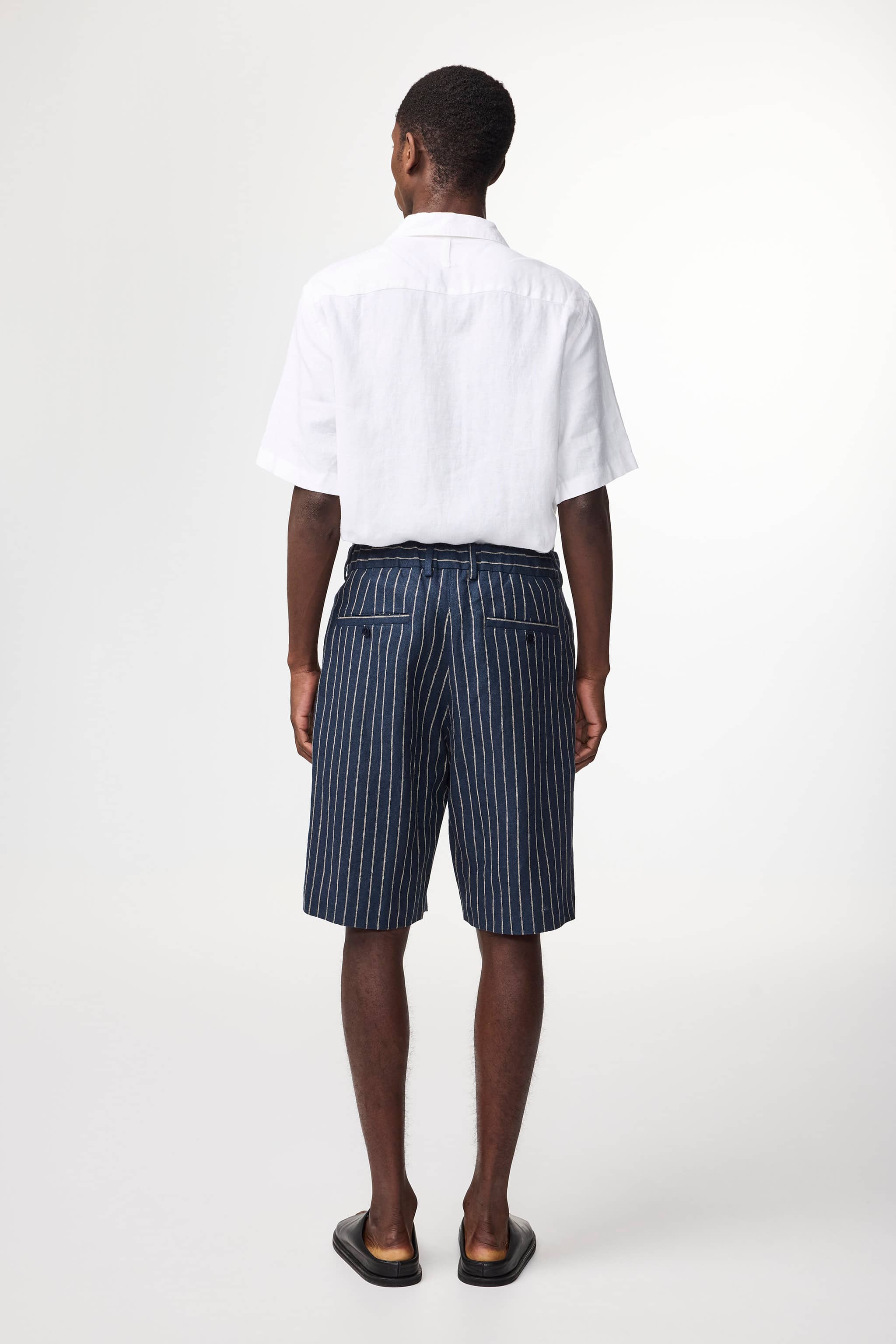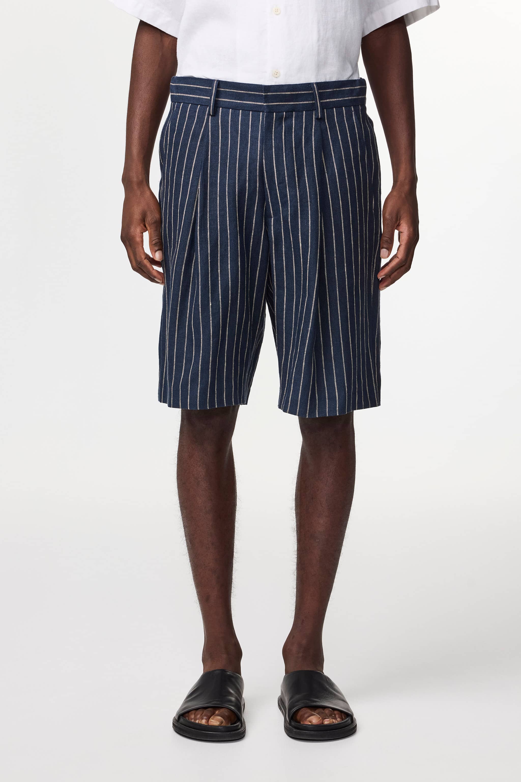 Pleated dress shorts made in a relaxed fit and crafted from a yarn-dyed striped 260 g/m2 European linen fabric. Designed with an elasticised waistband and hook and bar closure for a comfortable fit.