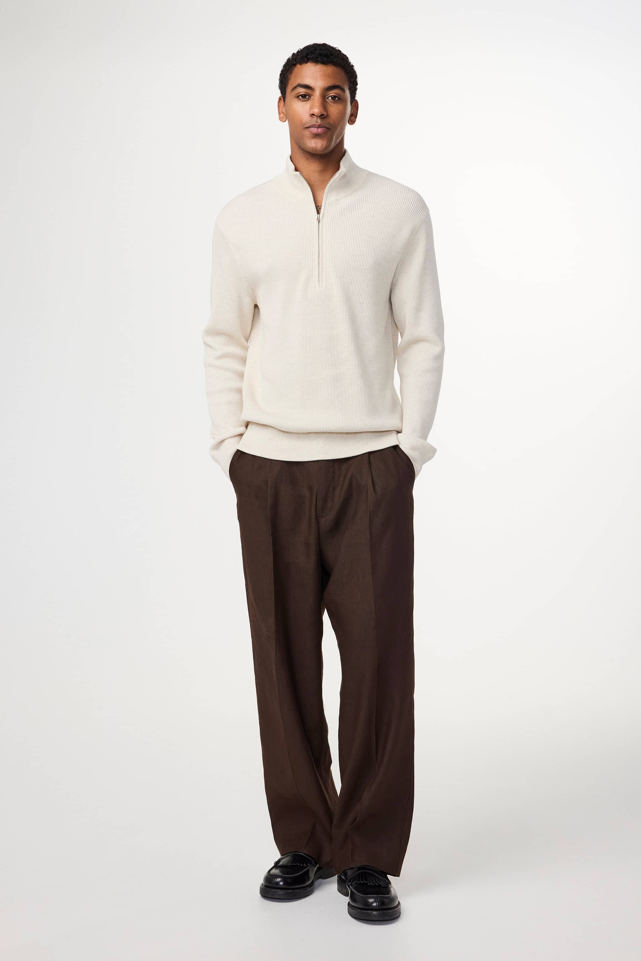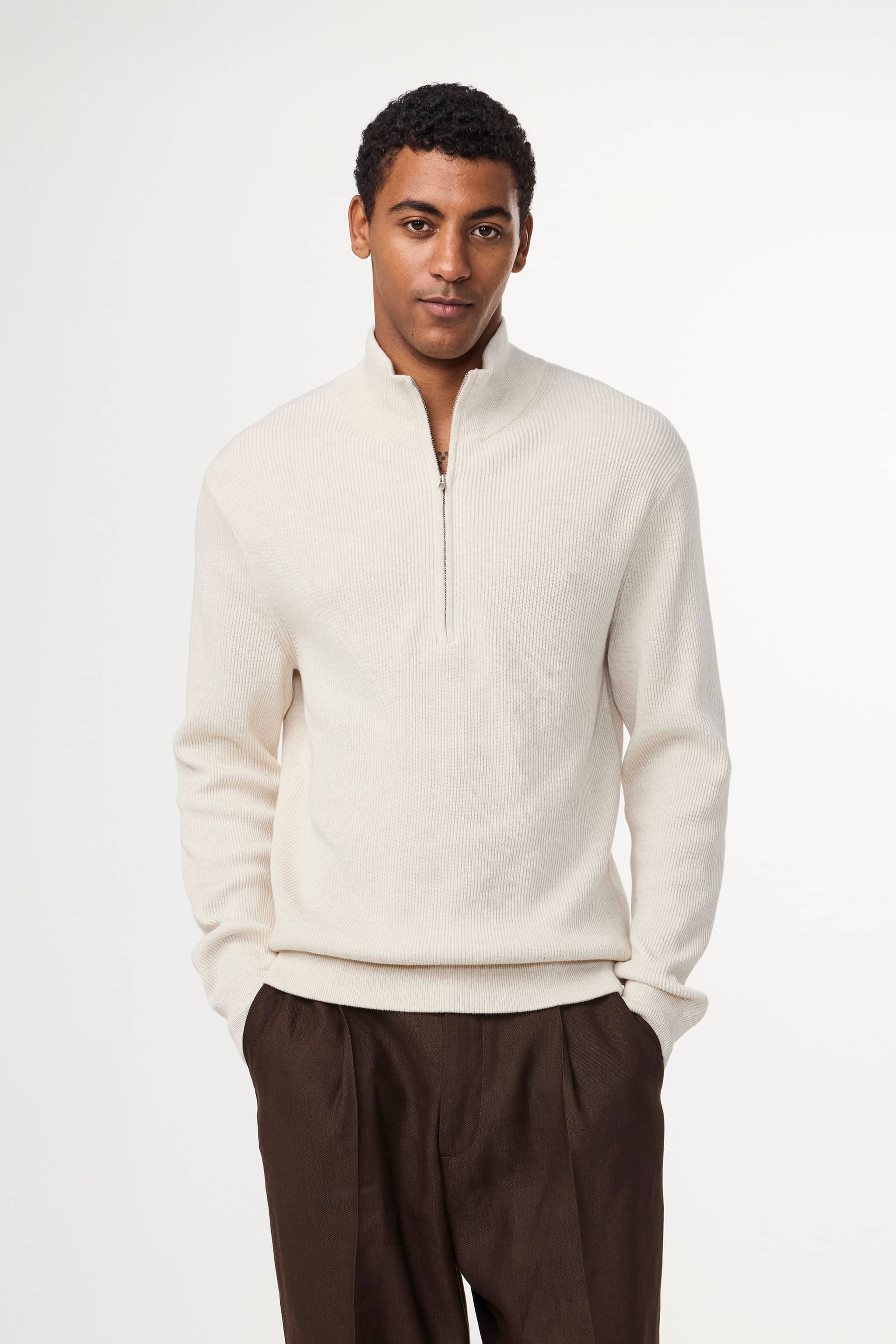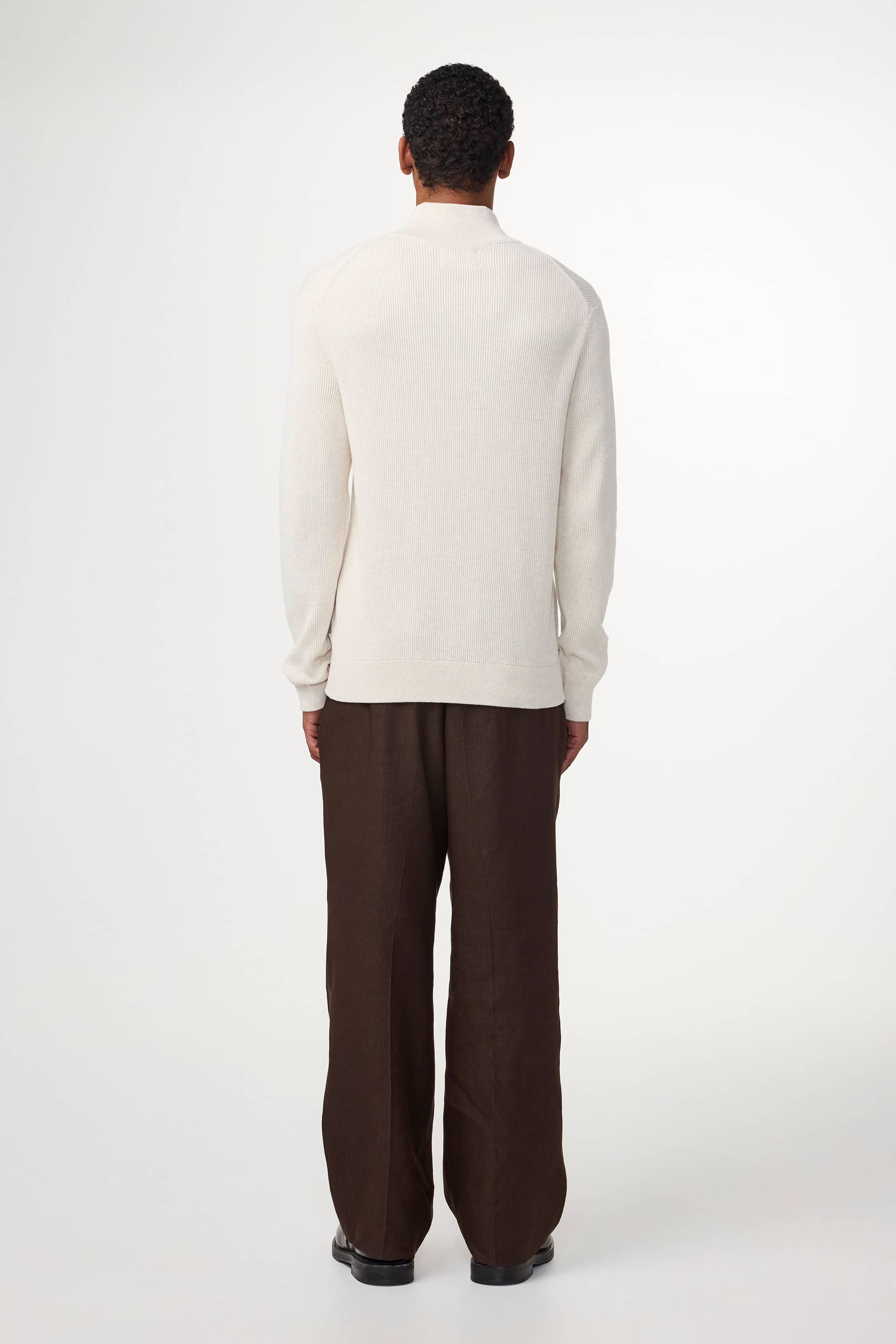 Ribbed zip mock neck sweater crafted in an organic cotton yarn. Features a rib along the bottom and cuff.