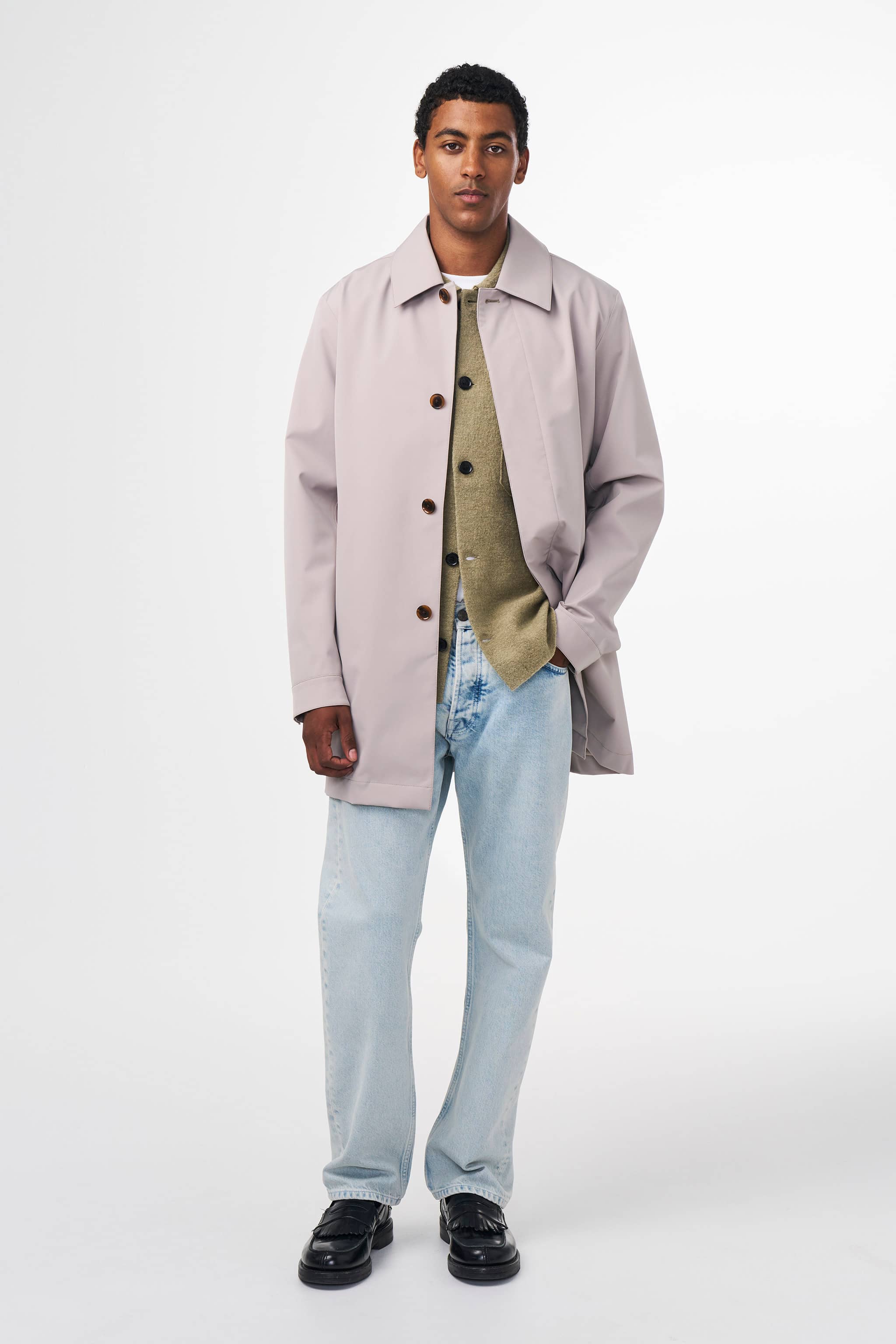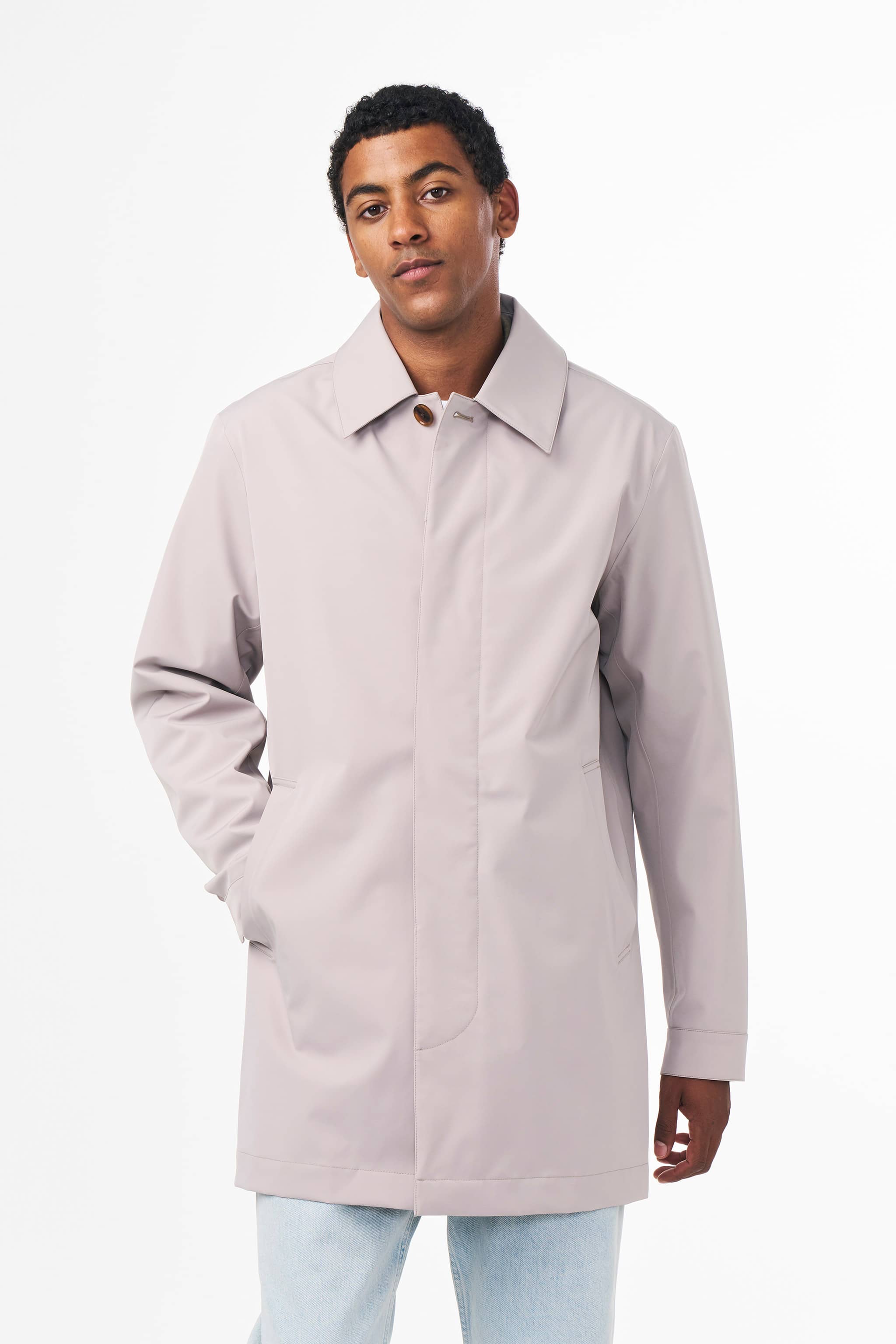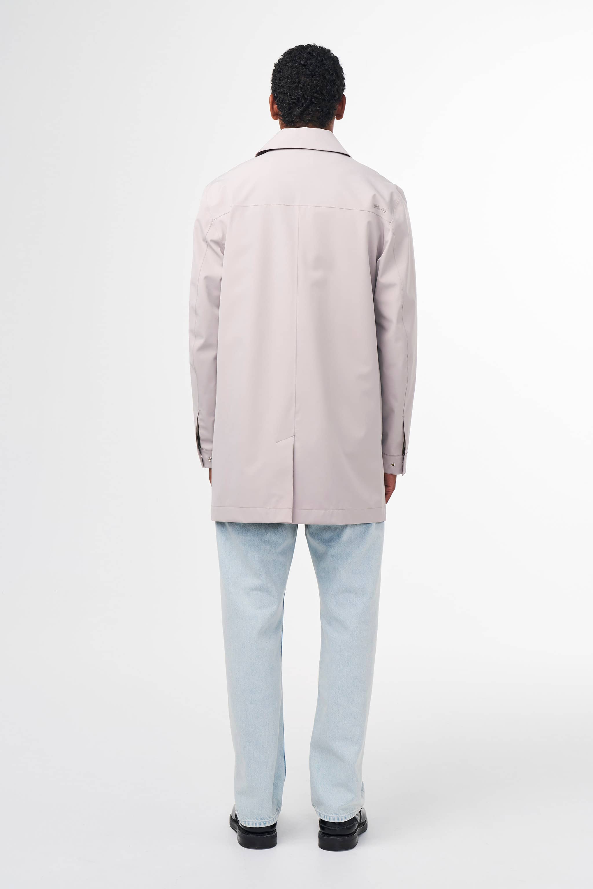 A mid-length, lightweight, transseasonal coat made from breathable, waterproof technical fabric. The coat comes fully lined with a 2-layer stretch polyester PU laminate, including a hidden button placket, logo mesh air vents, and two front pockets and finished with one inside zip chest pocket and two inside patch pockets.