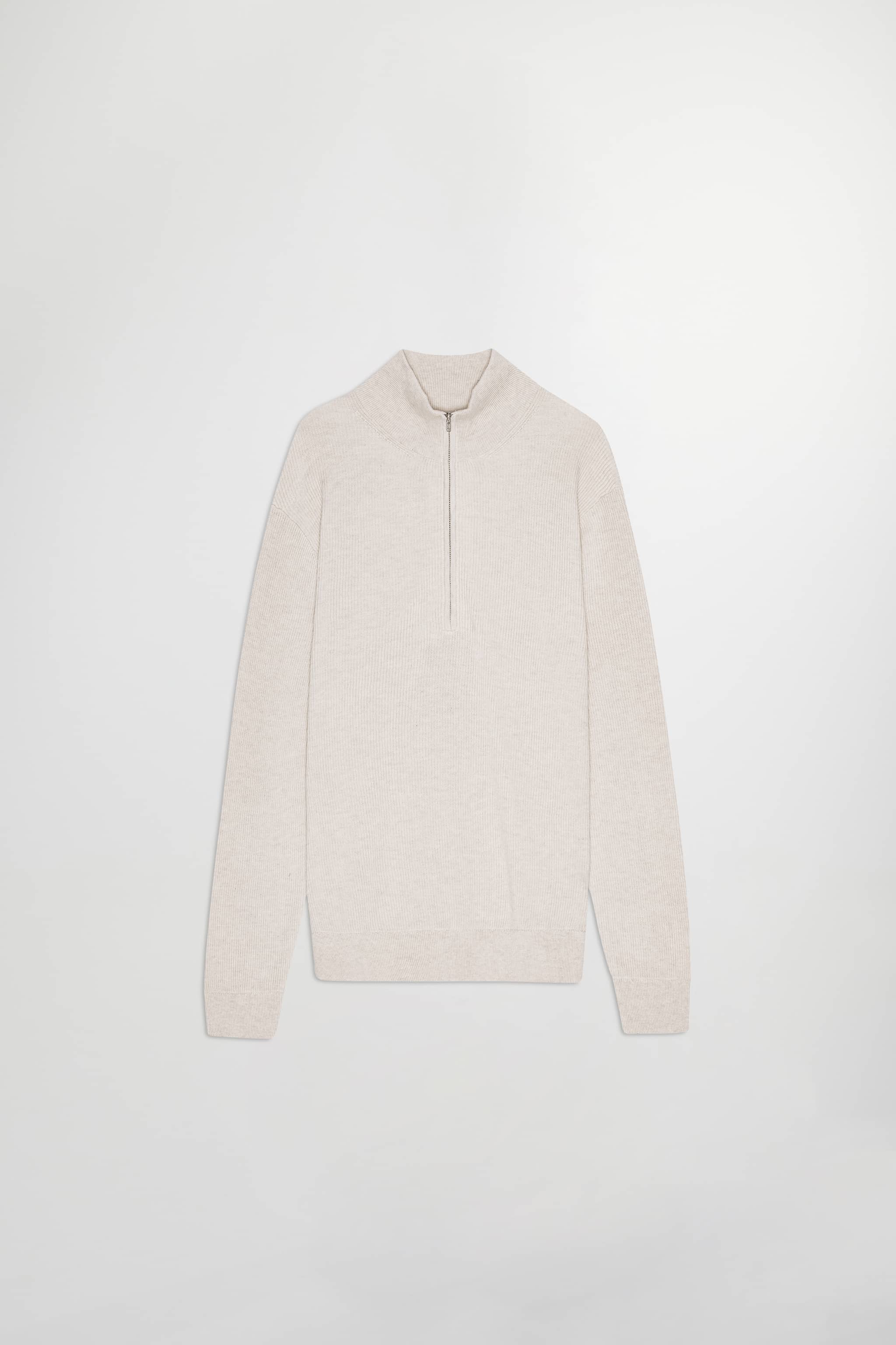 Ribbed zip mock neck sweater crafted in an organic cotton yarn.