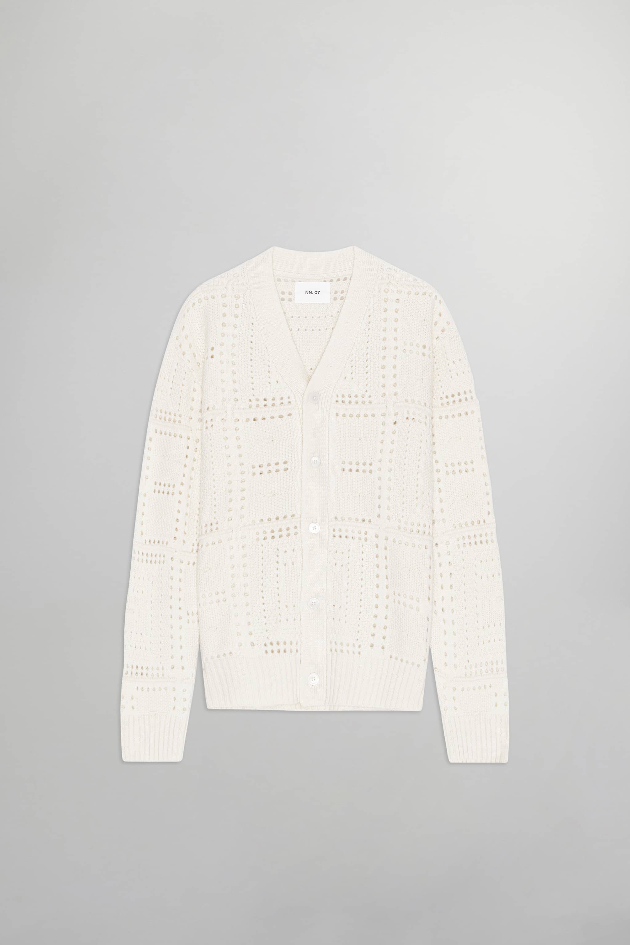 Knitted cardigan crafted in super fine organic cotton yarn with a graphic pointelle stitch pattern on the surface, finished with Mother-of-Pearl buttons.