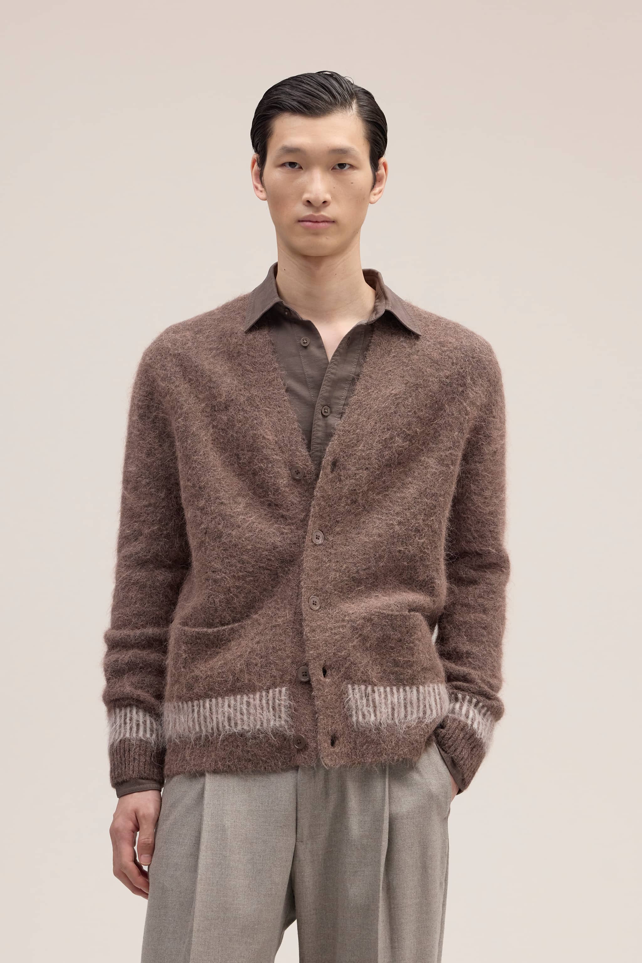 Ultra soft v-neck cardigan crafted in a regular fit from a hairy alpaca blend.