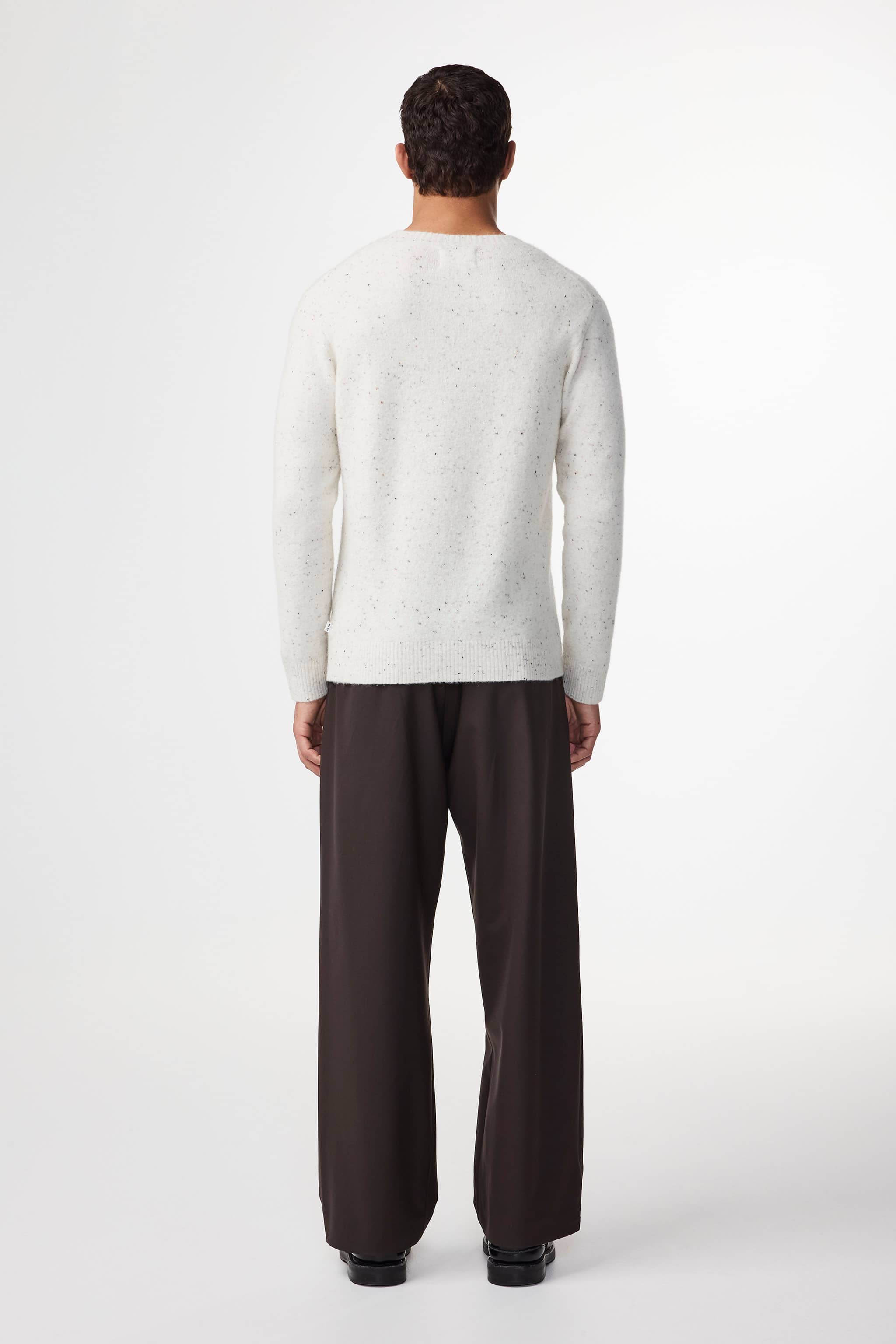 Classic lightweight pullover crafted from a soft Italian alpaca wool blend. Designed with dropped shoulders, subtle fashioning details, a crew neckline, and a wide ribbed hem for a clean finish.