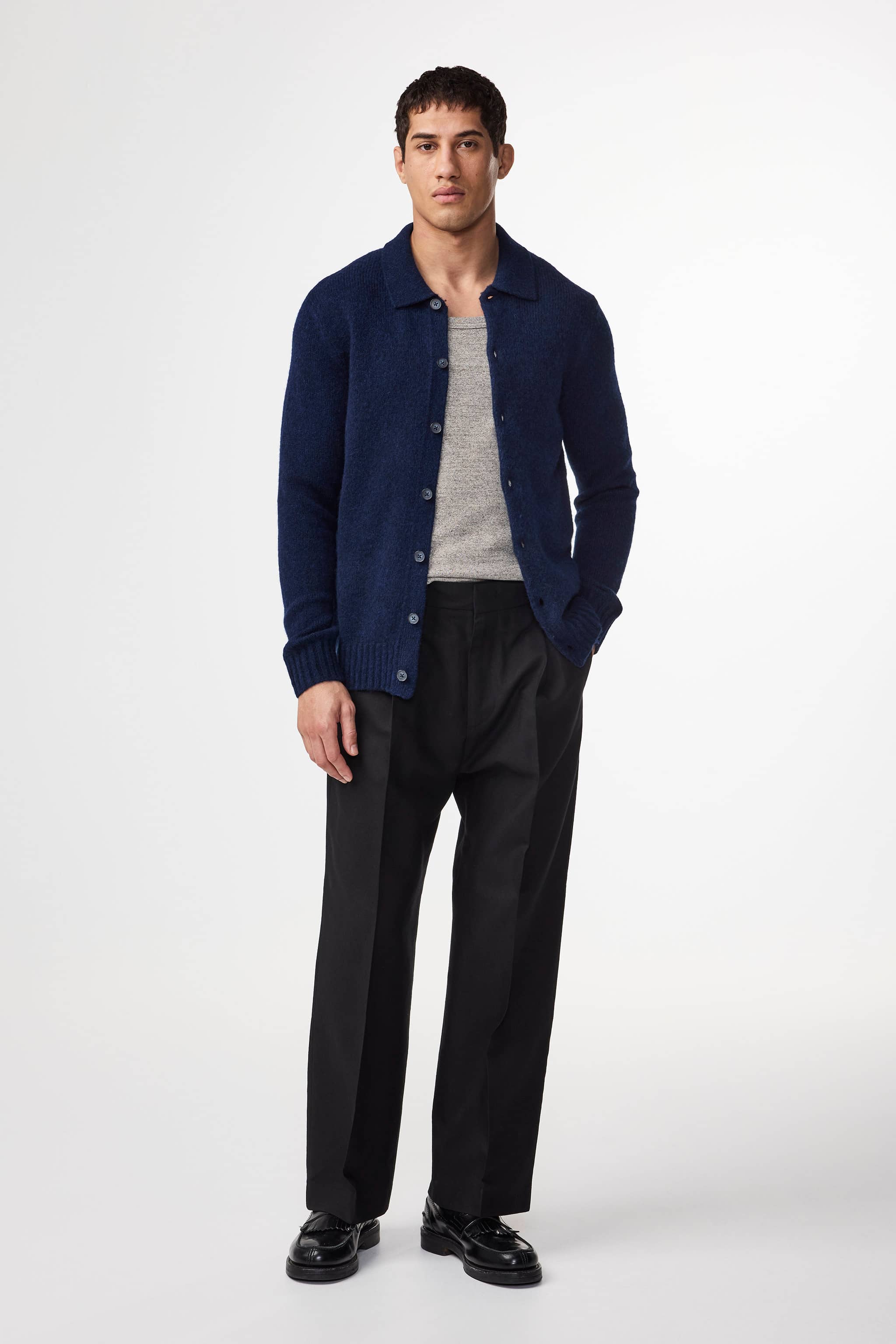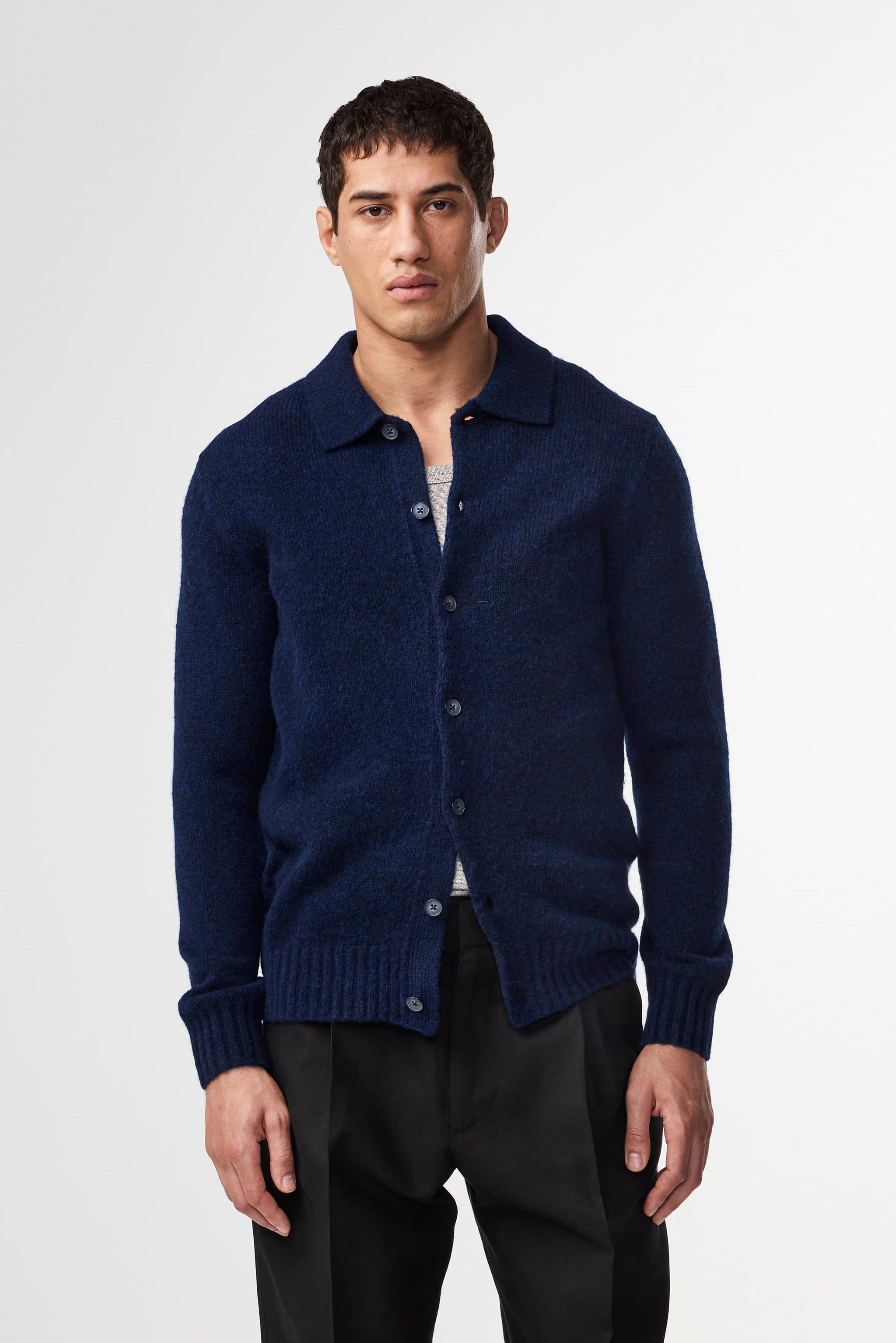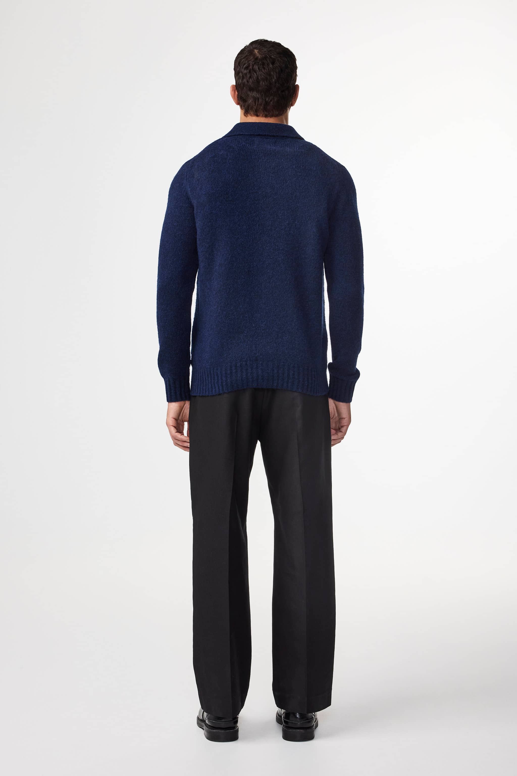 Fluffy polo cardigan crafted in a soft Italian merino wool blend. Features a drop-back shoulder with subtle fashion marks and a wide rib. Finished with a soft and fluffy handfeel.