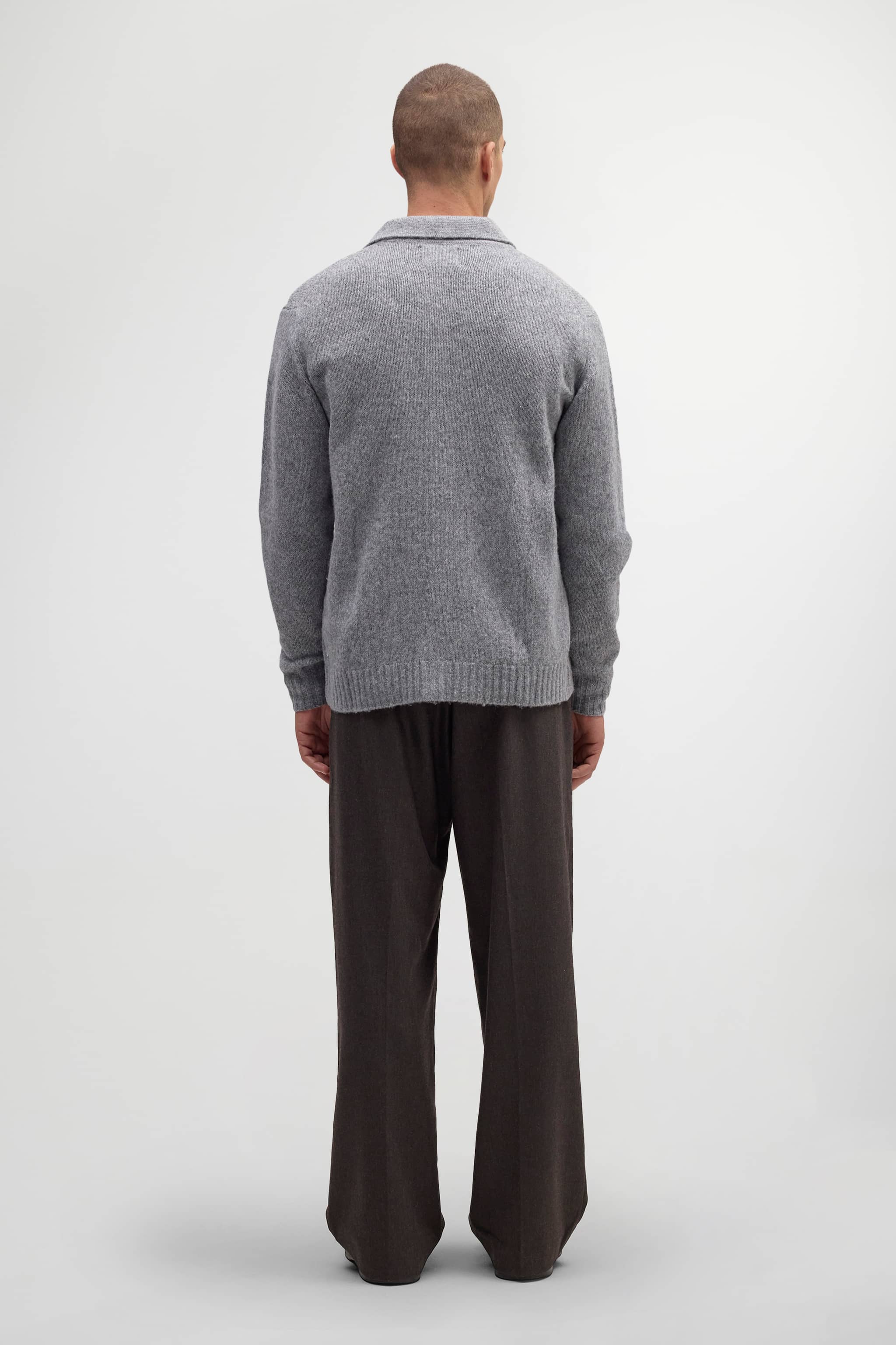 Exclusively available online through Mr. Porter and NN.07. Fluffy polo cardigan crafted in a soft Italian merino wool blend. Features a drop-back shoulder with subtle fashion marks and a wide rib. Finished with a soft and fluffy handfeel.