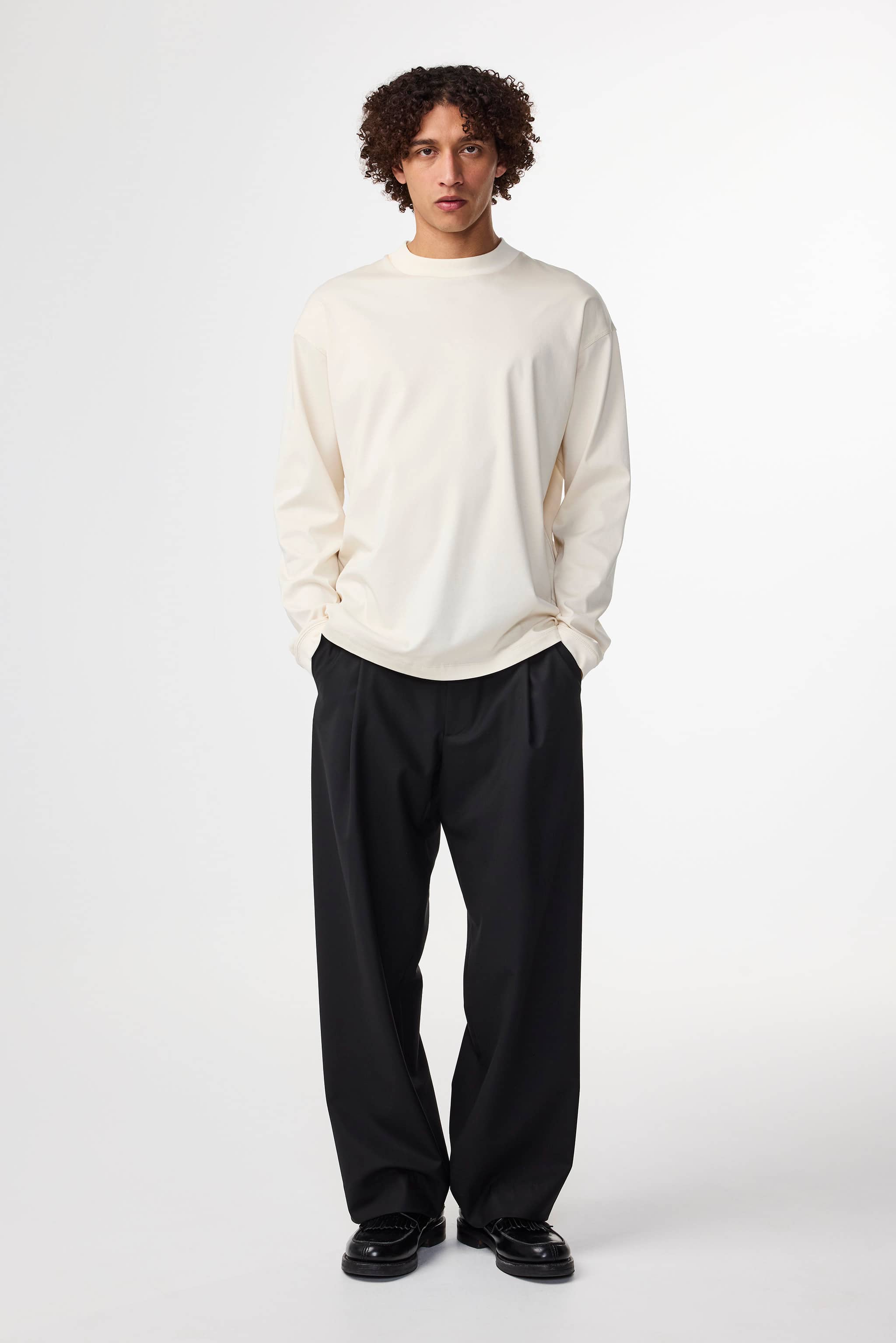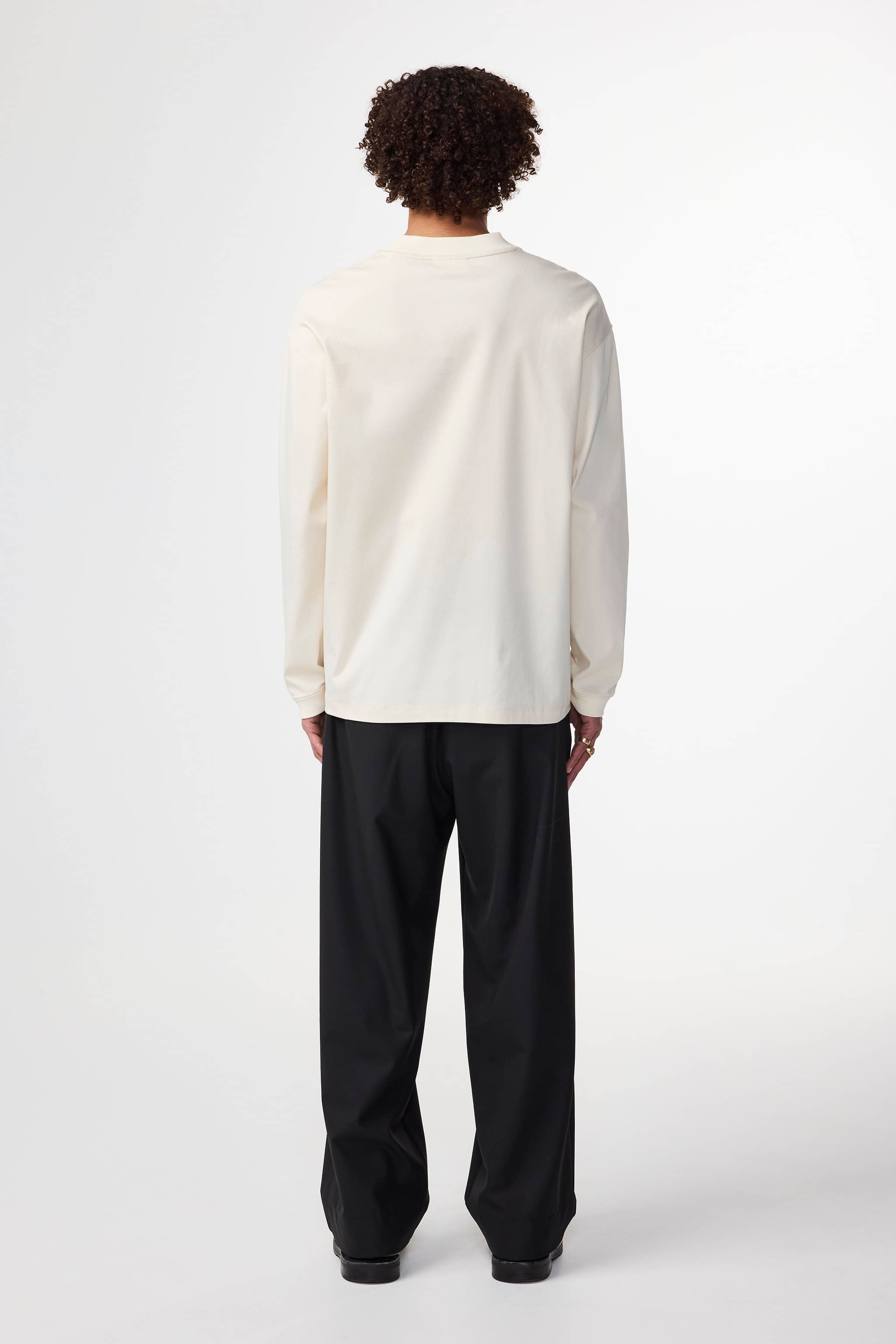 Soft long sleeved tee crafted in organic mercerized cotton. Finished with 1x1 neck rib and cuffs topped with twin-needle stitching details.