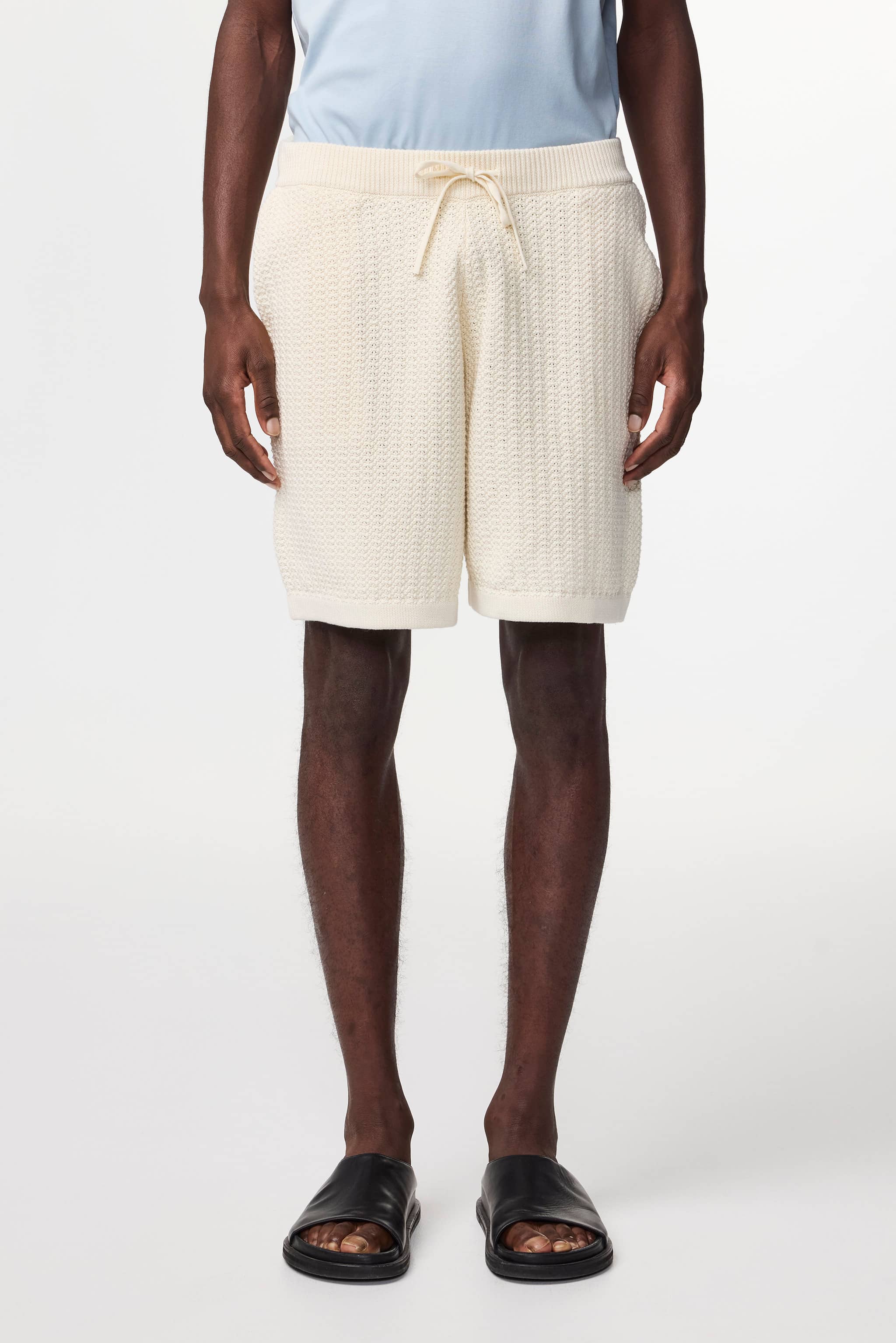 Shorts crafted from textured organic cotton yarn with drawstrings and a single back pocket.