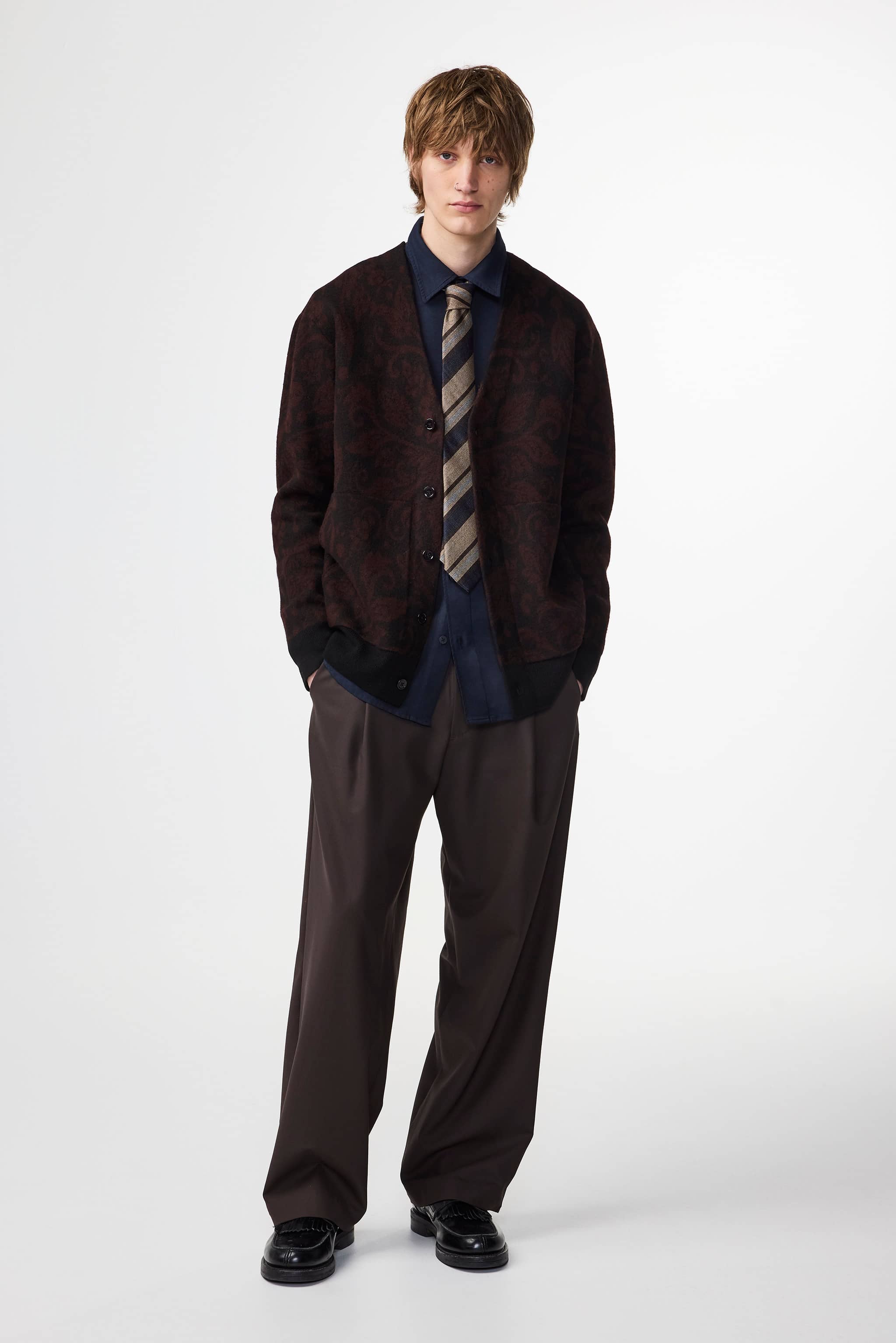 V-neck cardigan crafted from responsibly sourced boiled wool with a jacquard pattern. Designed with a fold-back placket for a clean finish.