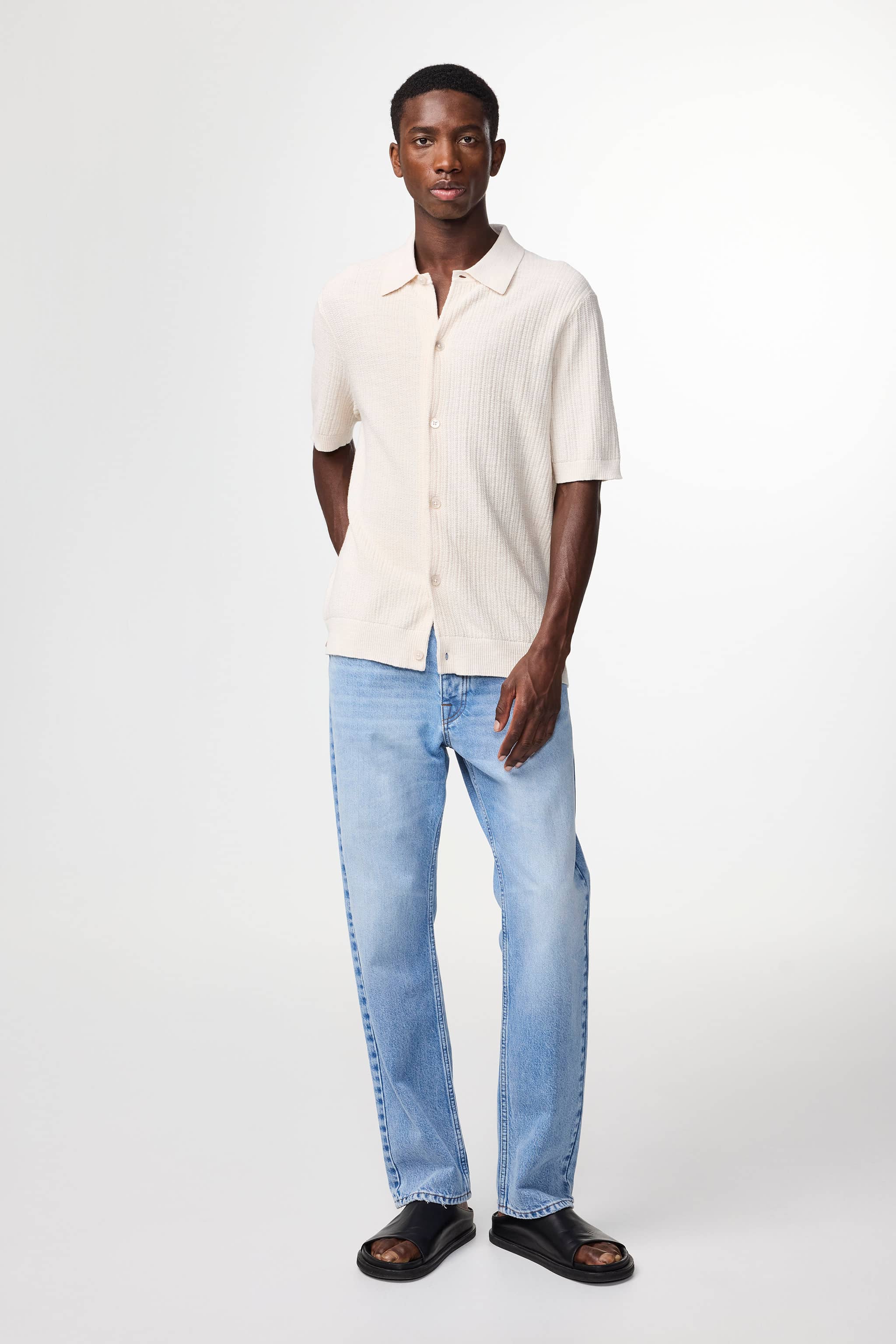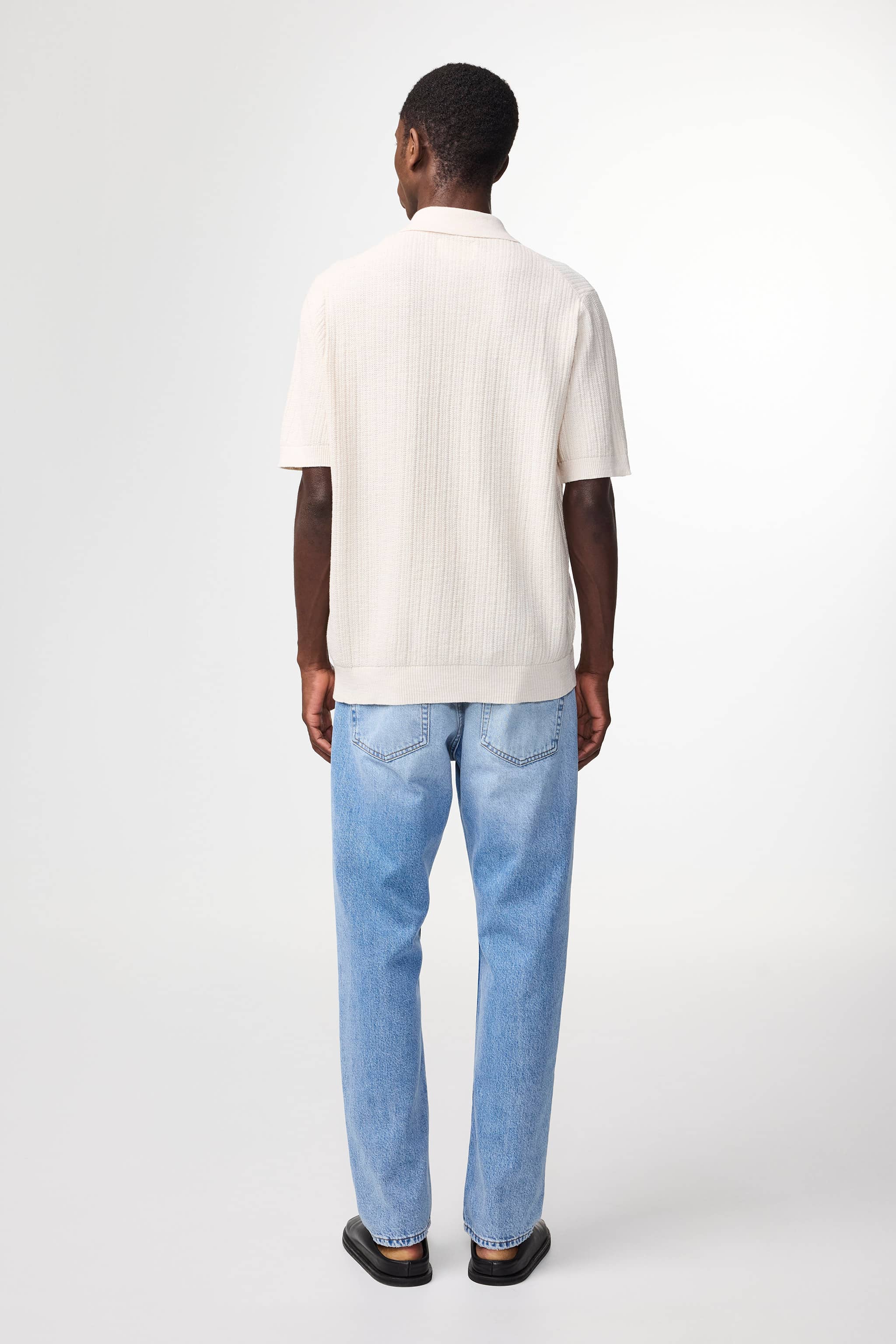 Open-collar polo cardigan crafted in organic cotton with an intricate bouclé yarn and textured rib stitch. Features center front buttons with shell detailing and rib-knitted edges throughout. The soft, breathable fabric offers a crisp yet comfortable handfeel perfect for layering.