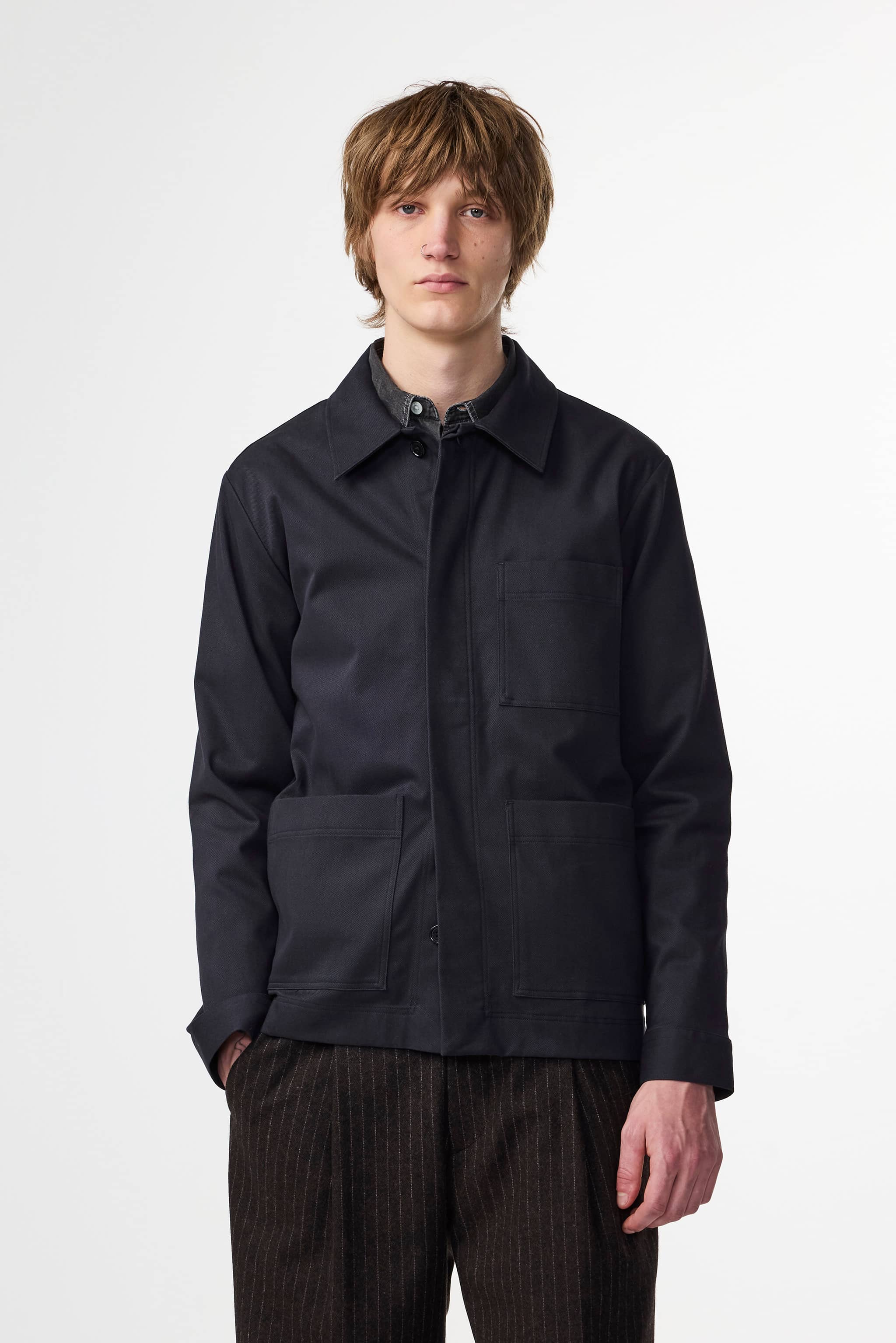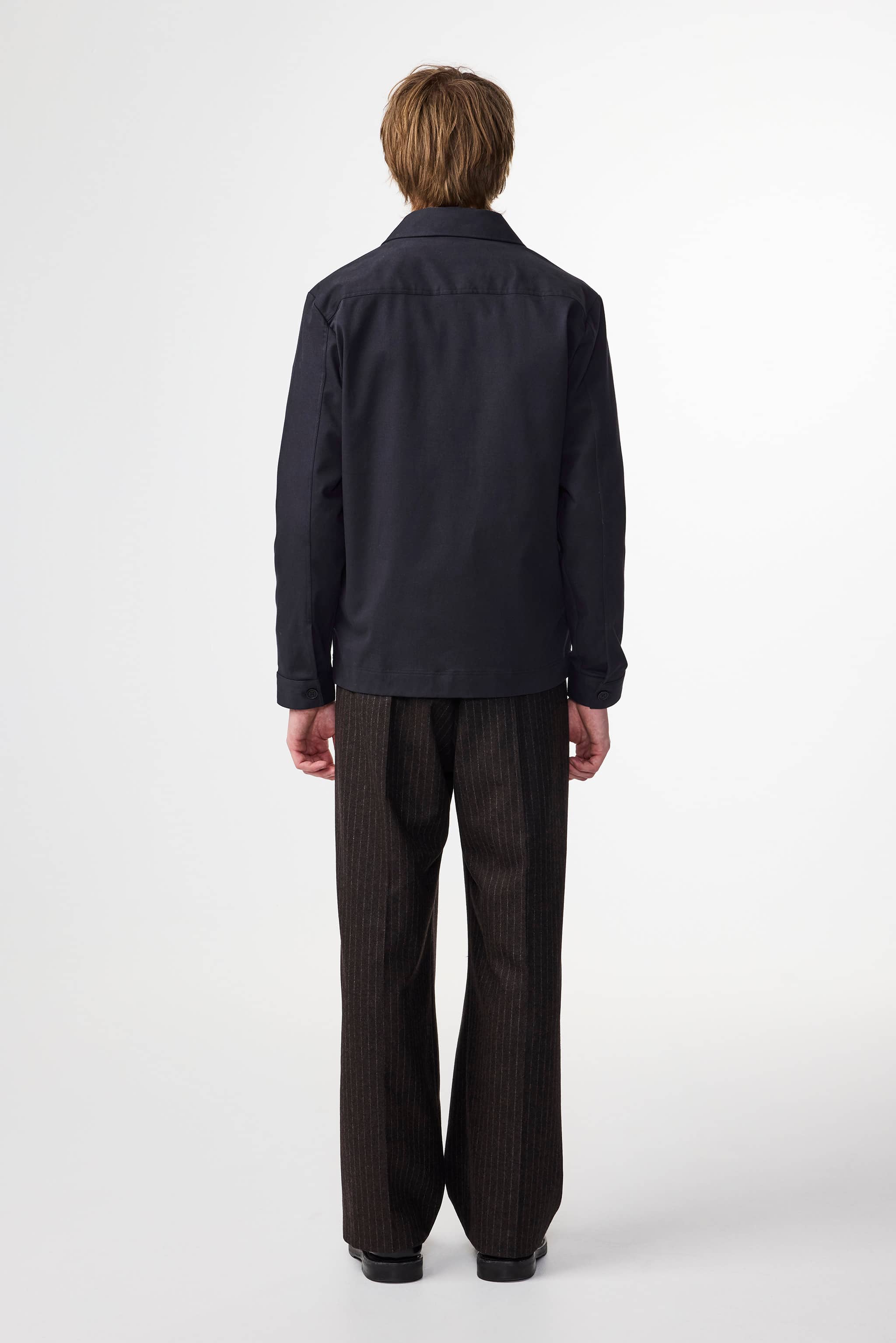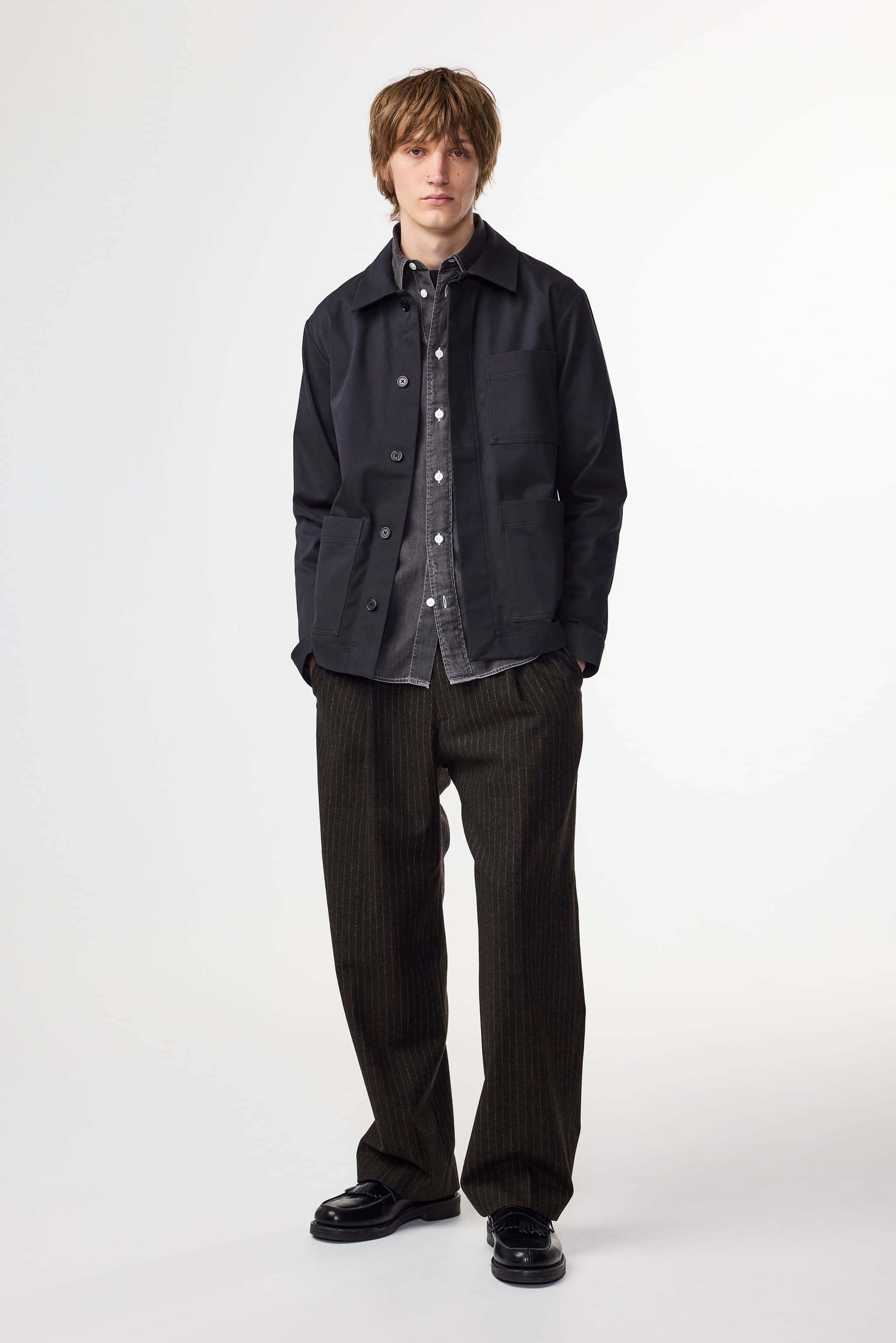 Workwear-inspired hybrid crafted in a structured fabric in Dobby weave, made from organic cotton with a touch of stretch. Designed with a soft collar, a single chest pocket, and twin patch pockets at the waist.
