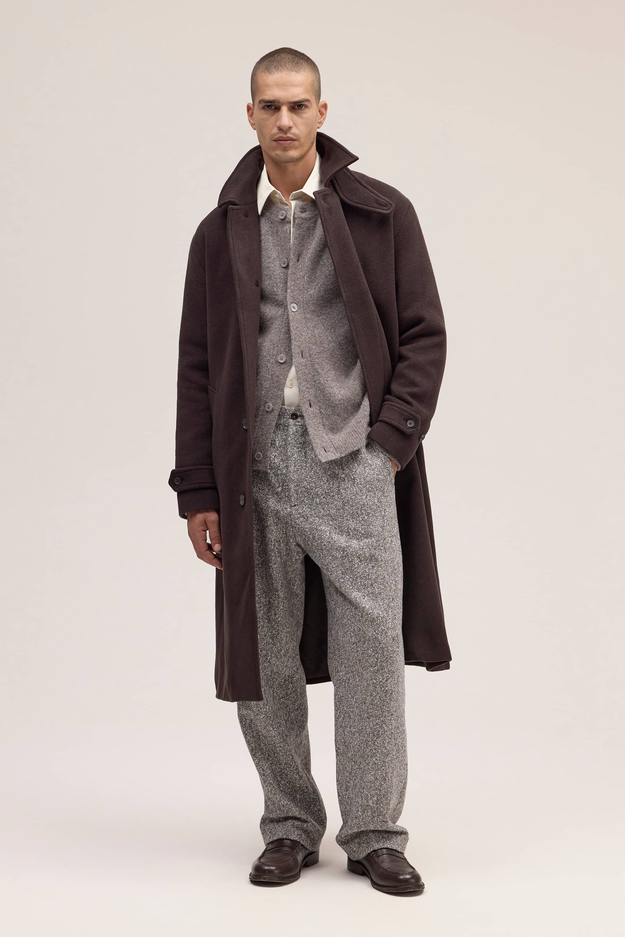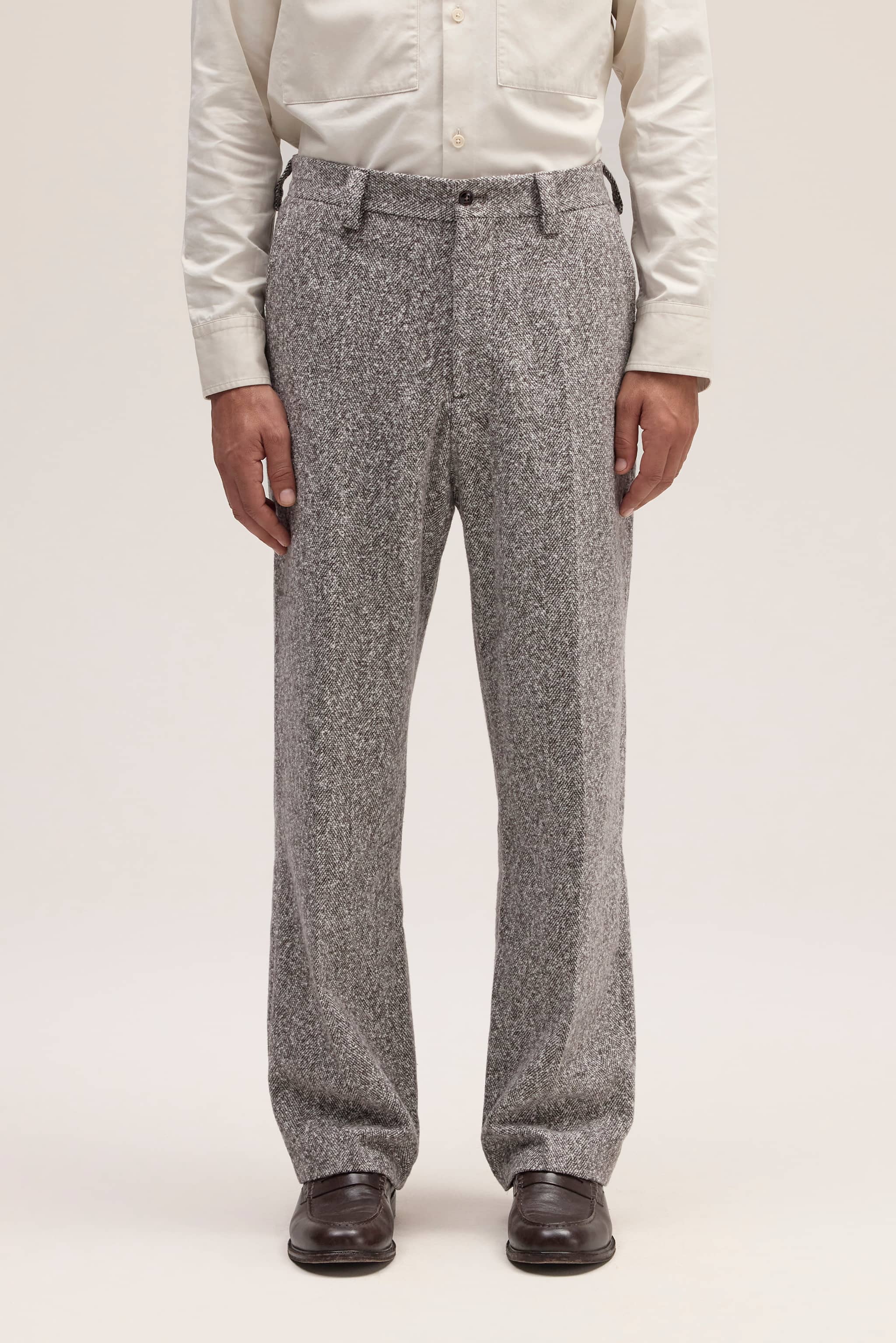 Relaxed-fit dress trousers crafted from heavy recycled 425 g/m² Italian bouclé fabric with a sophisticated herringbone weave. Designed with a straight leg, brushed finish and refined tailoring details.