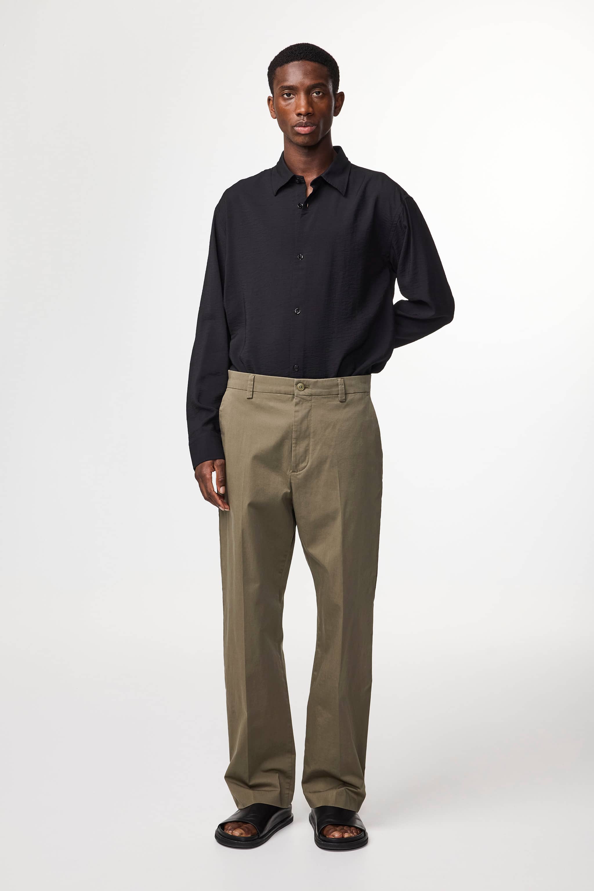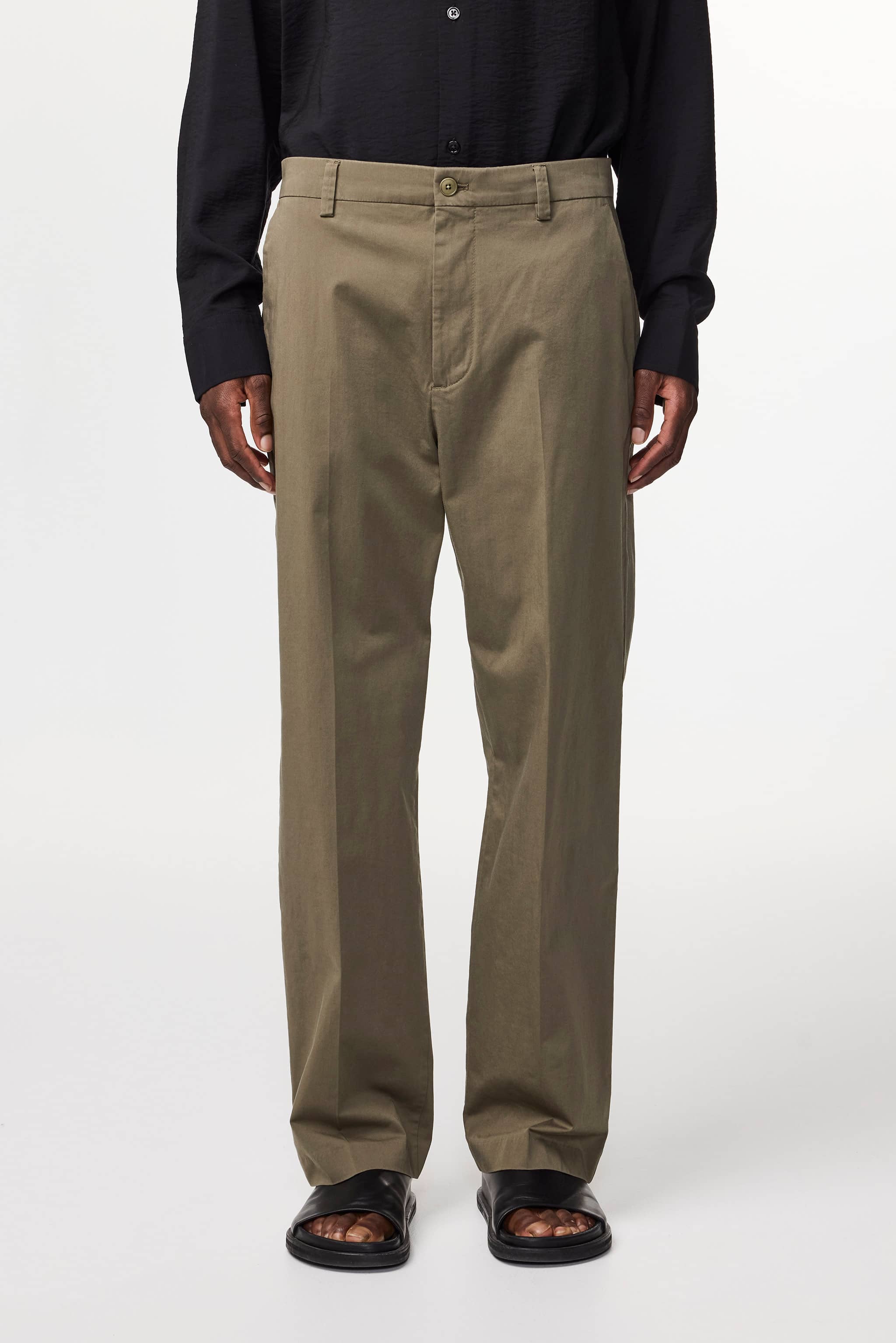 A pair of relaxed, straight-leg trousers crafted in a soft satin 220 g/m2 organic cotton and TENCEL™ lyocell blend with a touch of stretch. Tailored with slanted side pockets and dual back welt pockets.