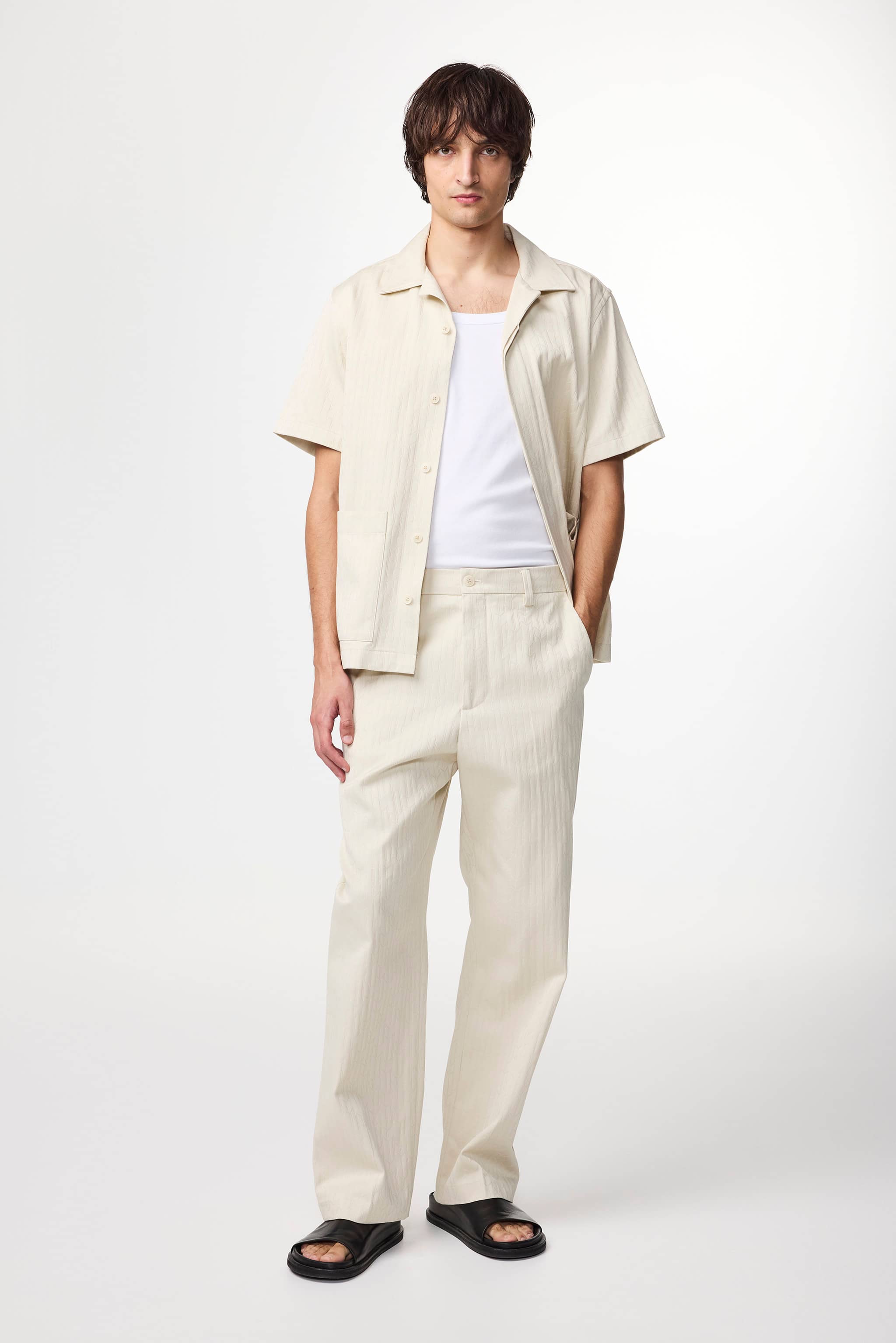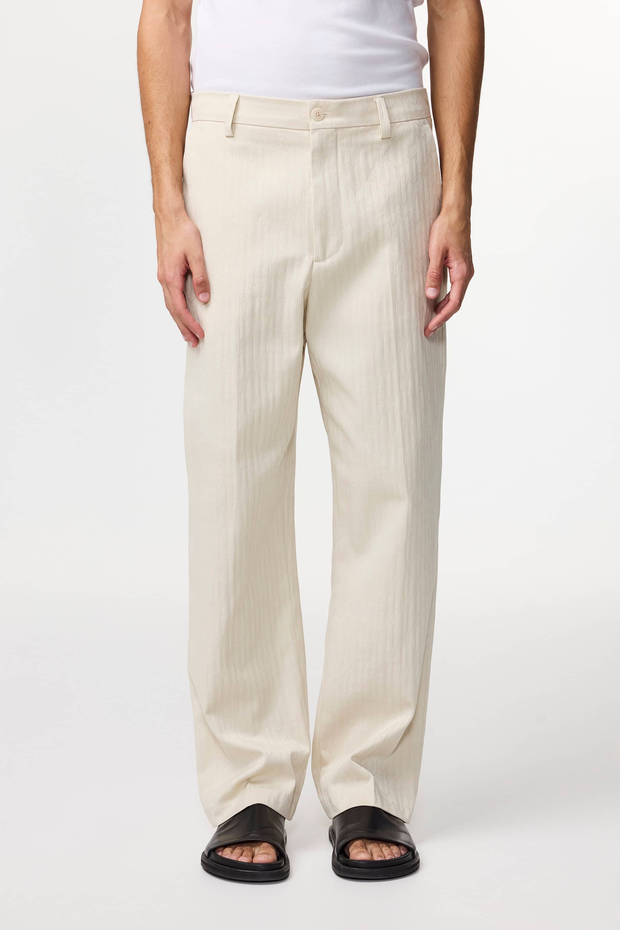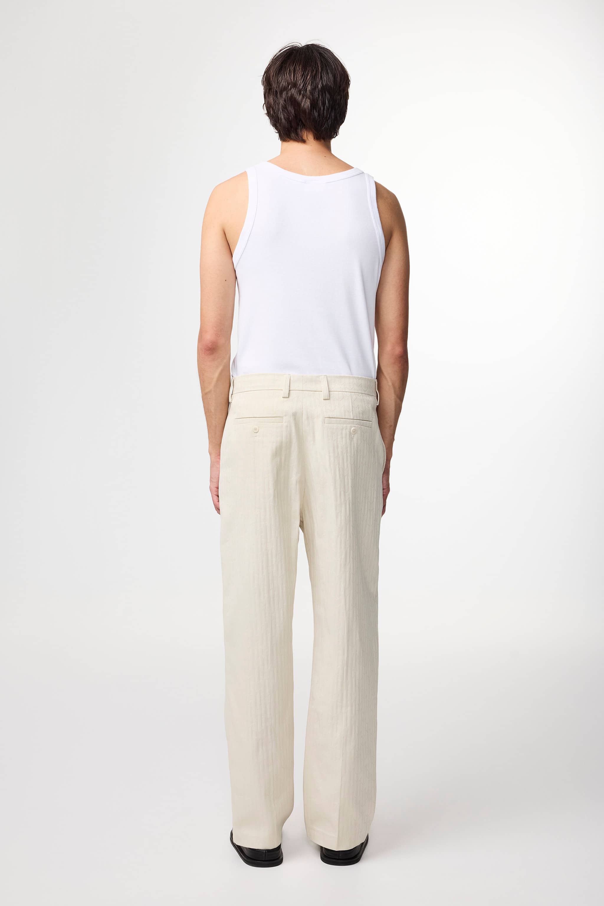 A pair of relaxed, straight-leg trousers crafted in a soft 290 g/m2 cotton jacquard fabric. Tailored with slanted side pockets and dual back welt pockets.
