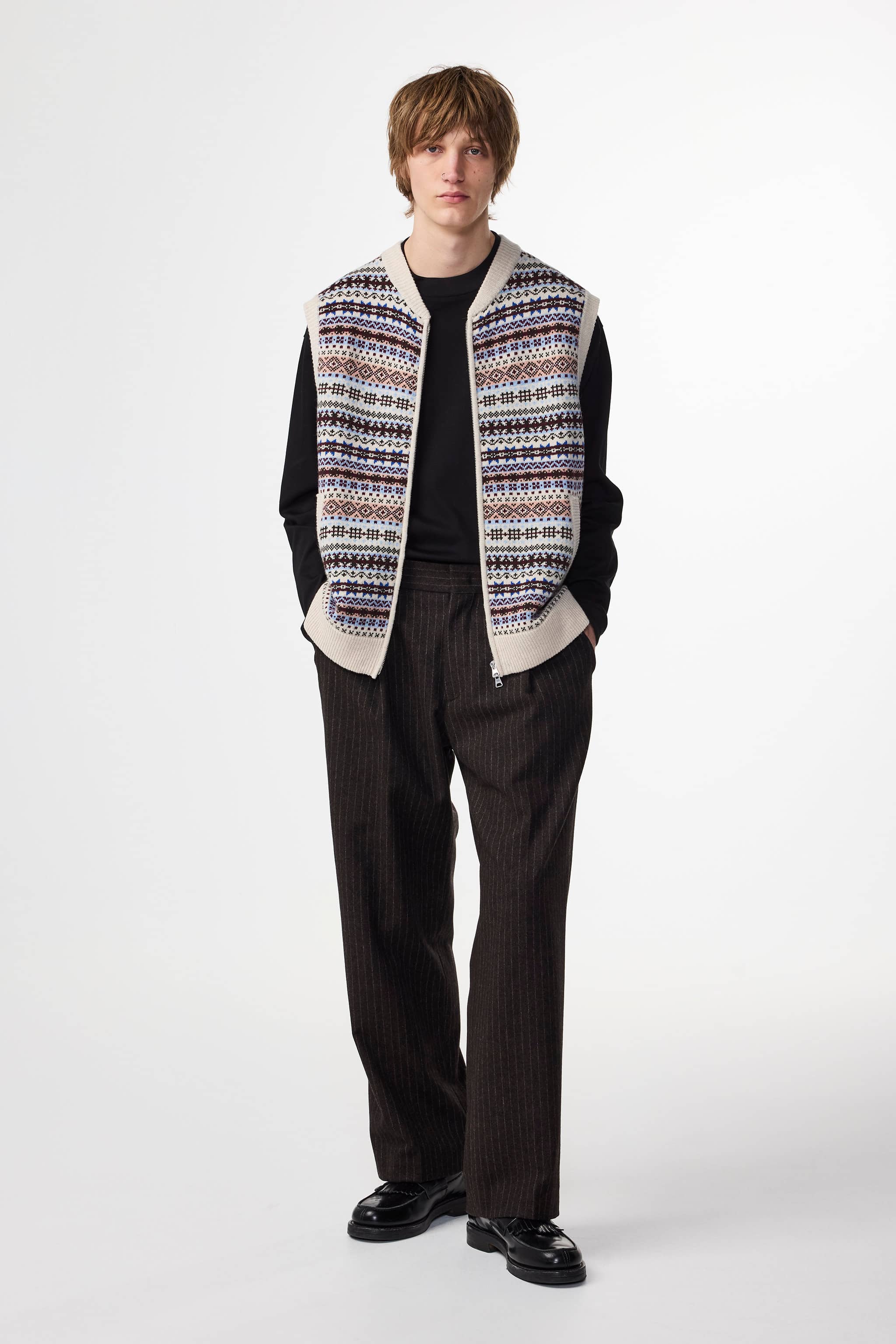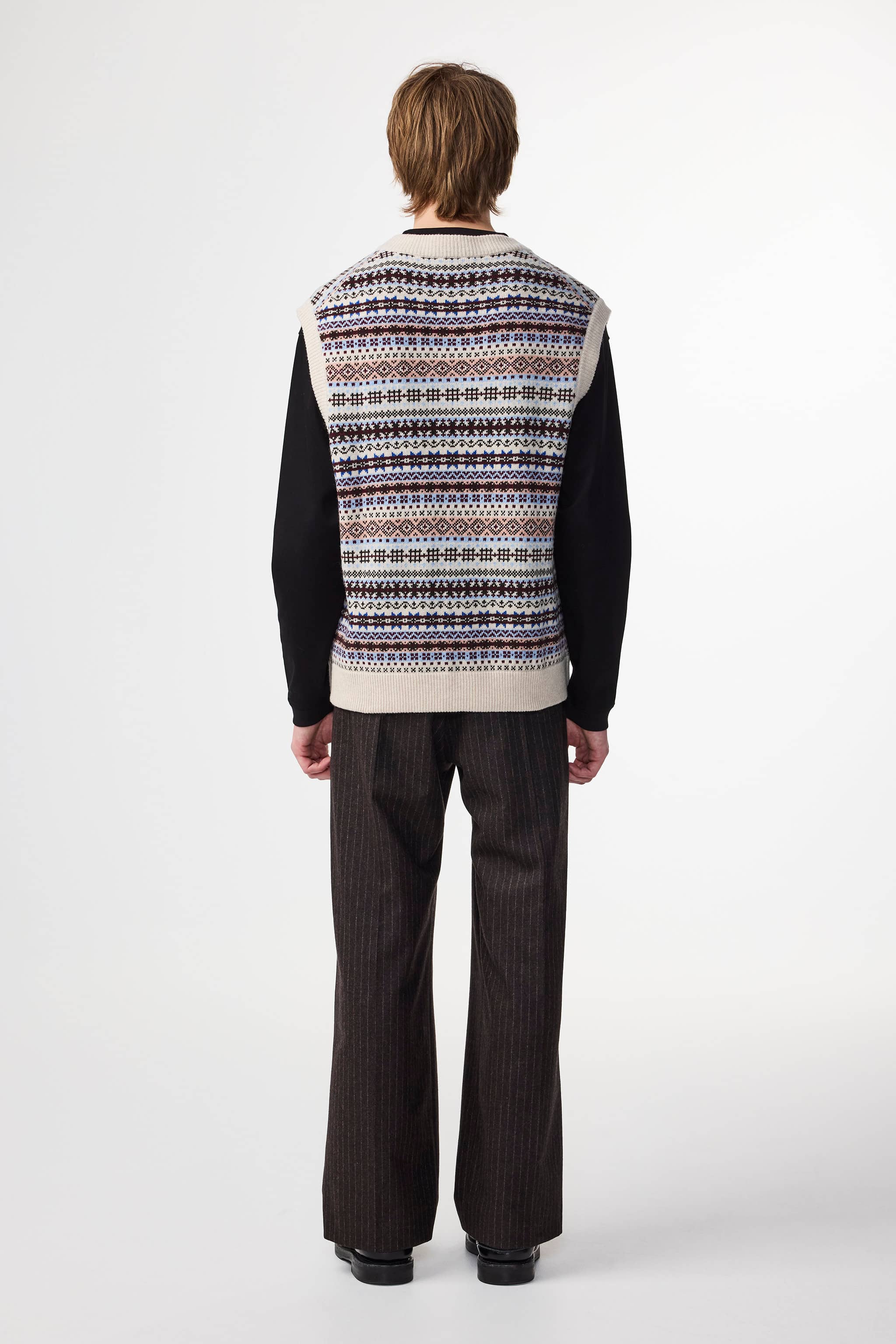 Zip-up vest knitted in a soft wool blend. Features a stitched fair isle pattern and a visible zip. Completed with side pockets.
