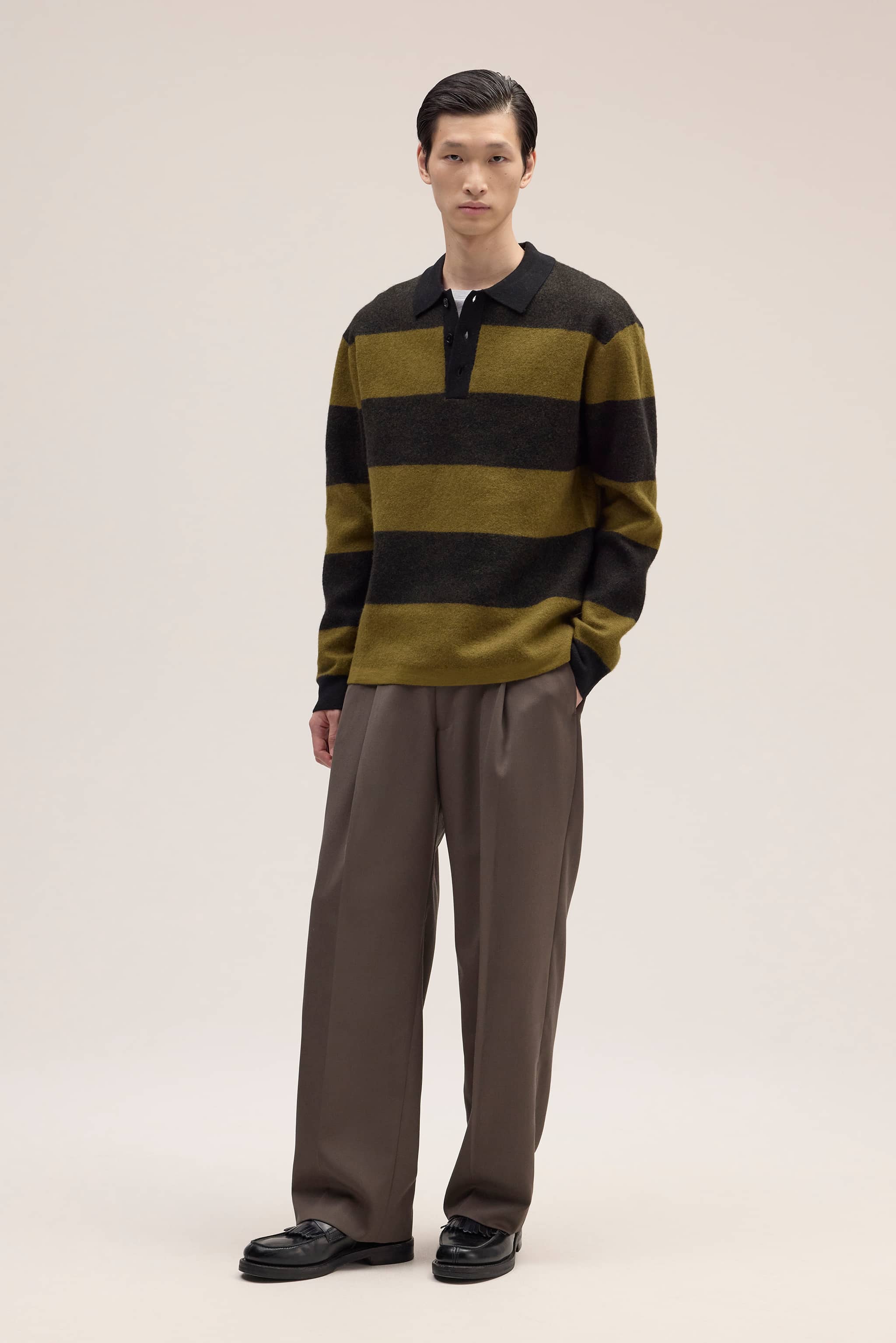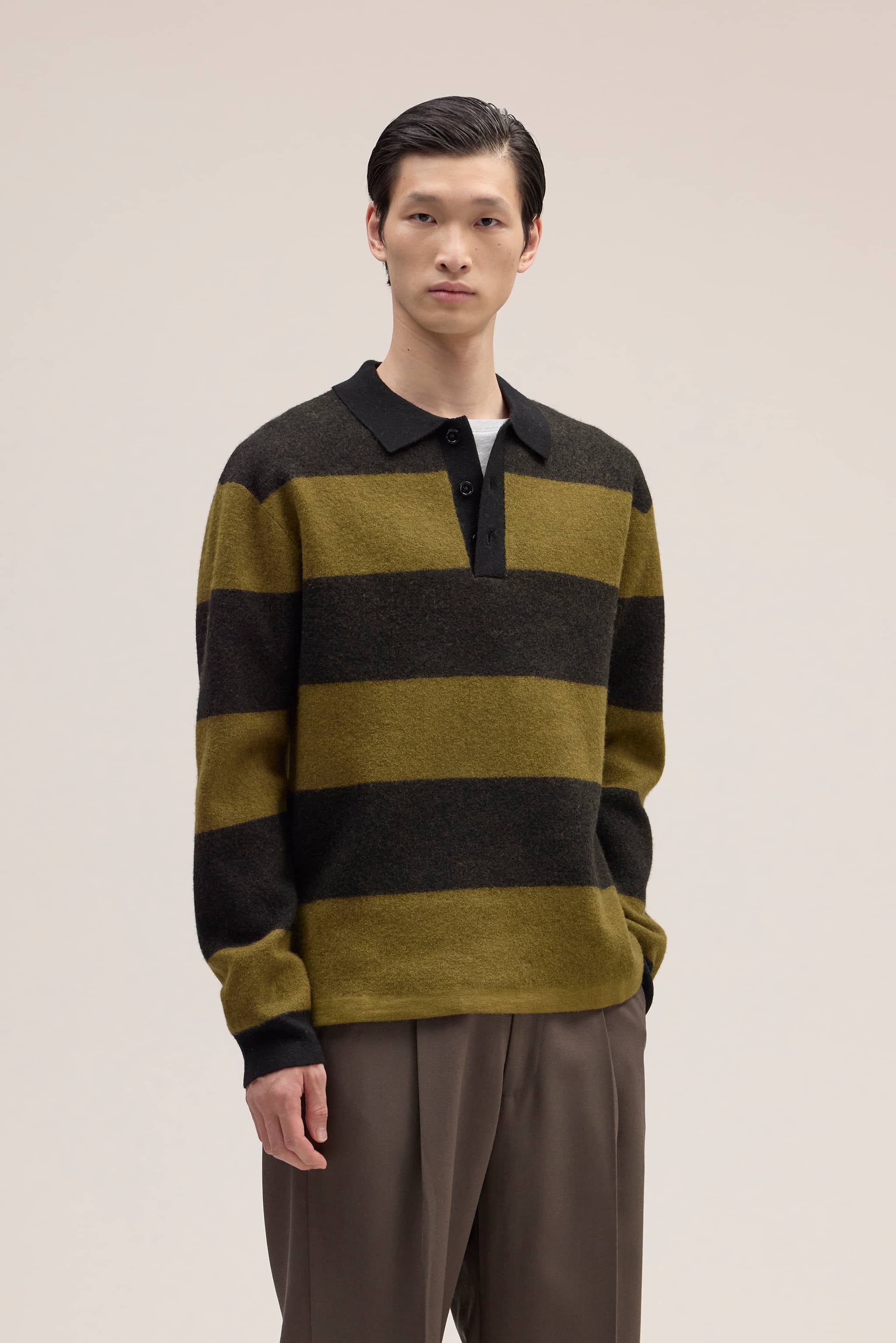 Exclusively available online through Mr. Porter and NN.07. Classic rugby-style polo in boiled wool, featuring a traditional polo collar and finished with Mother-of-Pearl buttons.