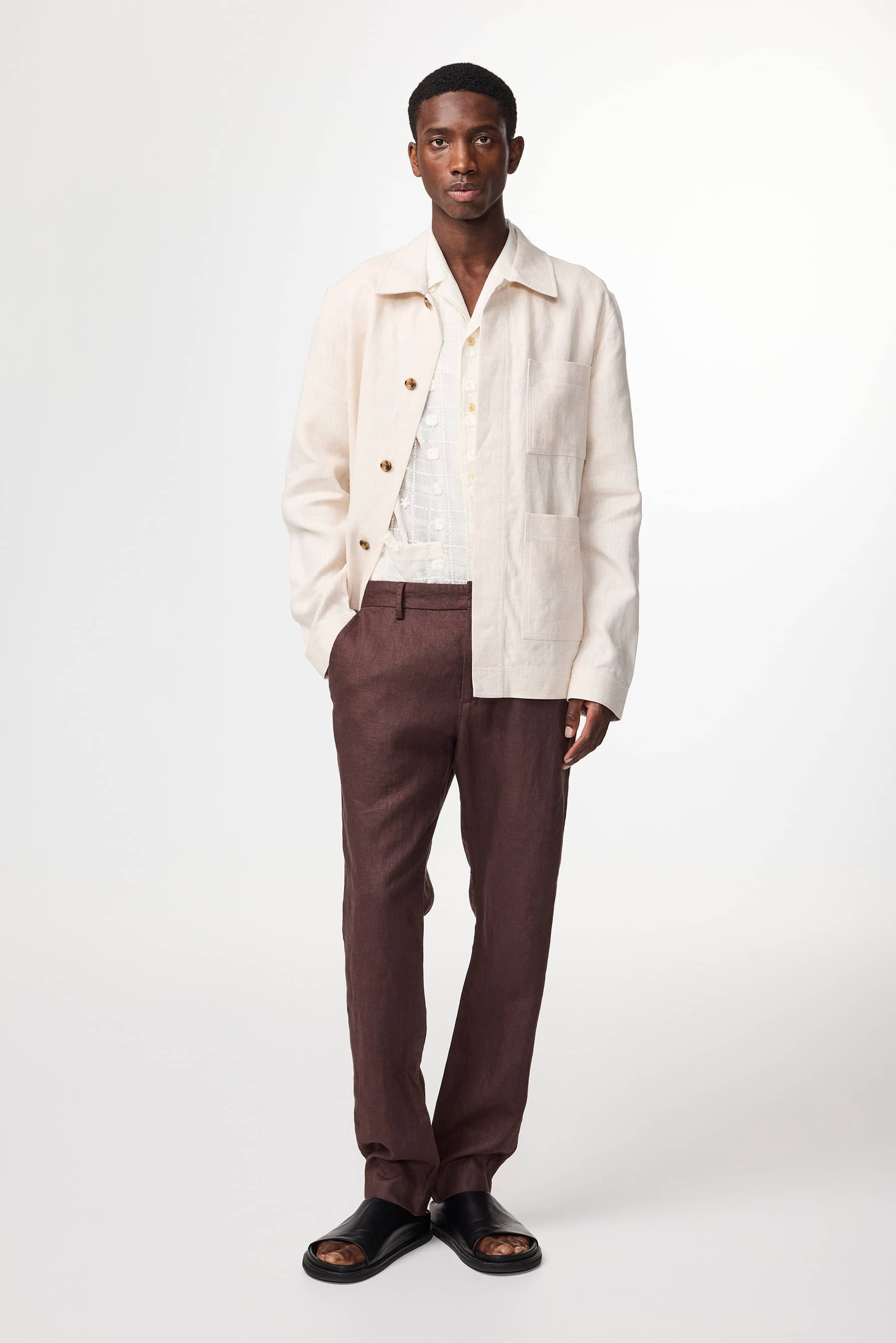 Slim-fit trousers crafted from European linen fabric with a drapey, dry handfeel. Designed with a mid-rise silhouette and button closure, these dressed chinos feature a plain weave that ensures durability while maintaining the natural drape of the linen.