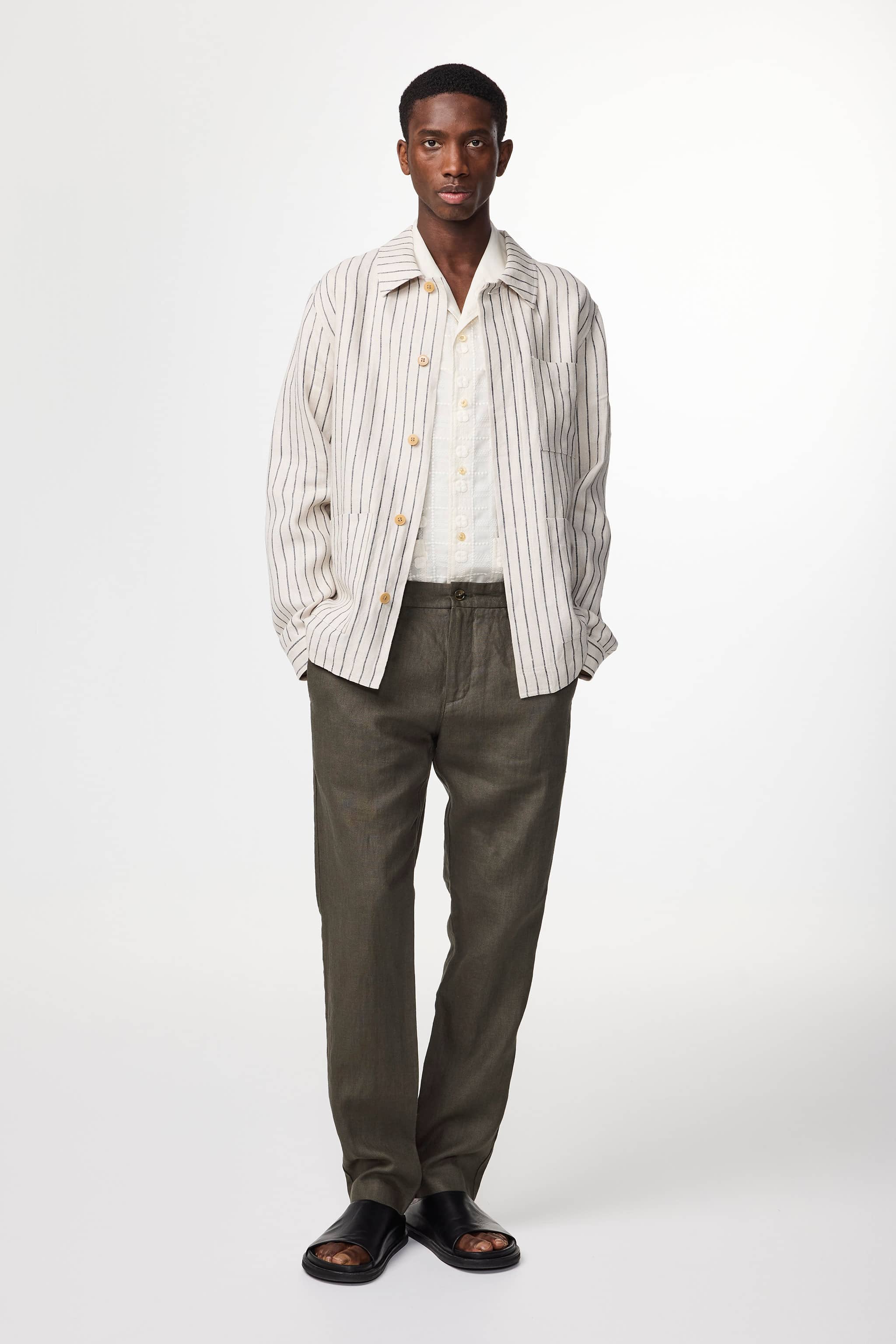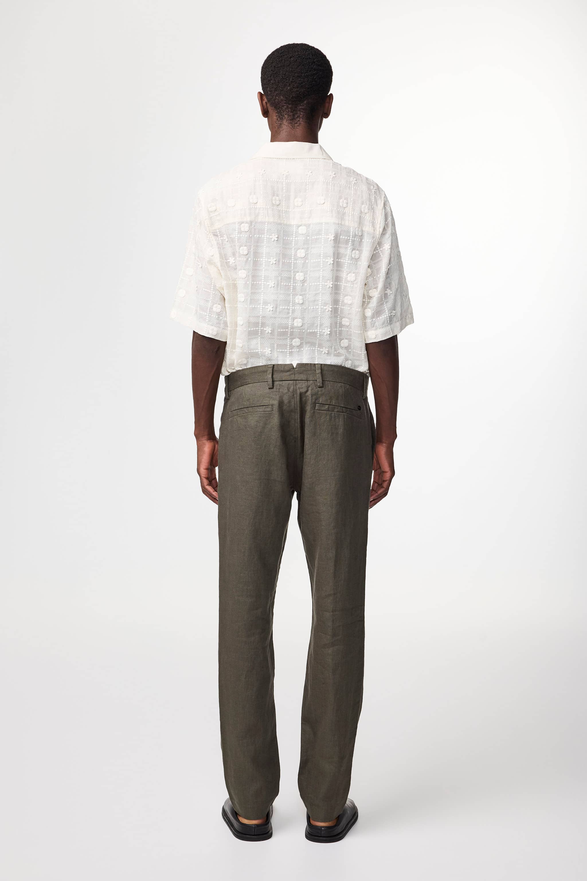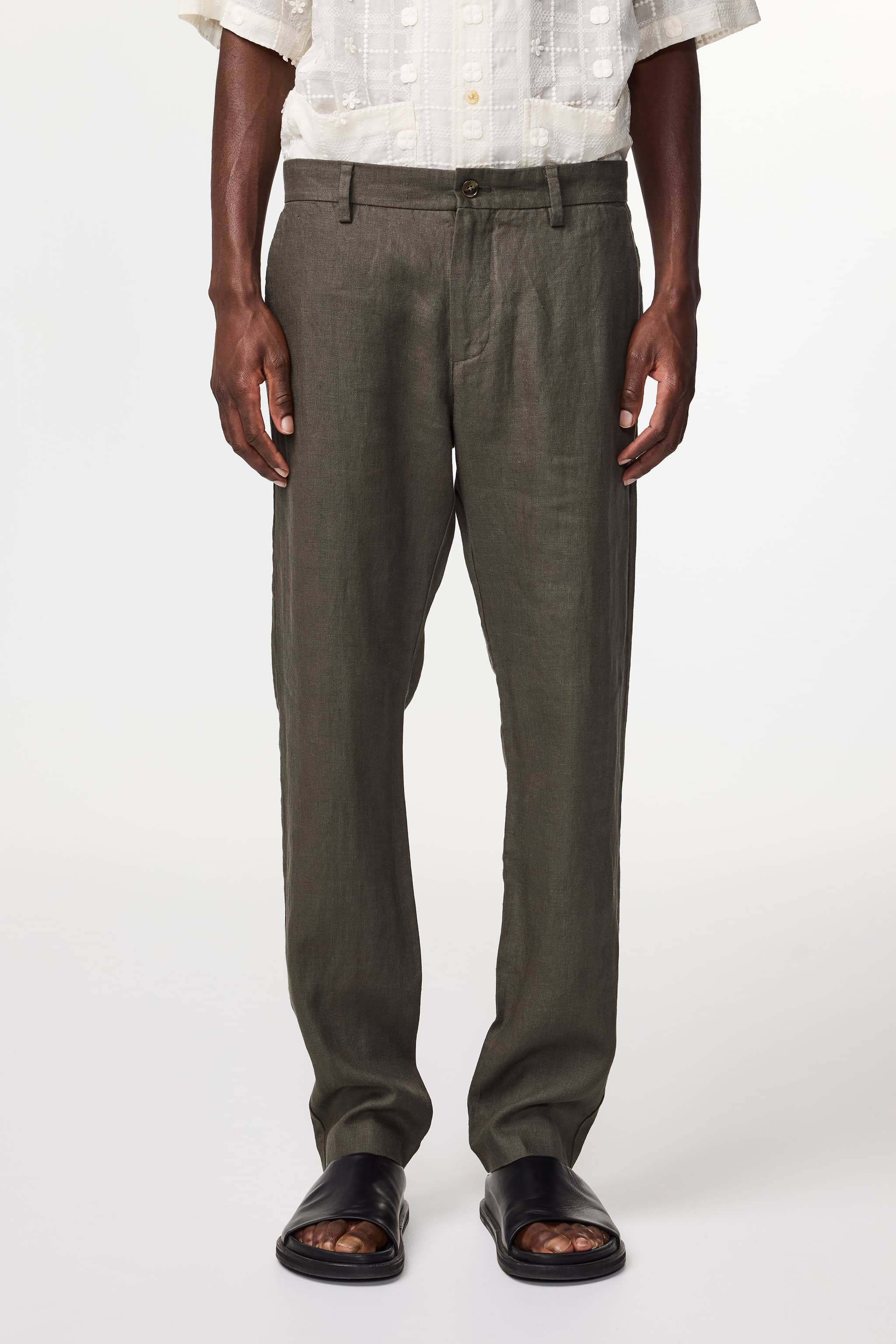 Slim-fit trousers crafted from European linen fabric with a drapey, dry handfeel. Designed with a mid-rise silhouette and button closure, these dressed chinos feature a plain weave that ensures durability while maintaining the natural drape of the linen.