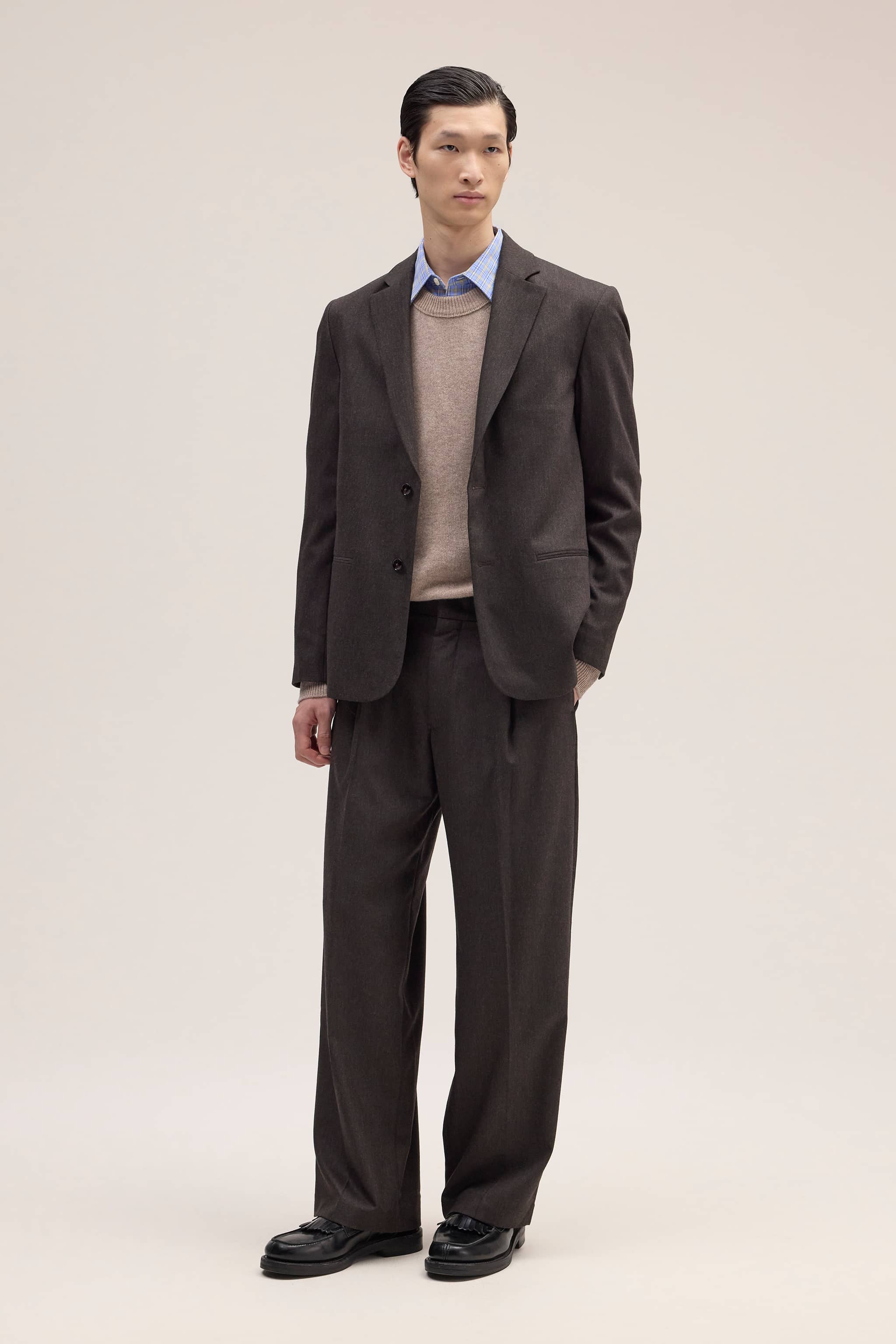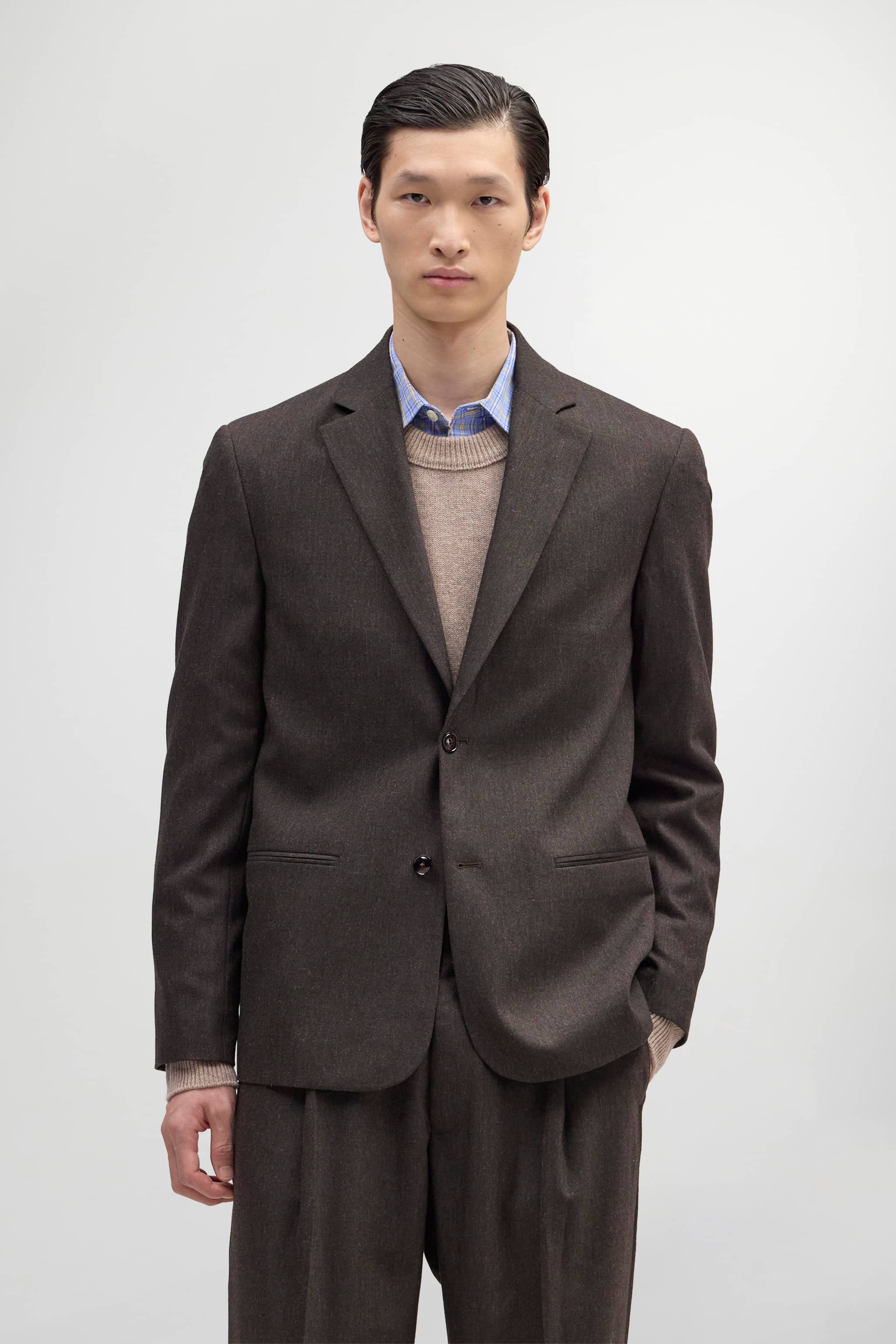 Relaxed-fit blazer crafted from a tweed-look fabric with a soft silk finish. Fully lined and designed with functional pockets and a button closure for an effortless yet refined look.