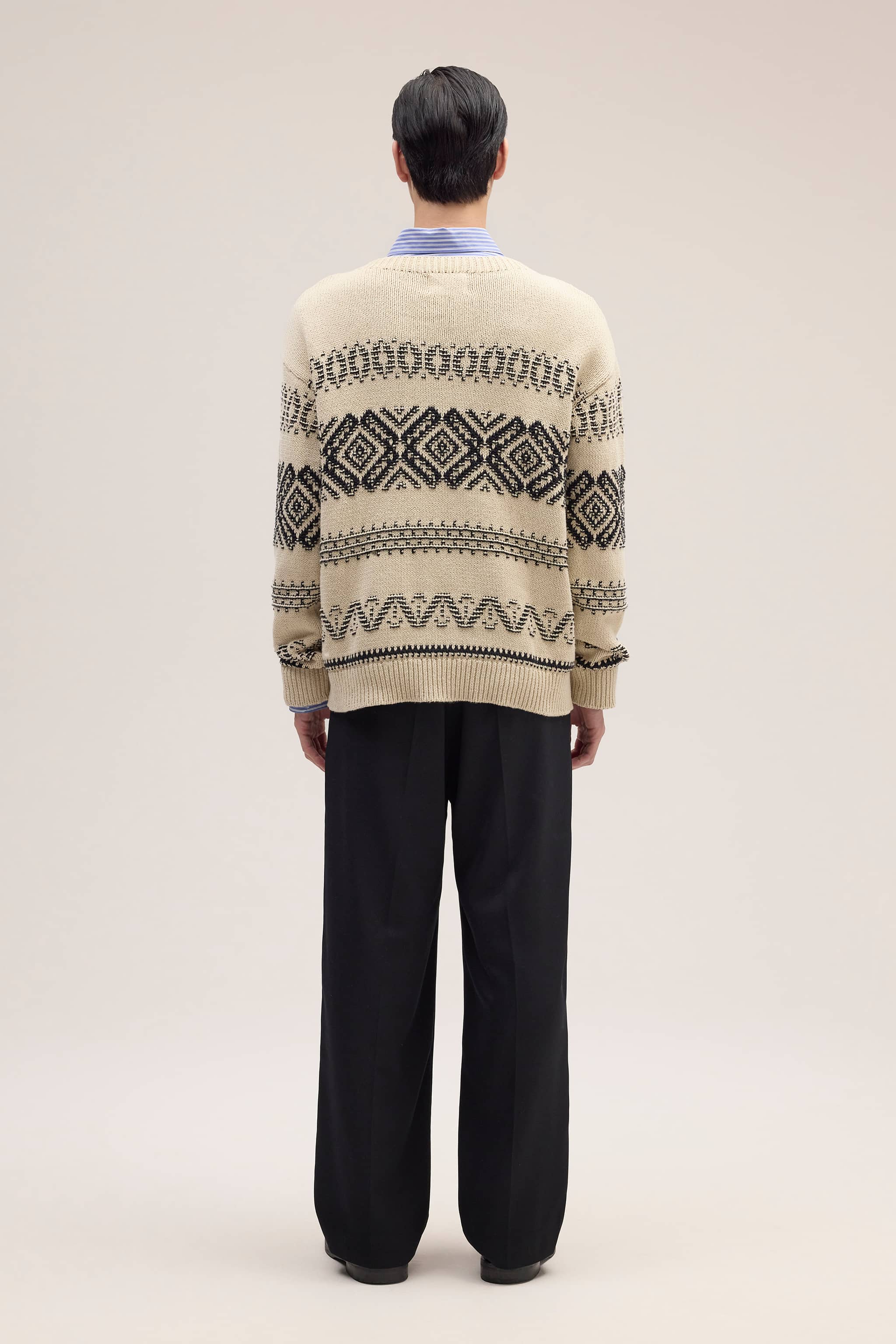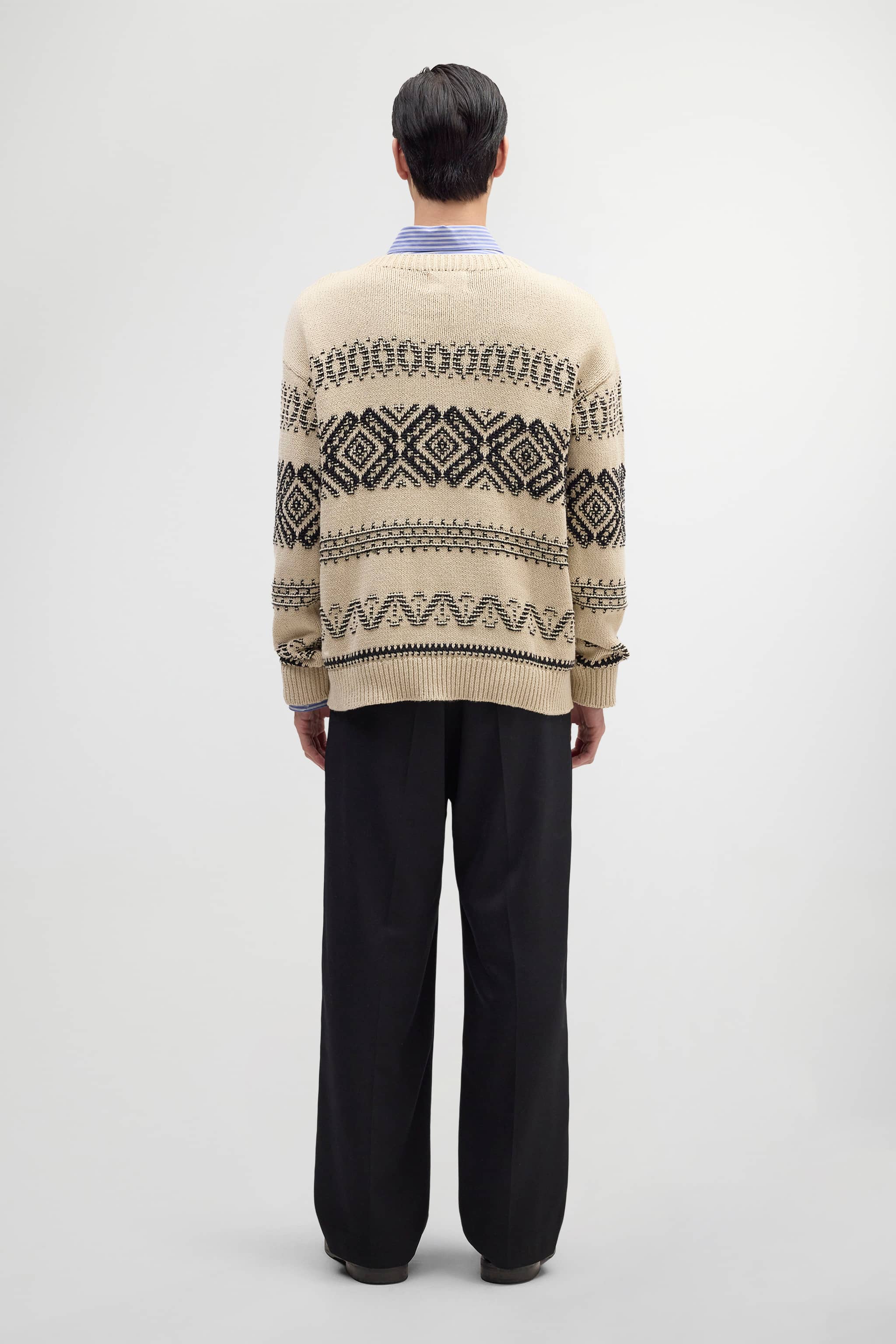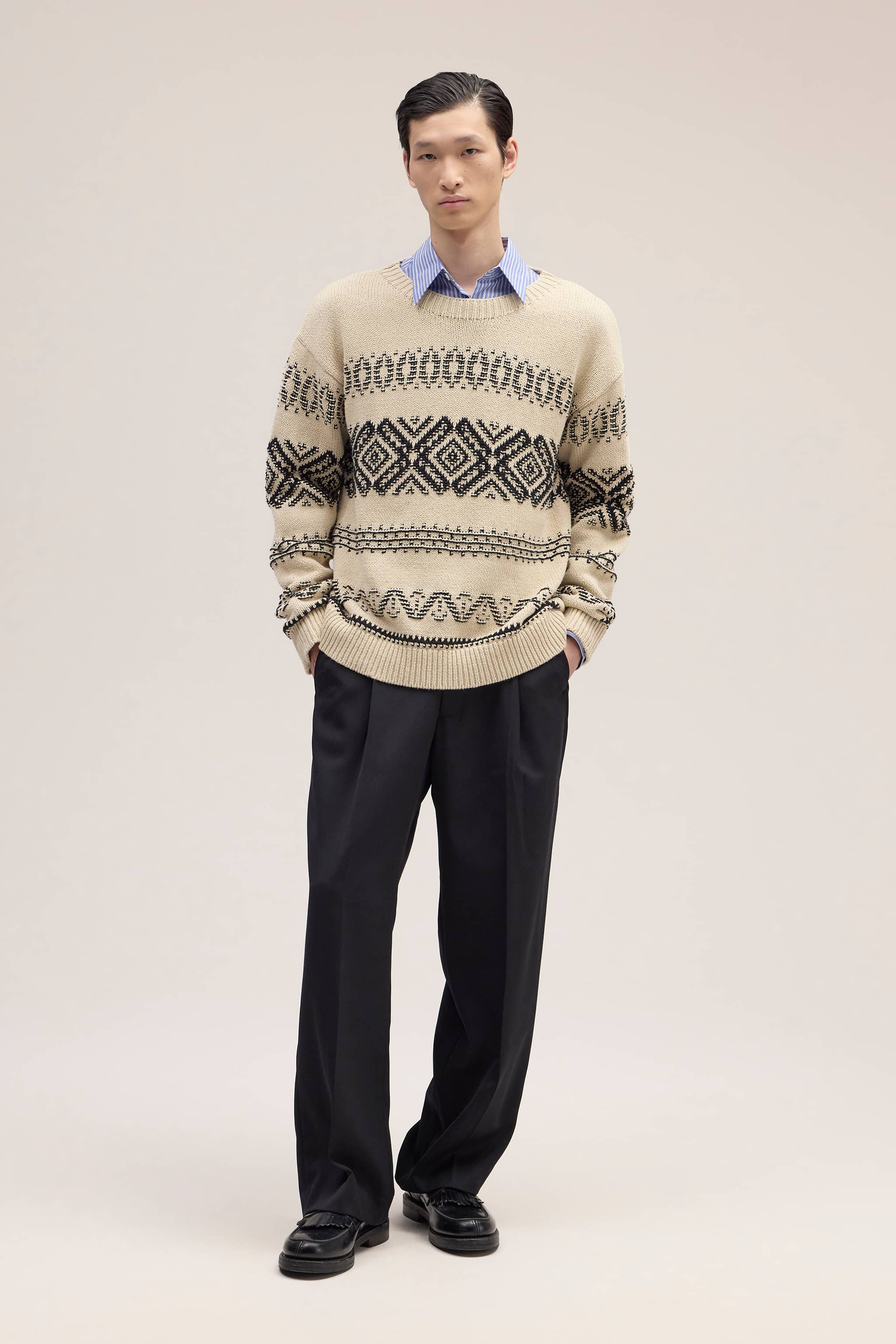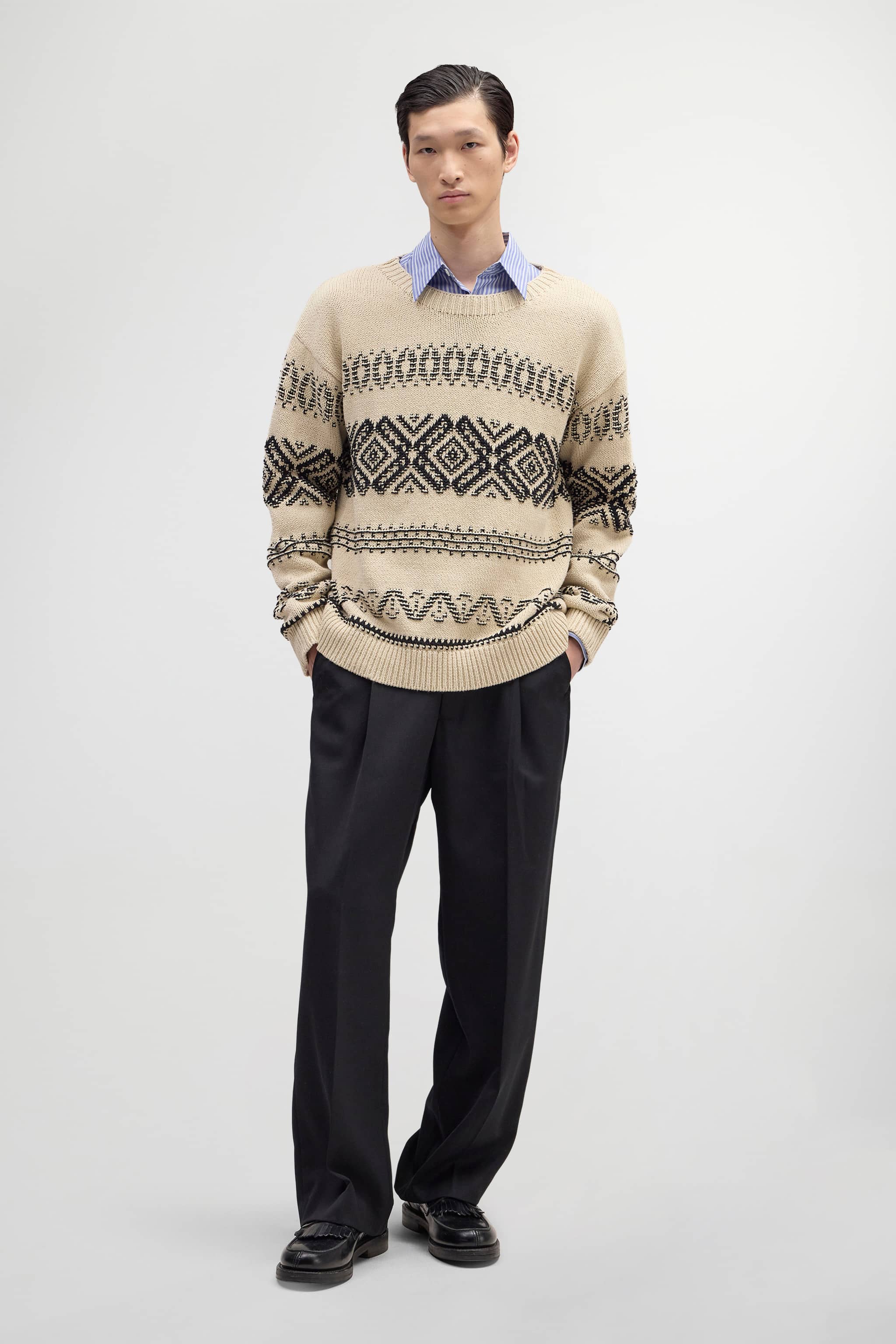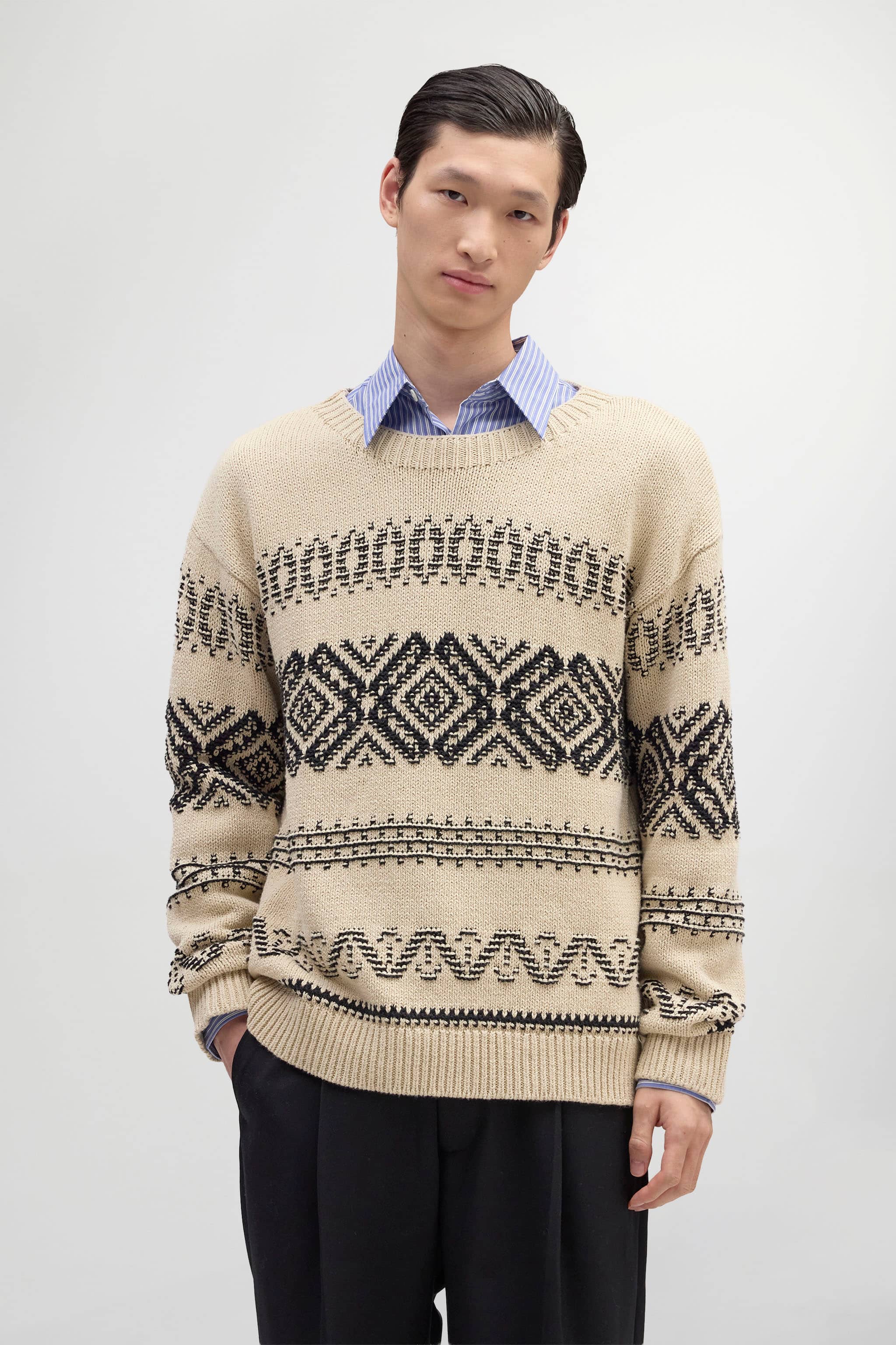 Chunky jacquard-patterned crew neck sweater in a relaxed fit made from organic cotton. Designed with a dry hand feel and a bold, playful aesthetic.