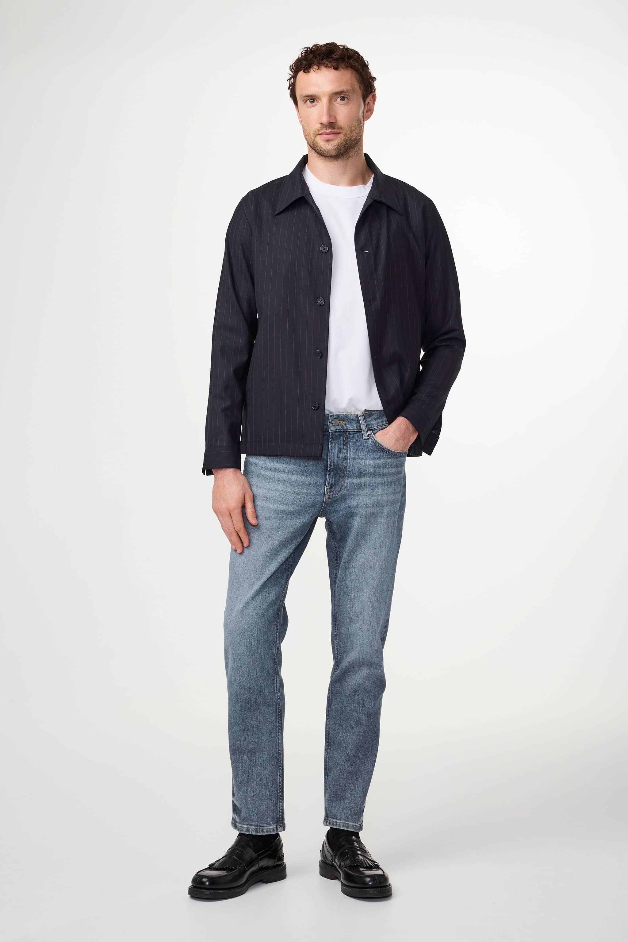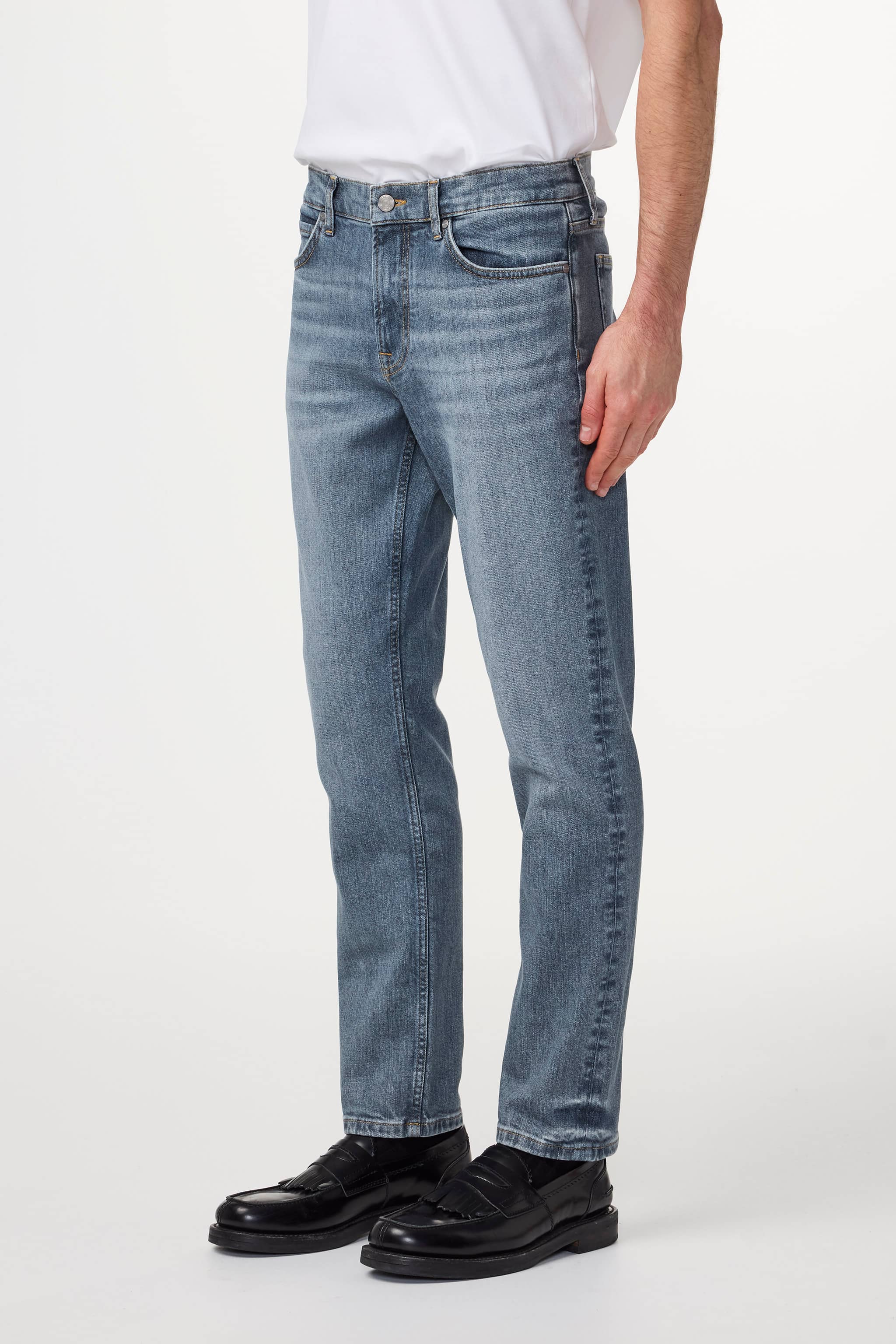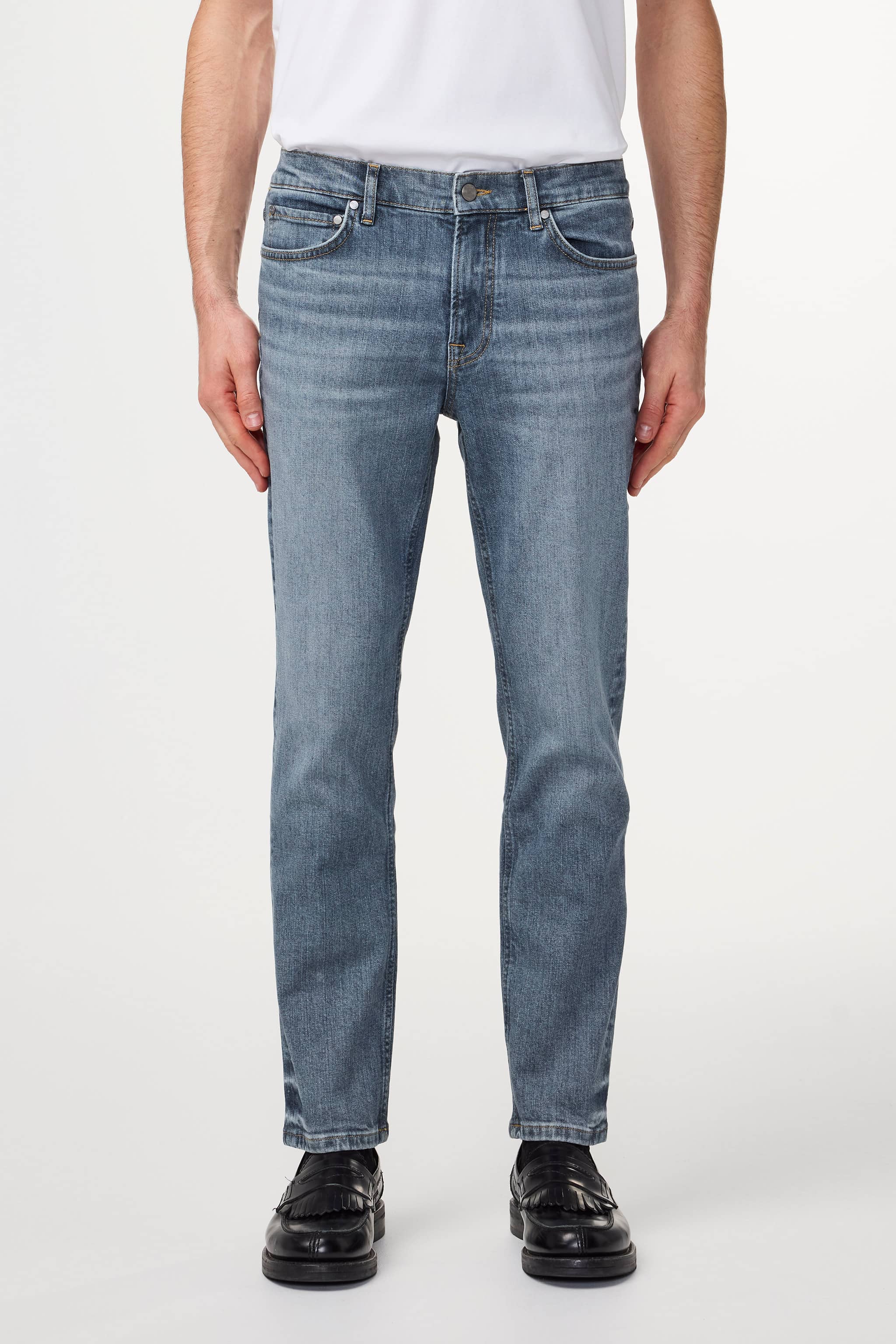 Slim-fitted, five-pocket jeans crafted from heavy 13 oz cotton denim blend with a slight touch of stretch. Made with whiskering details and finished with a blue embroidery stitching along the back pocket.