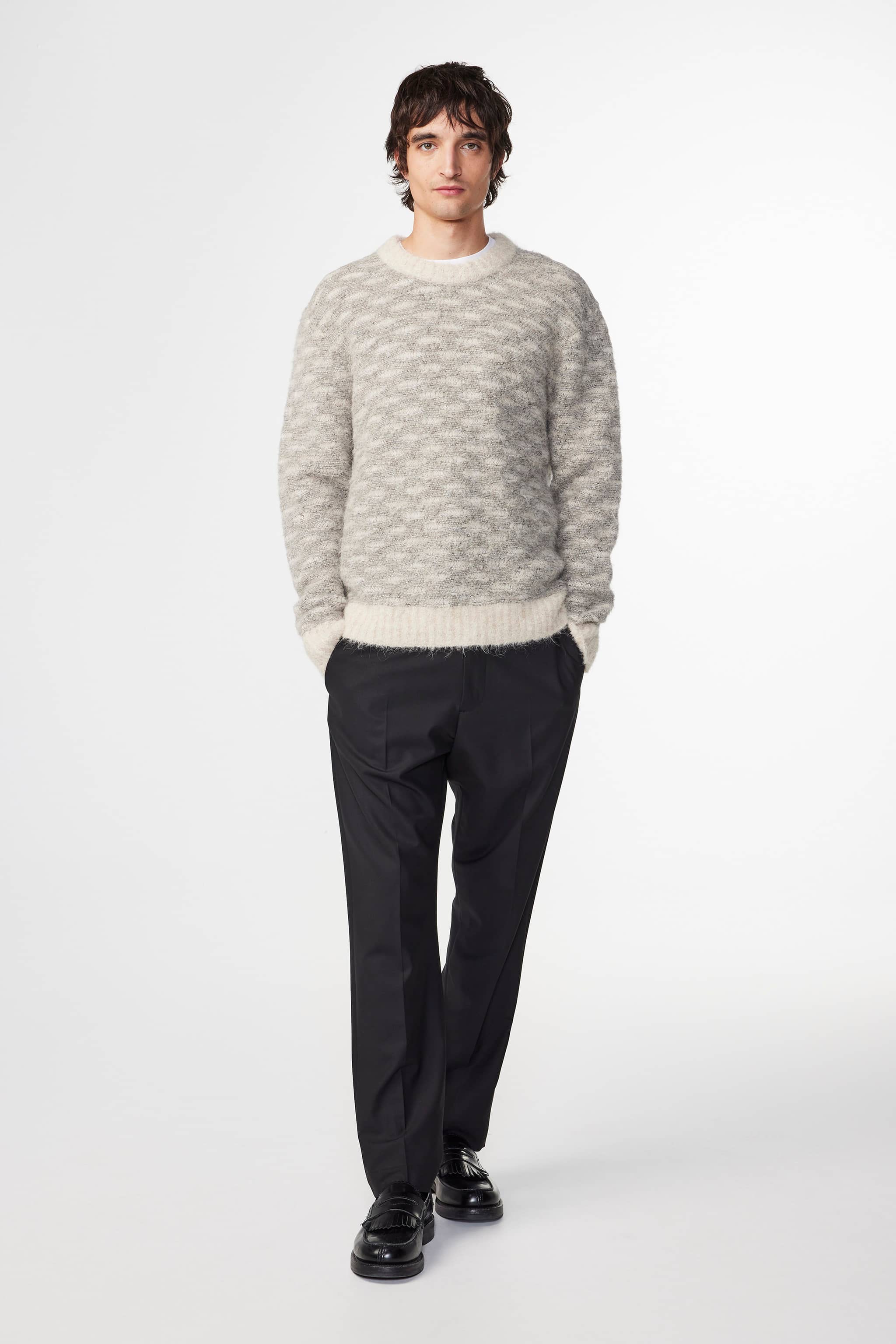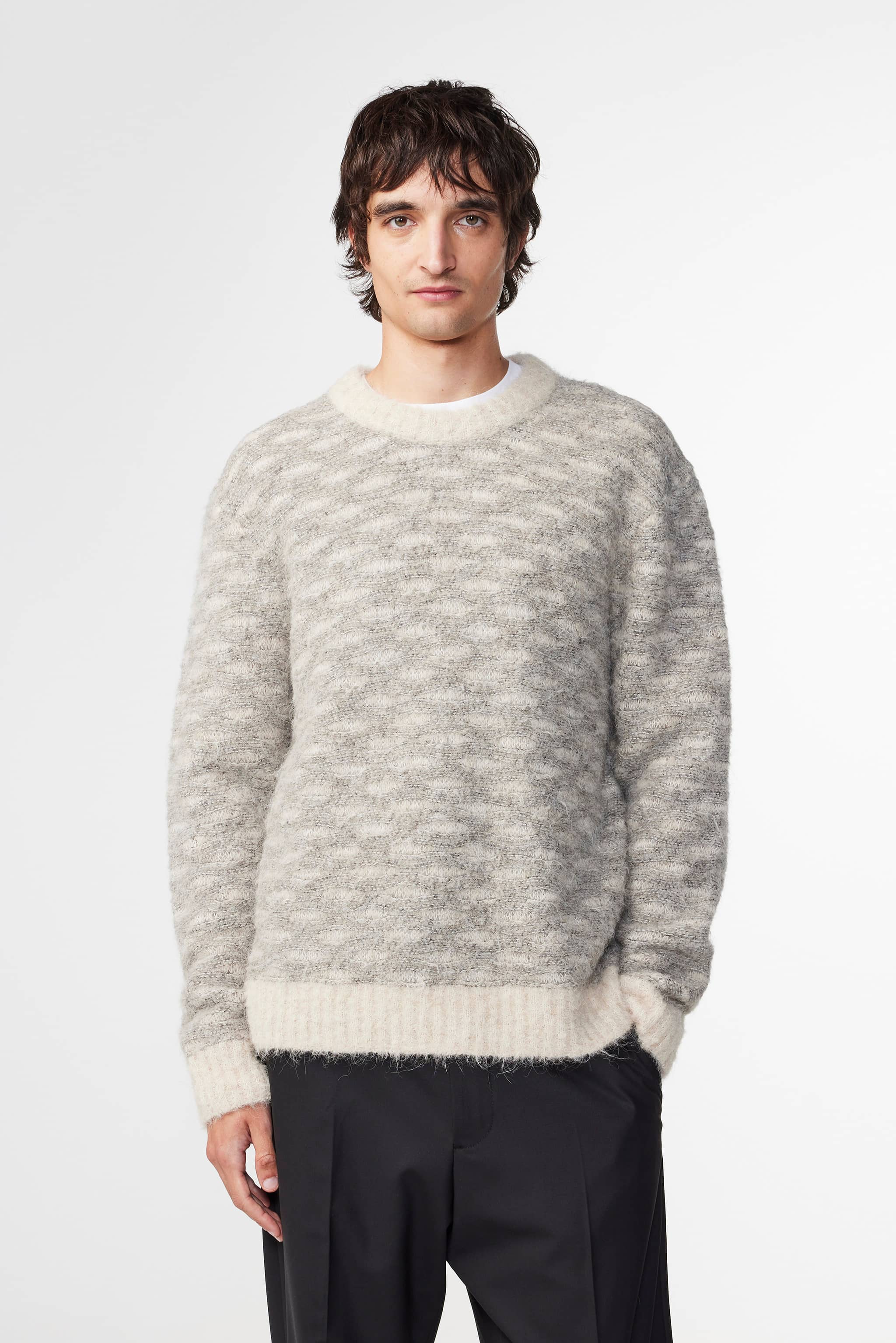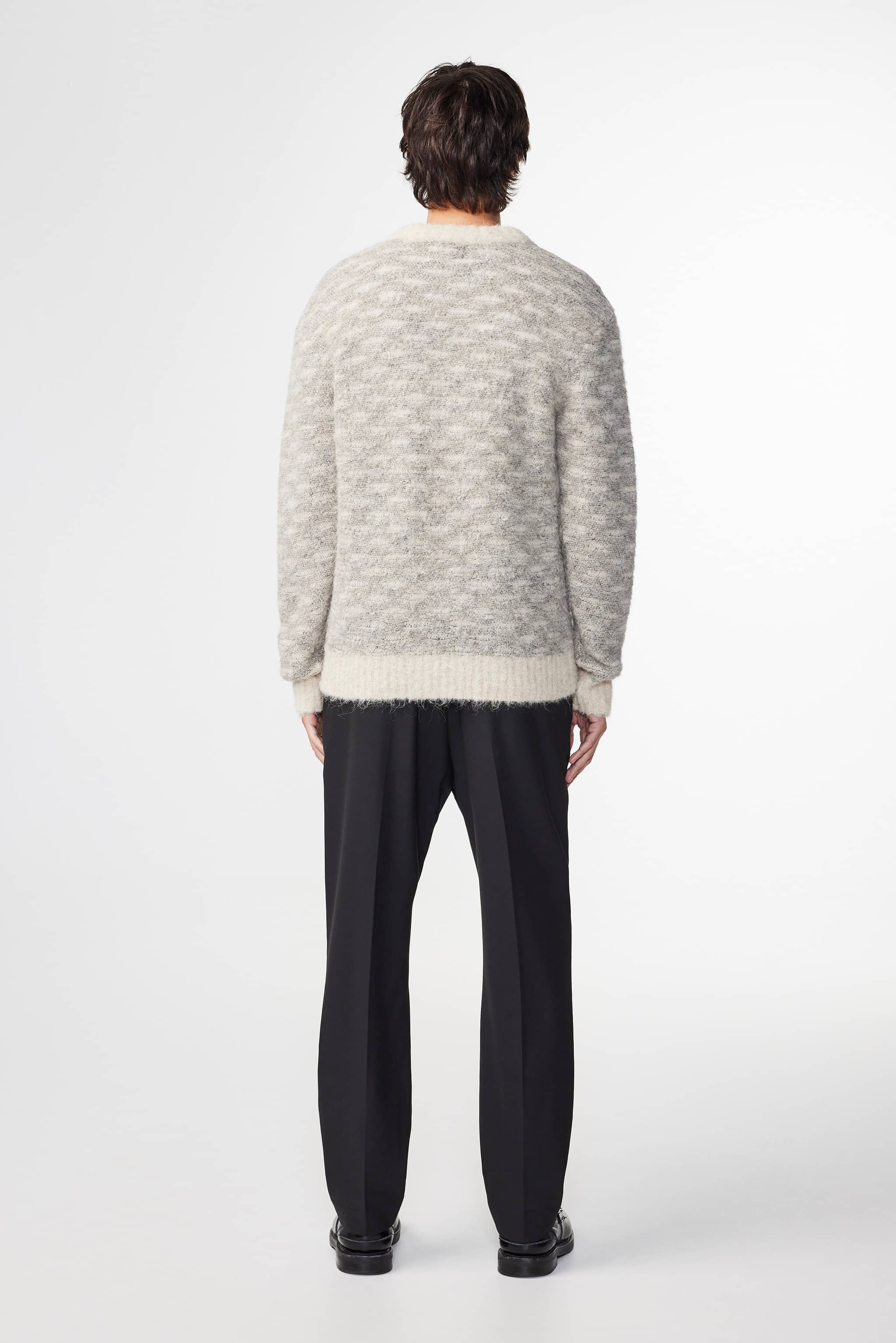 Soft touch crewneck pullover crafted in a soft alpaca blend fabric from Italy, designed in mixed colours and open-stitch fabric.
