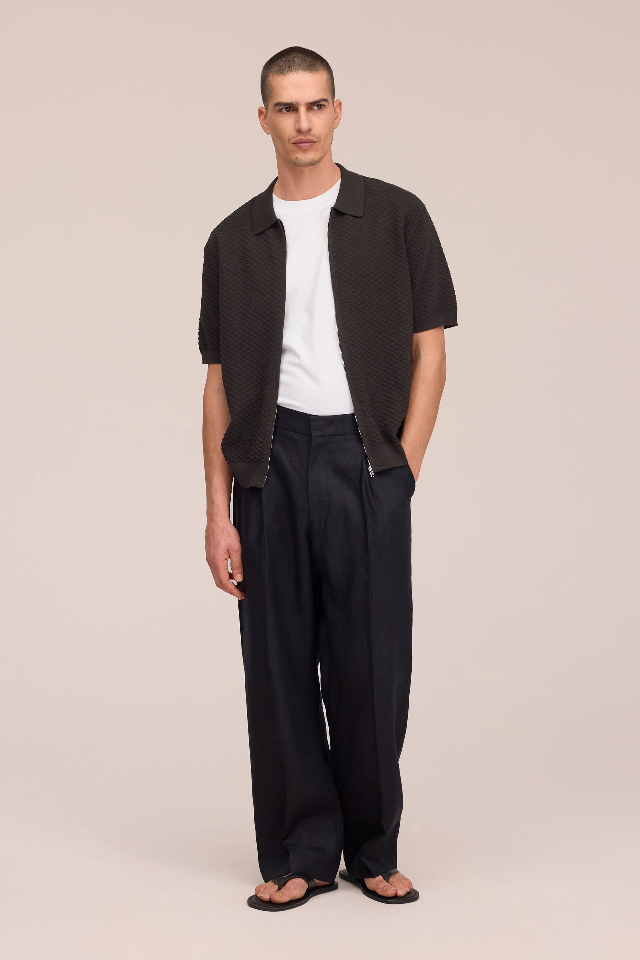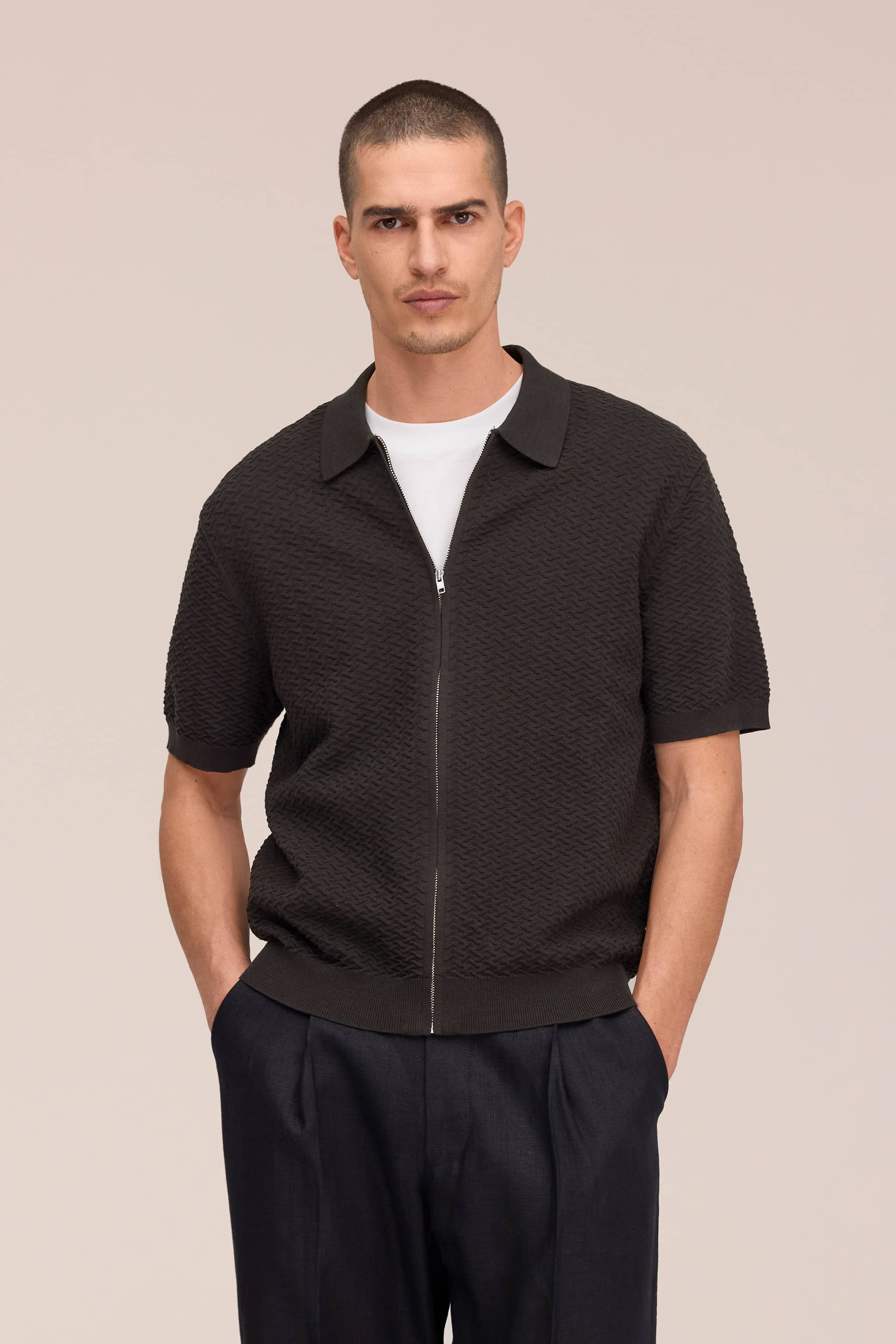Full-zip knit cardigan crafted in organic cotton with a distinctive textured stitch pattern. Lightweight design offers a crisp, delicate handfeel with clean, minimalistic appeal. Features NN.07 branded zipper closure and high-twist yarn technique for added visual interest.