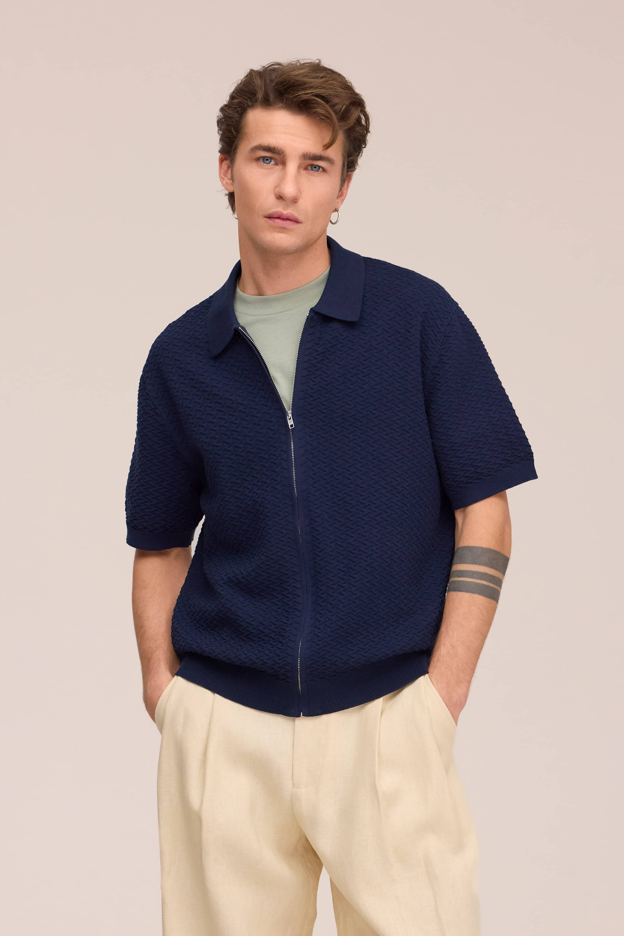 Full-zip knit cardigan crafted in organic cotton with a distinctive textured stitch pattern. Lightweight design offers a crisp, delicate handfeel with clean, minimalistic appeal. Features NN.07 branded zipper closure and high-twist yarn technique for added visual interest.