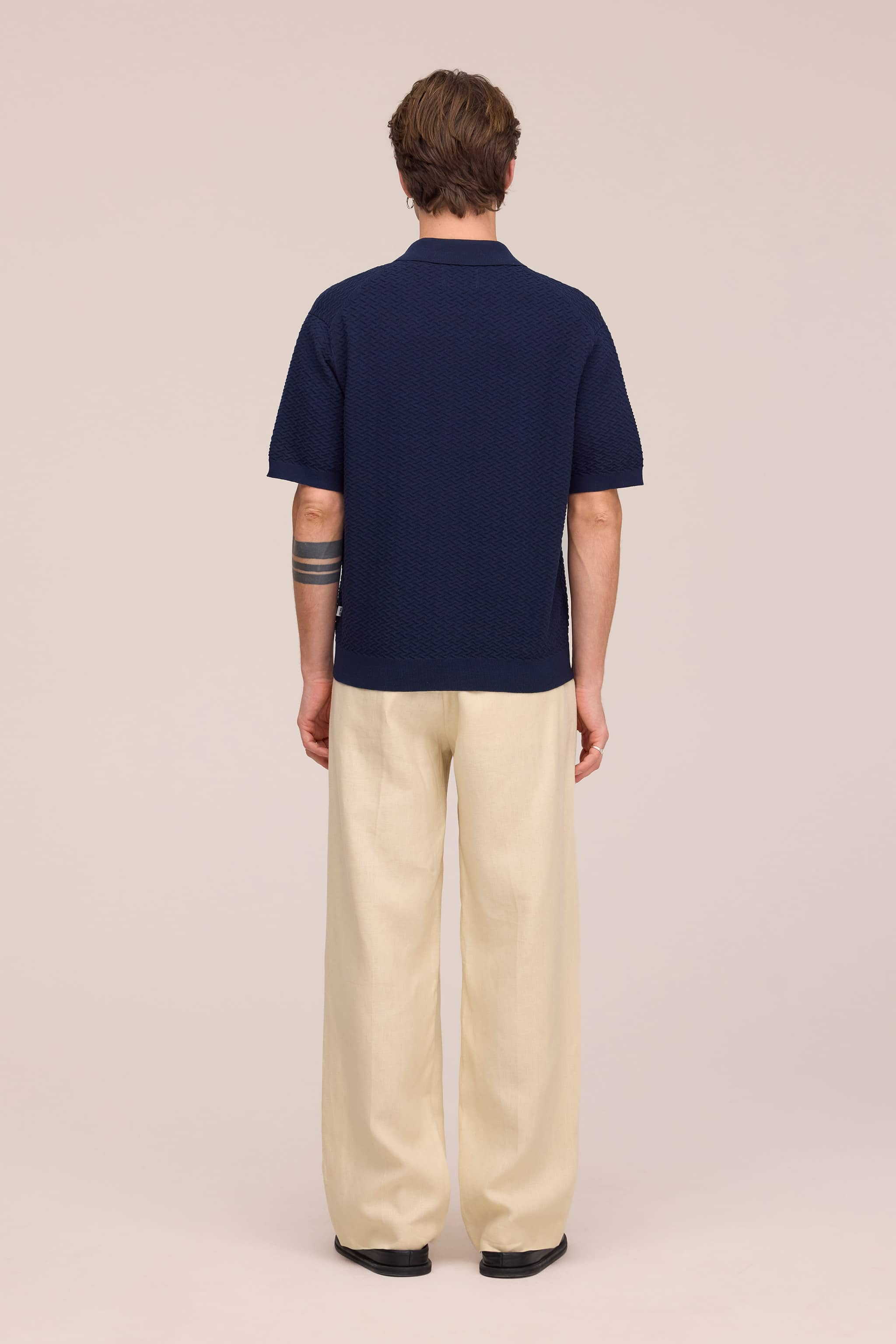 Lightweight striped polo made from wool blend, featuring a pointelle stitch for a soft and breathable finish.