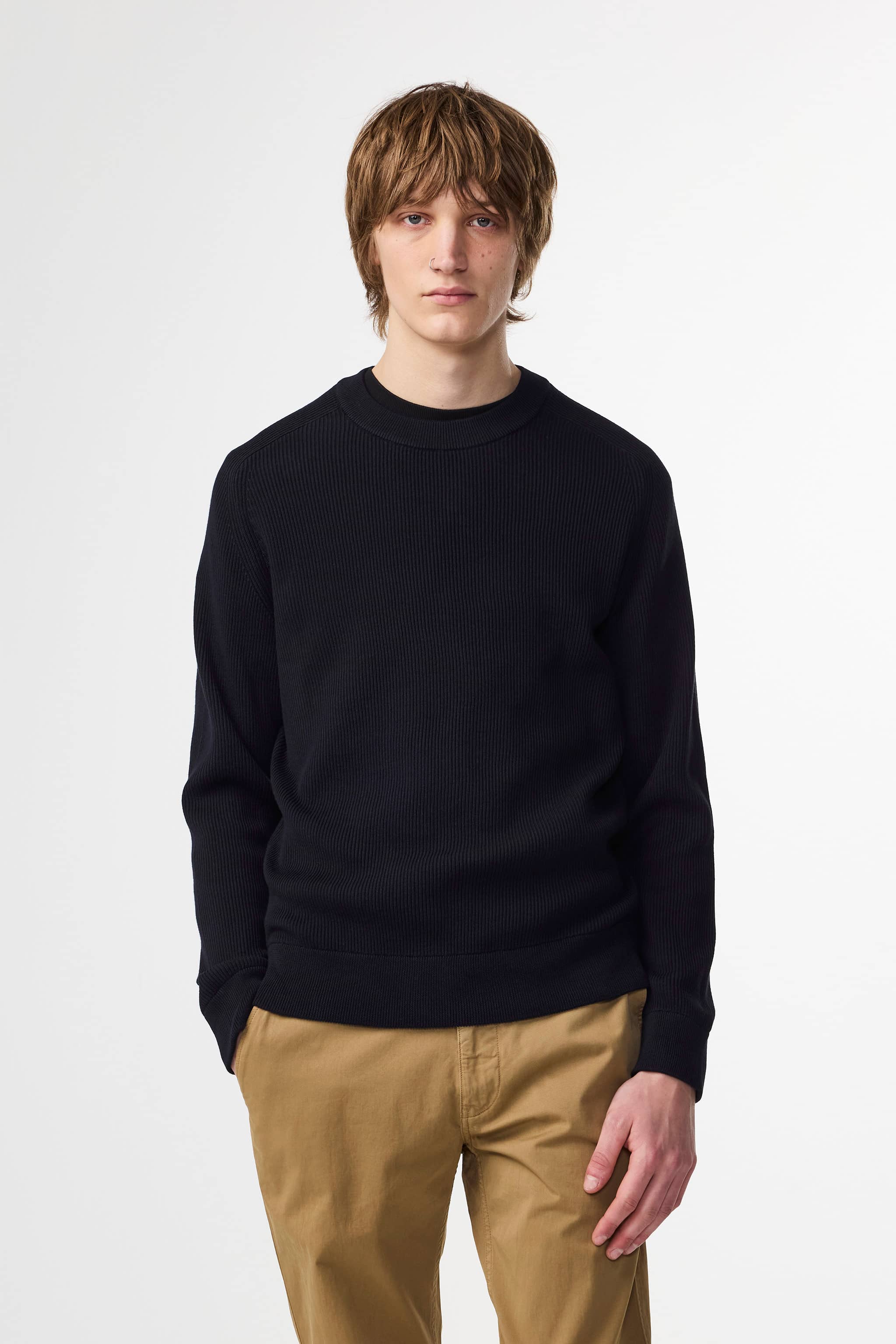 Crew neck crafted in a herringbone-textured stitch from cotton. Features a saddle sleeve and rib along the bottom and cuff.