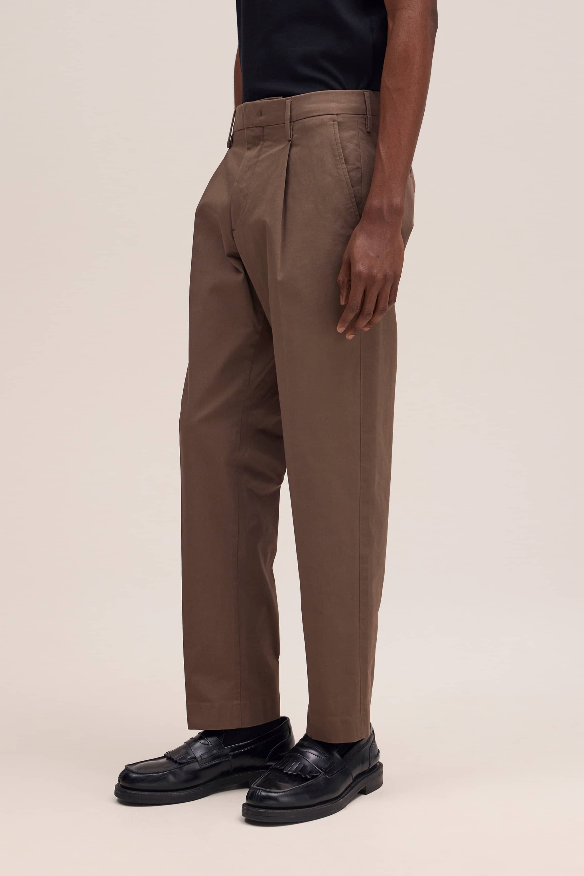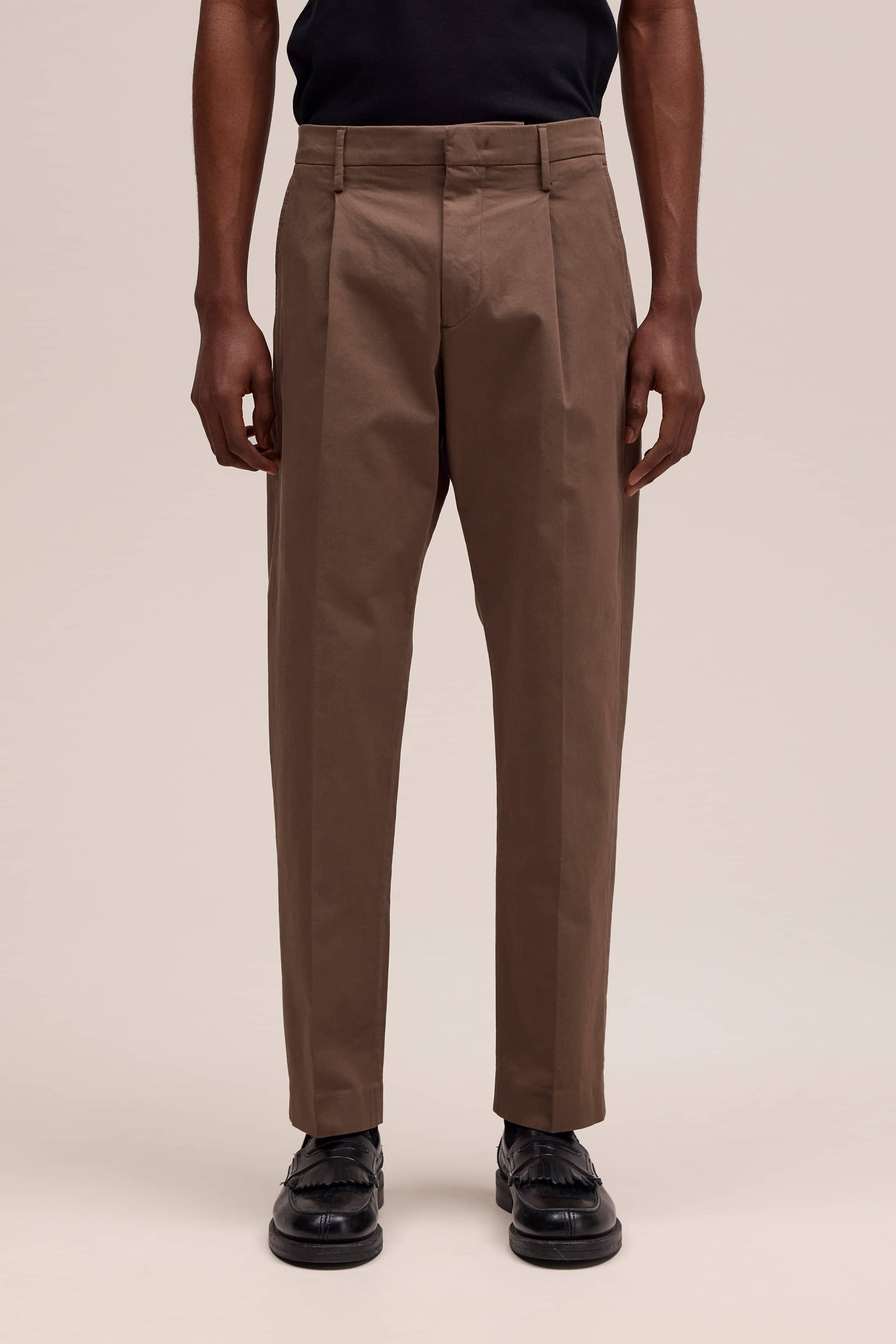Regular fit chinos designed with a tailored tapered leg made from lightweight satin and a soft, silky feel. Includes front pleats, press folds, and detailed stitch finishes. Finished with a decorative stitch and bar tag detailing, and buttoned back pockets.