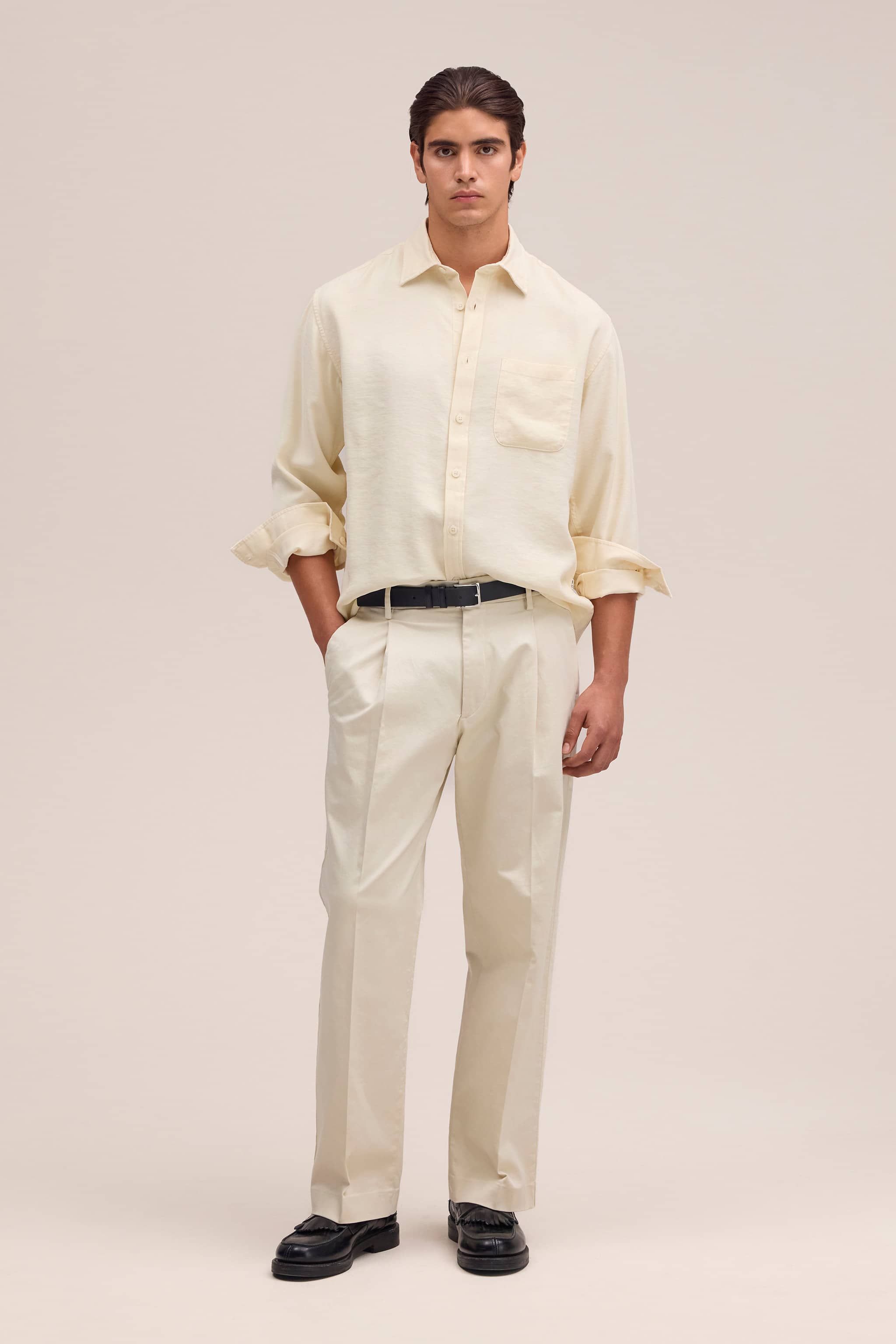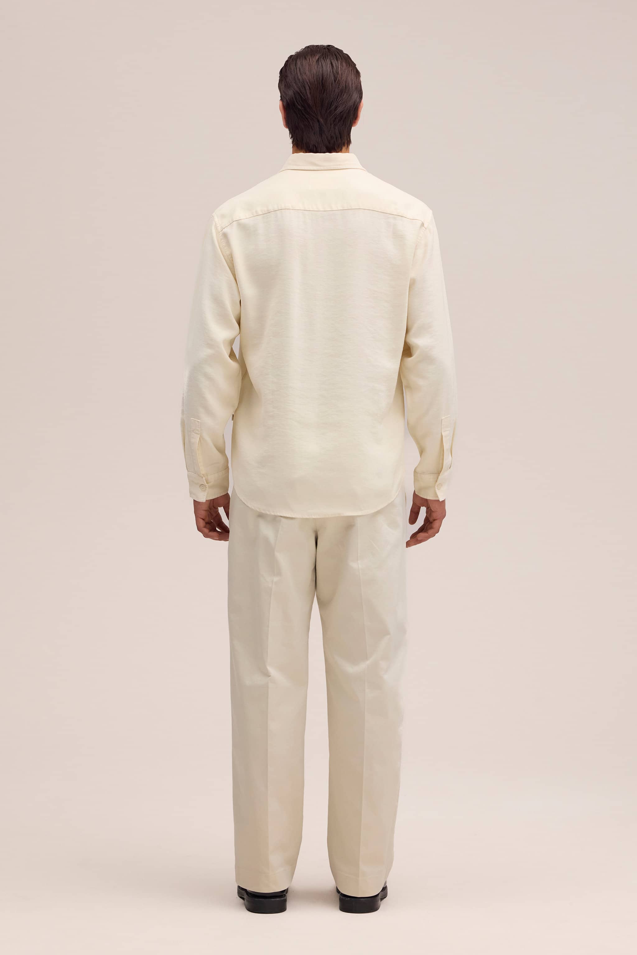 Medium-weight shirt made from soft, drapey LENZING™ ECOVERO™ viscose twill. Designed with a wide placket, curved hem, and slightly dropped shoulders.