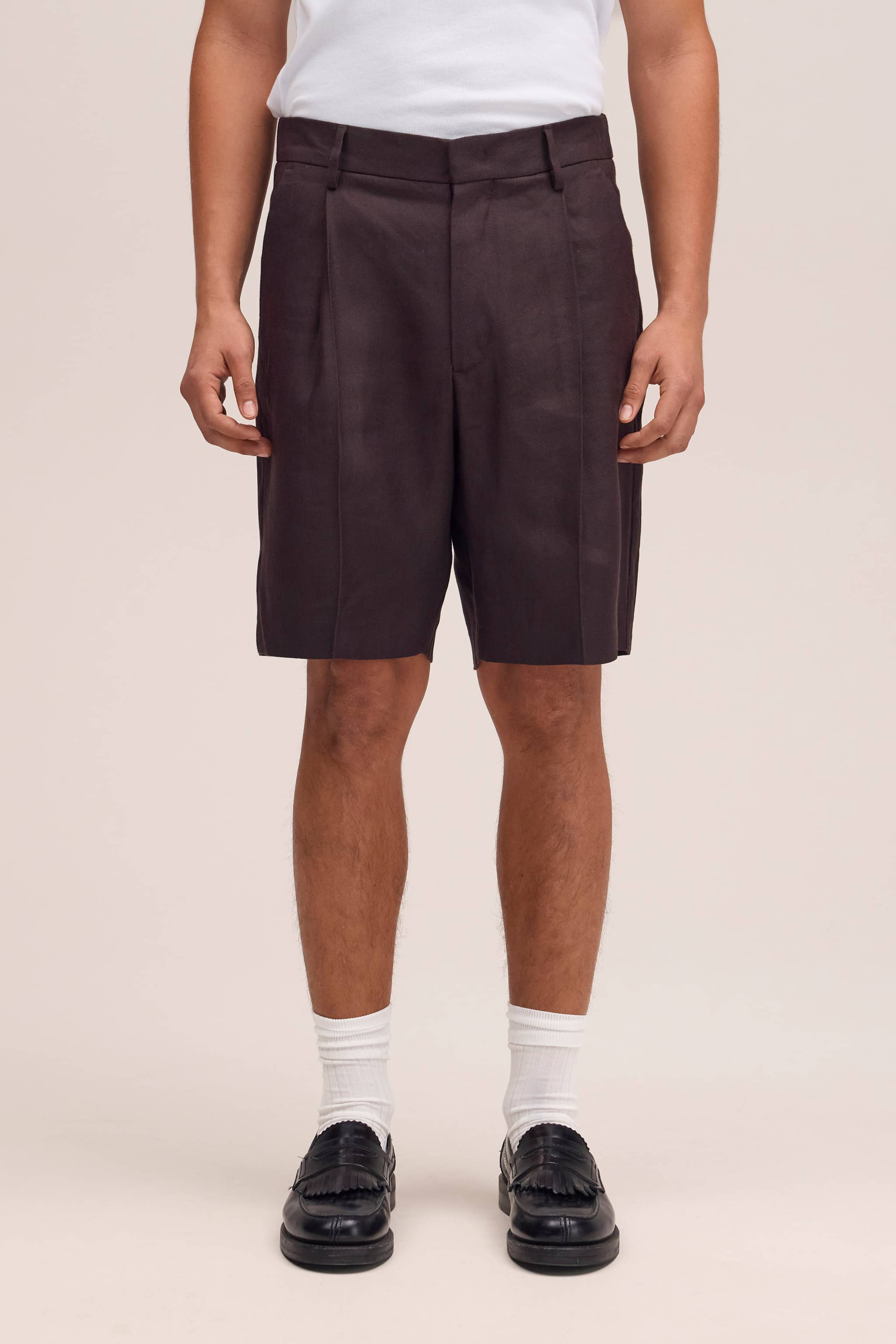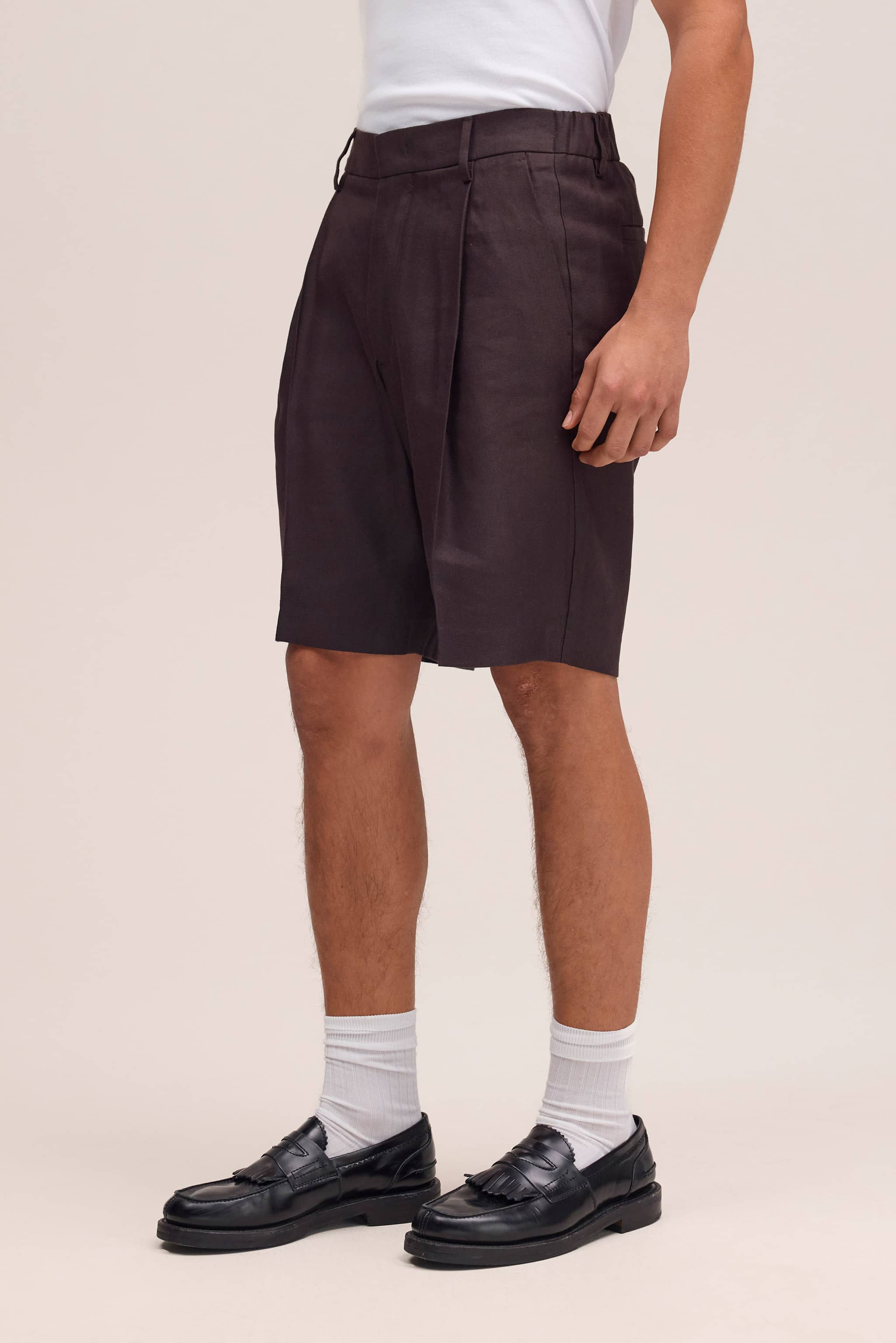 Relaxed shorts in a Panama weave, made from a blend of linen and LENZING™ ECOVERO™ viscose. Features include front pleats and back welt pockets for a clean, structured look.