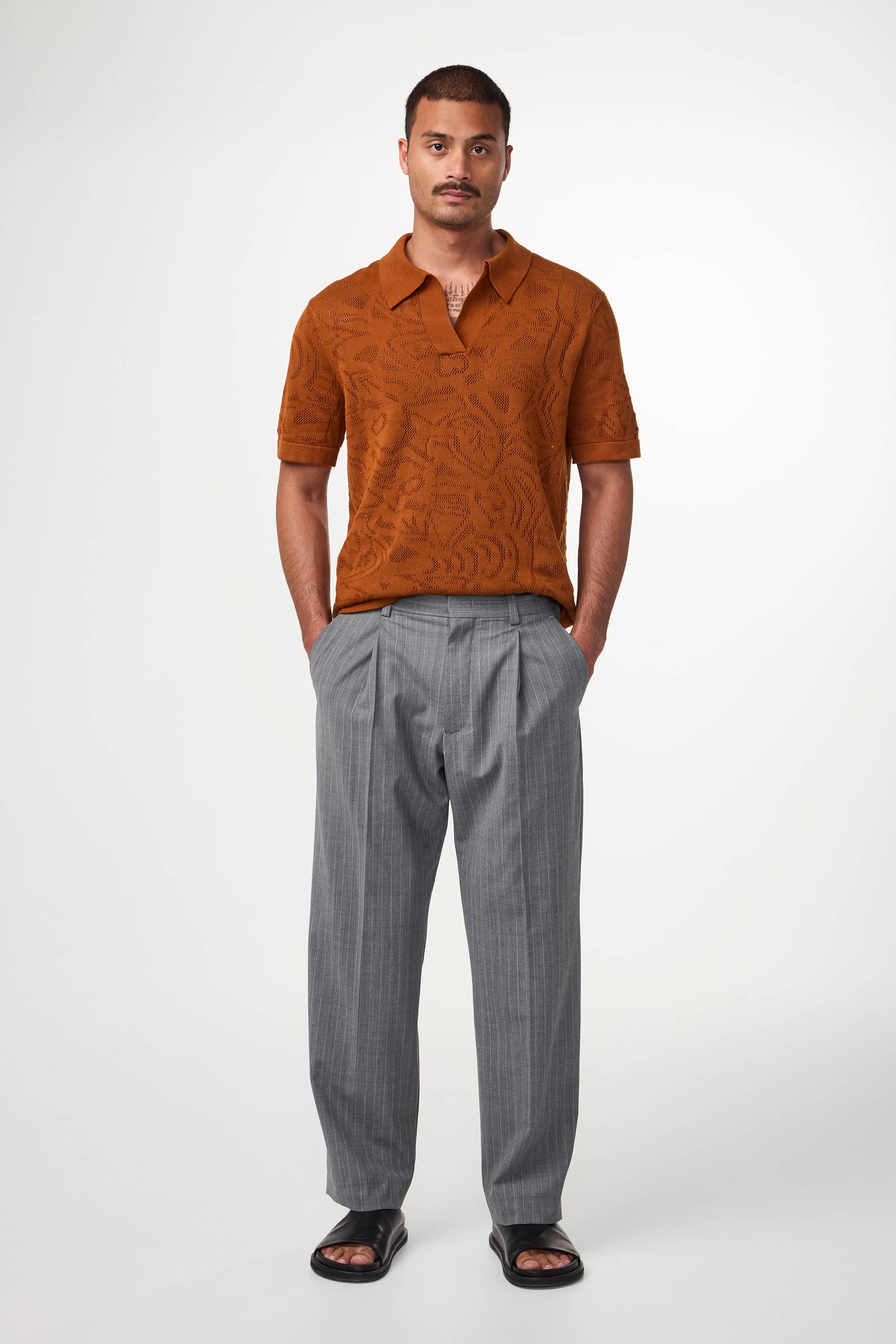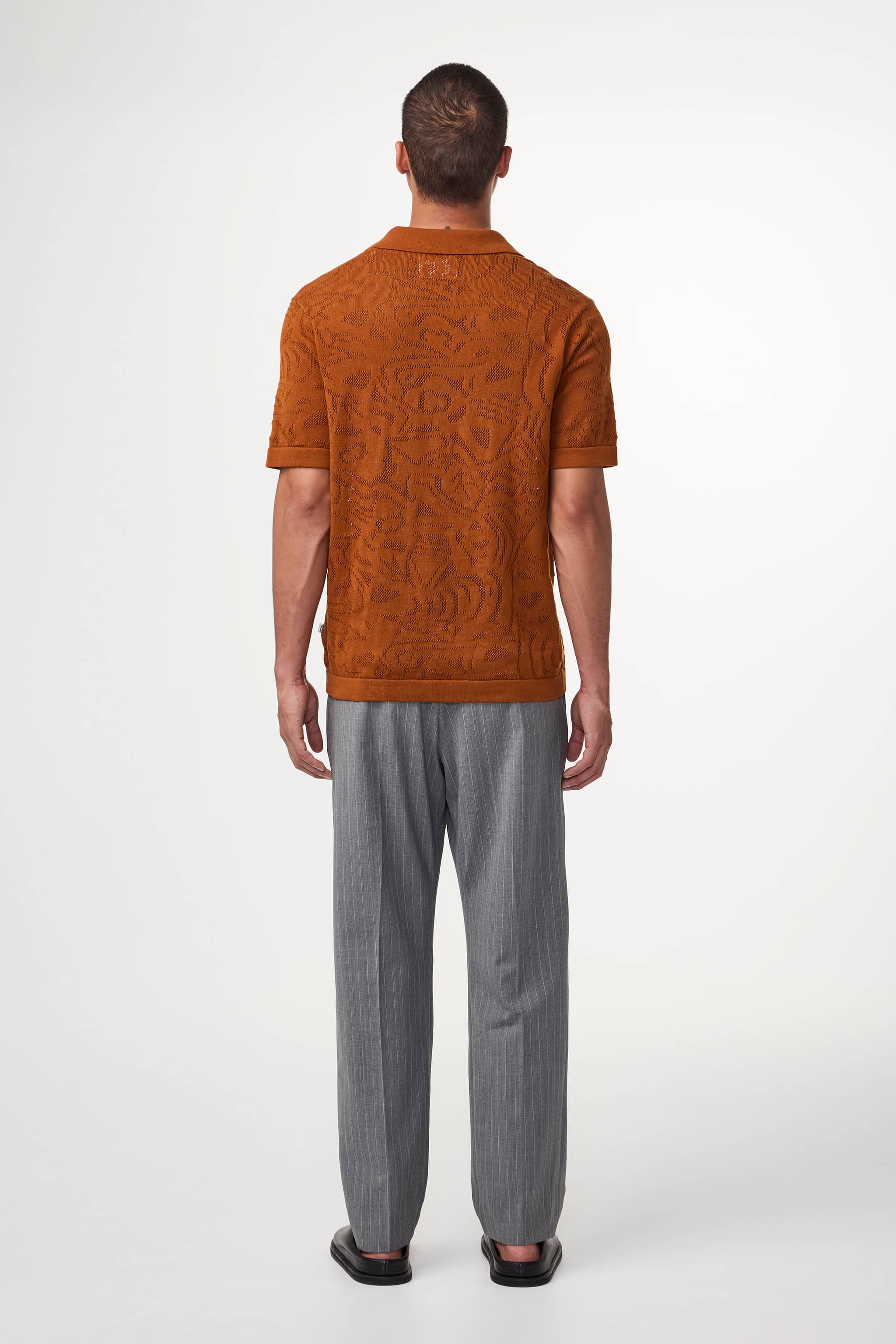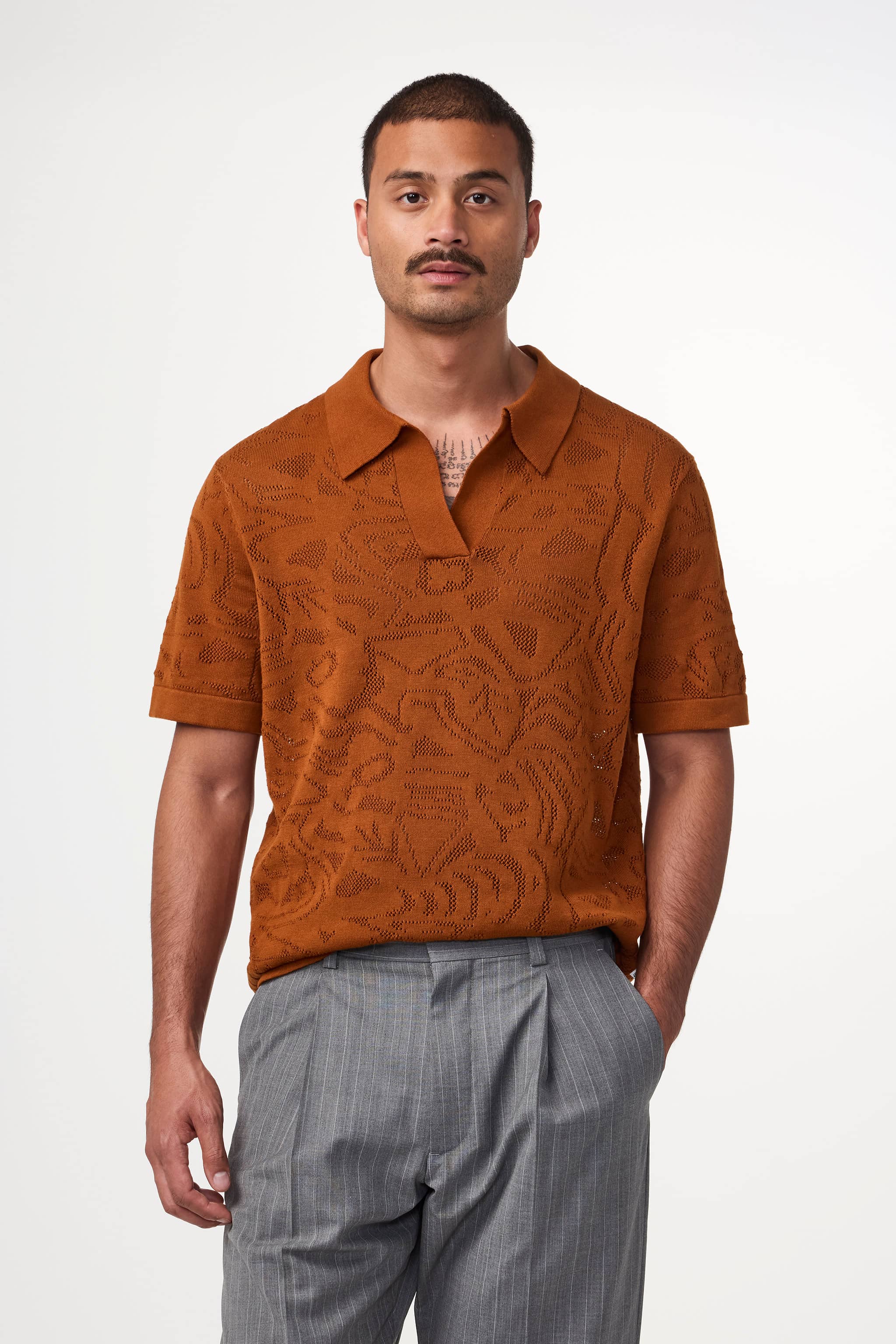 Tonal jacquard polo made in organic cotton designed with a unique flower jacquard pattern. Finished with a fine rib detail along the cuff and bottom hem, and side slits.