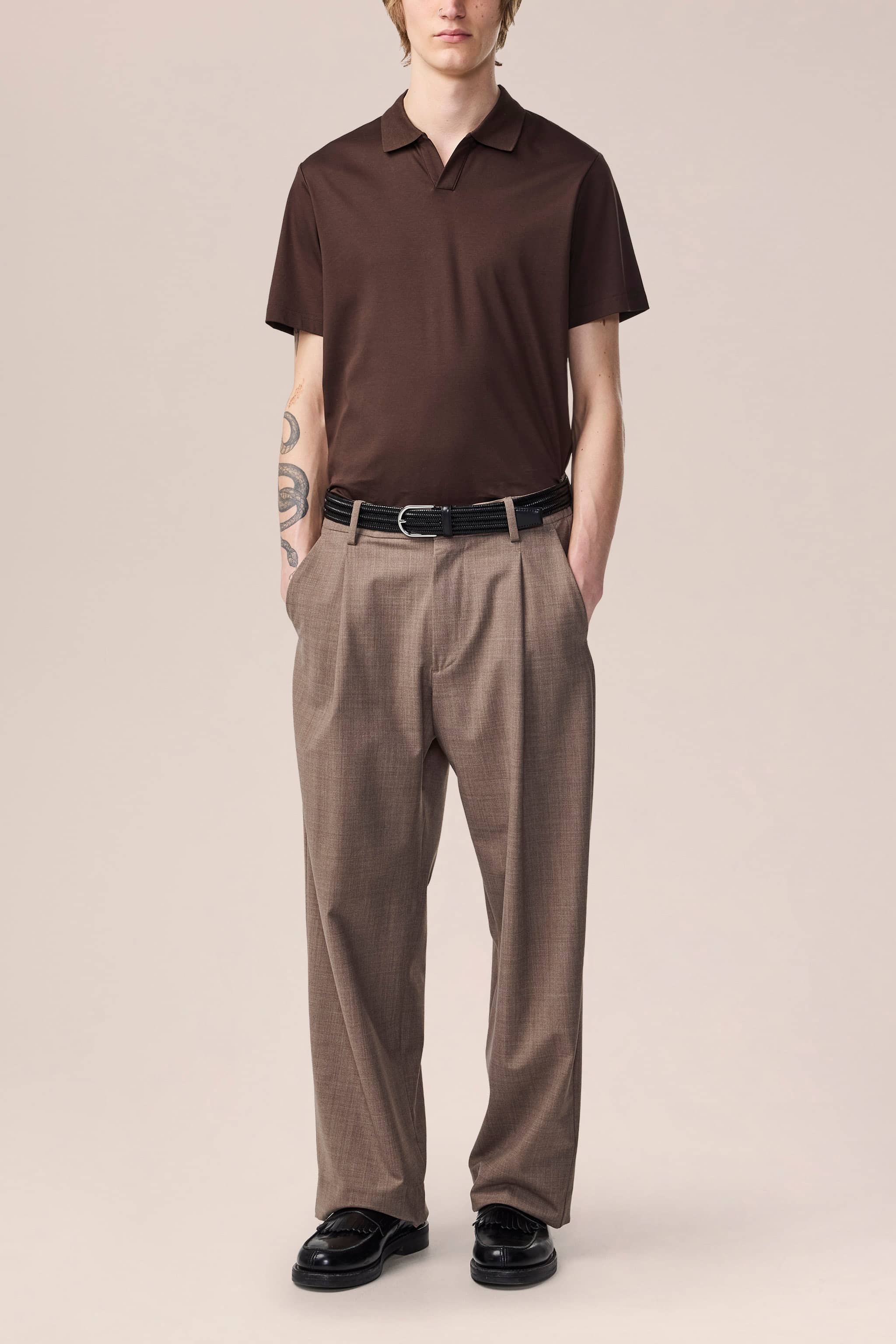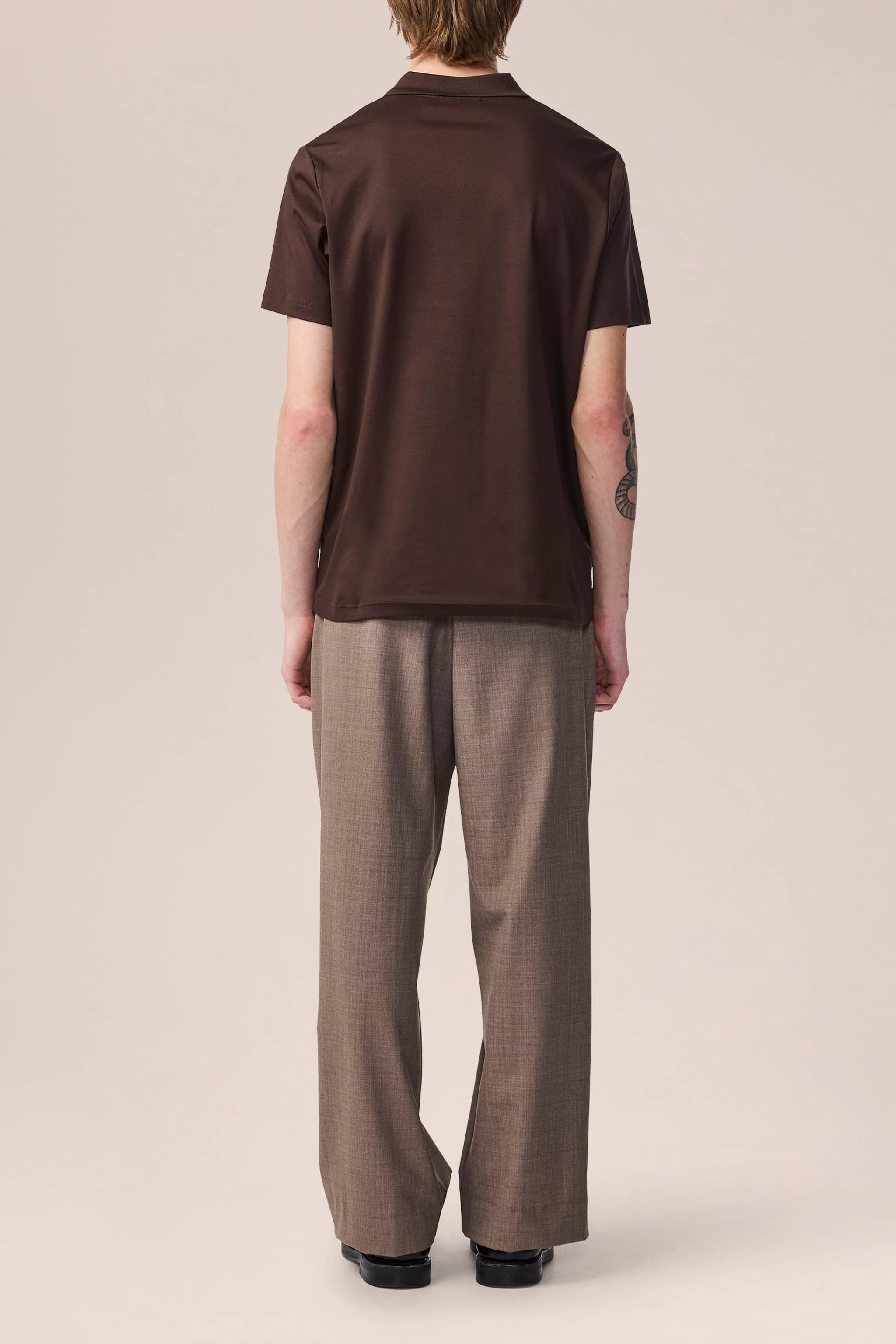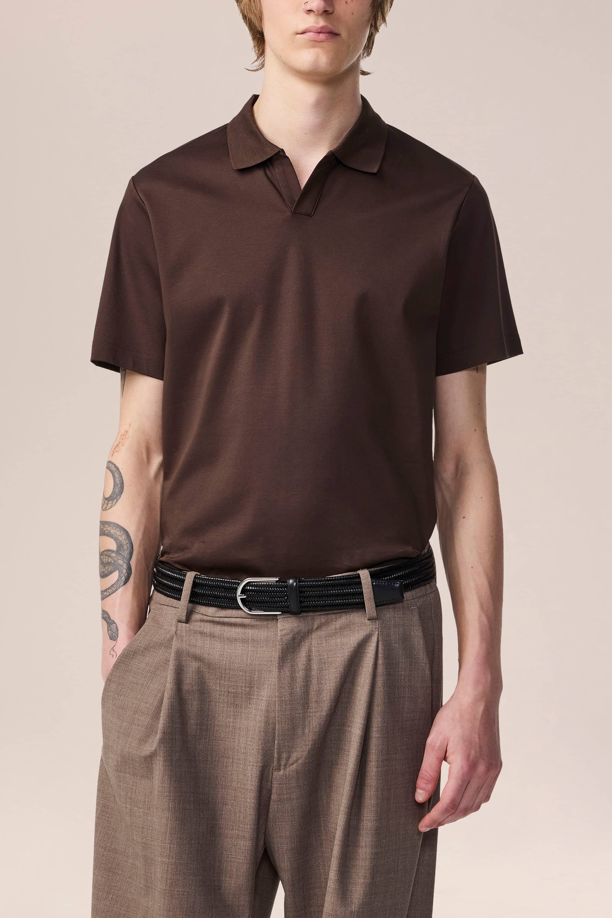Open-collar polo crafted in smooth organic cotton interlock jersey with a soft, luxurious handfeel. Finished with a flat knitted collar and twin-needle stitching.