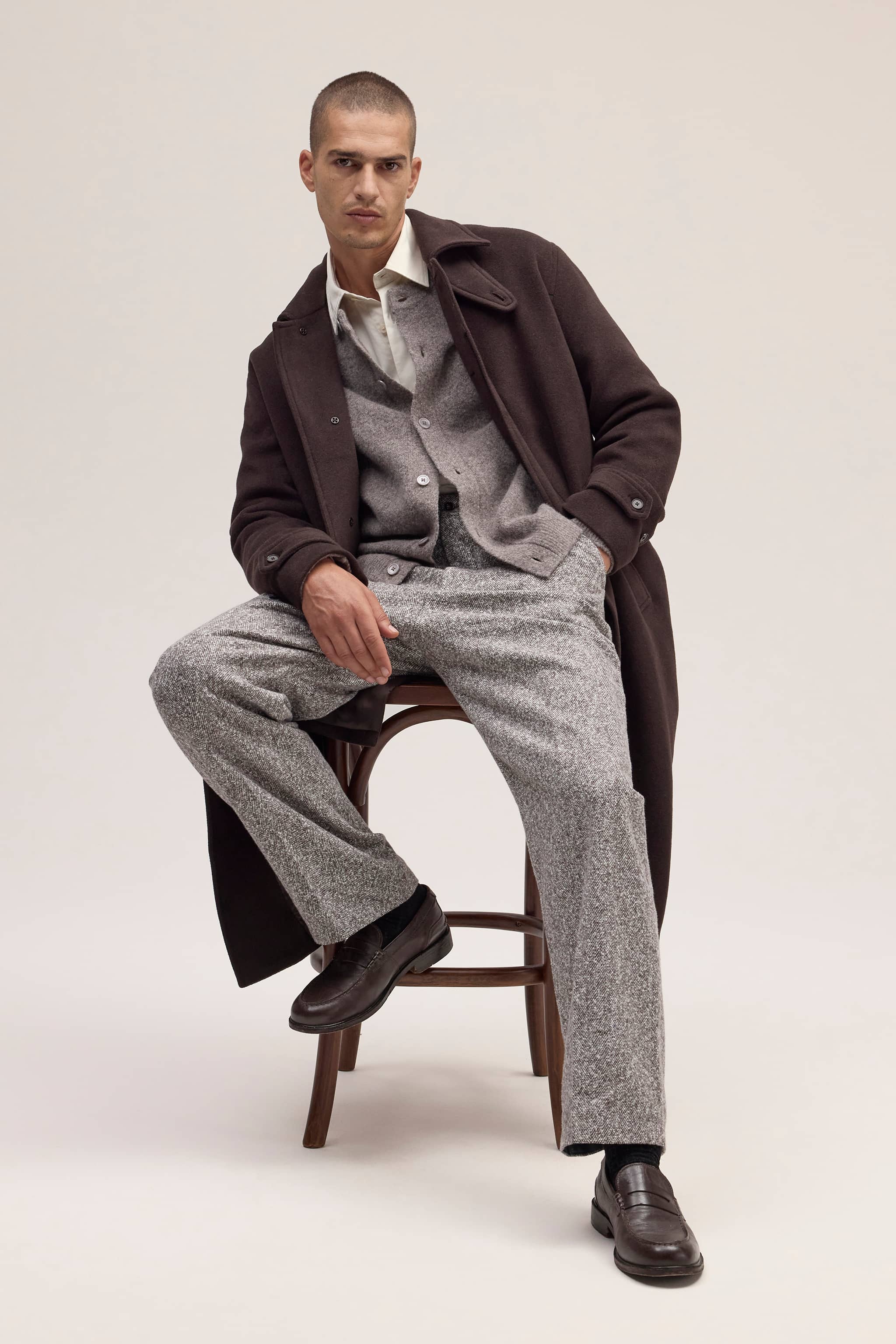 Relaxed-fit dress trousers crafted from heavy recycled 425 g/m² Italian bouclé fabric with a sophisticated herringbone weave.
