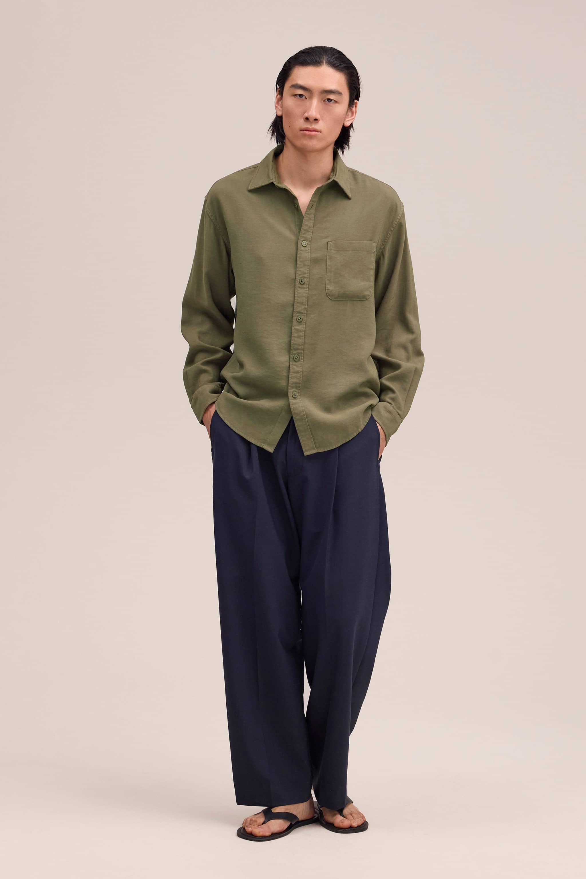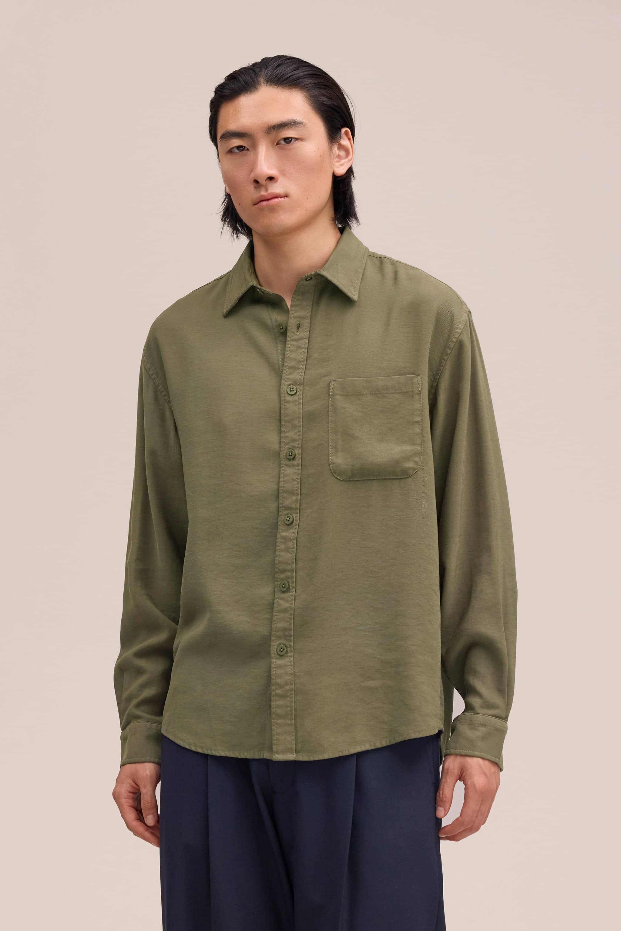 Medium-weight shirt made from soft, drapey LENZING™ ECOVERO™ viscose twill. Designed with a wide placket, curved hem, and slightly dropped shoulders.