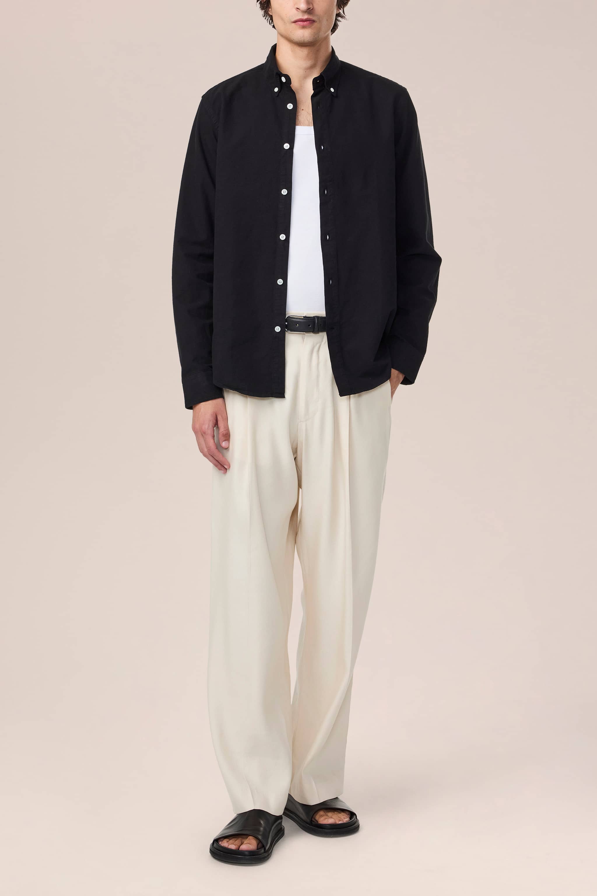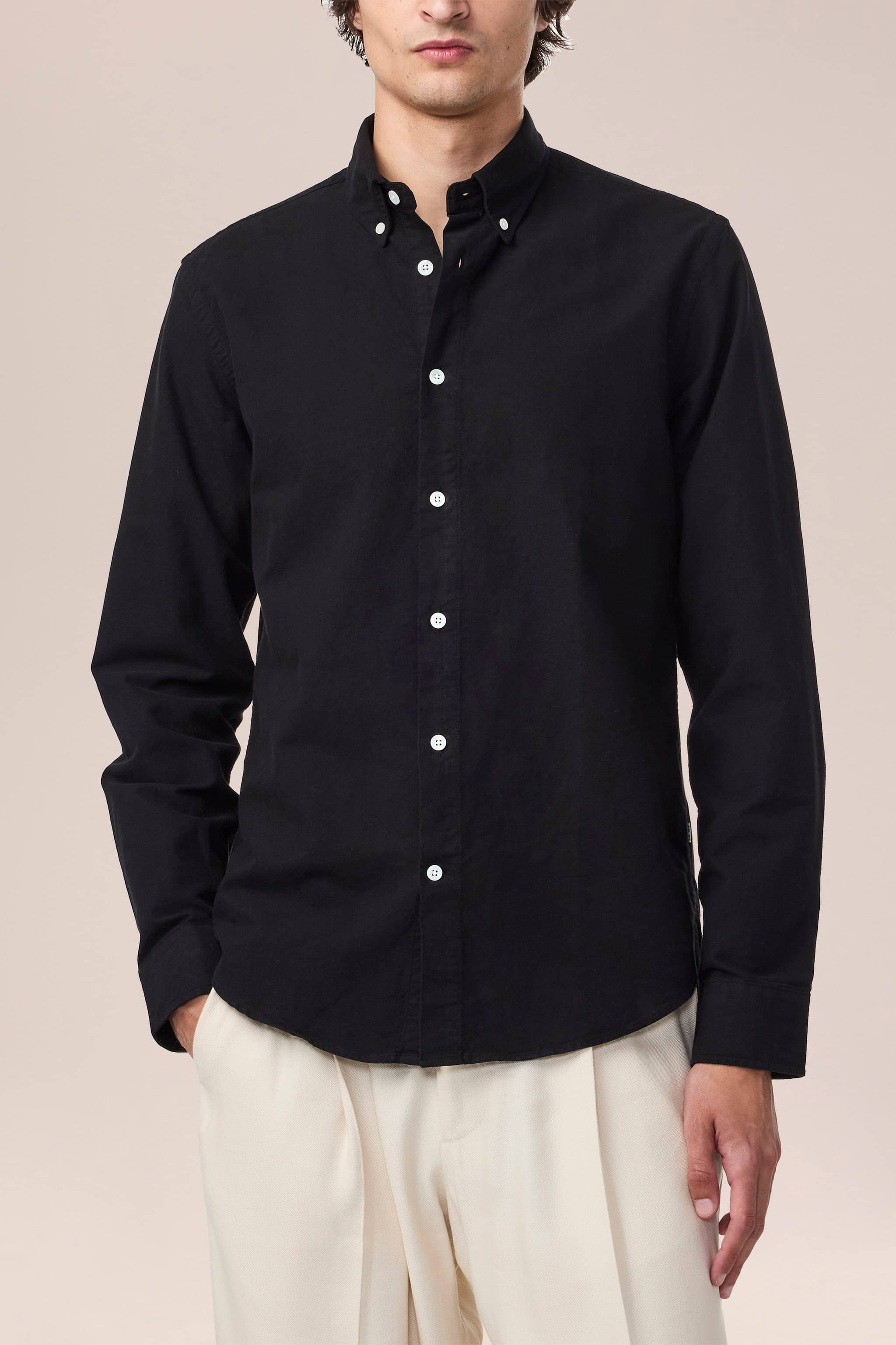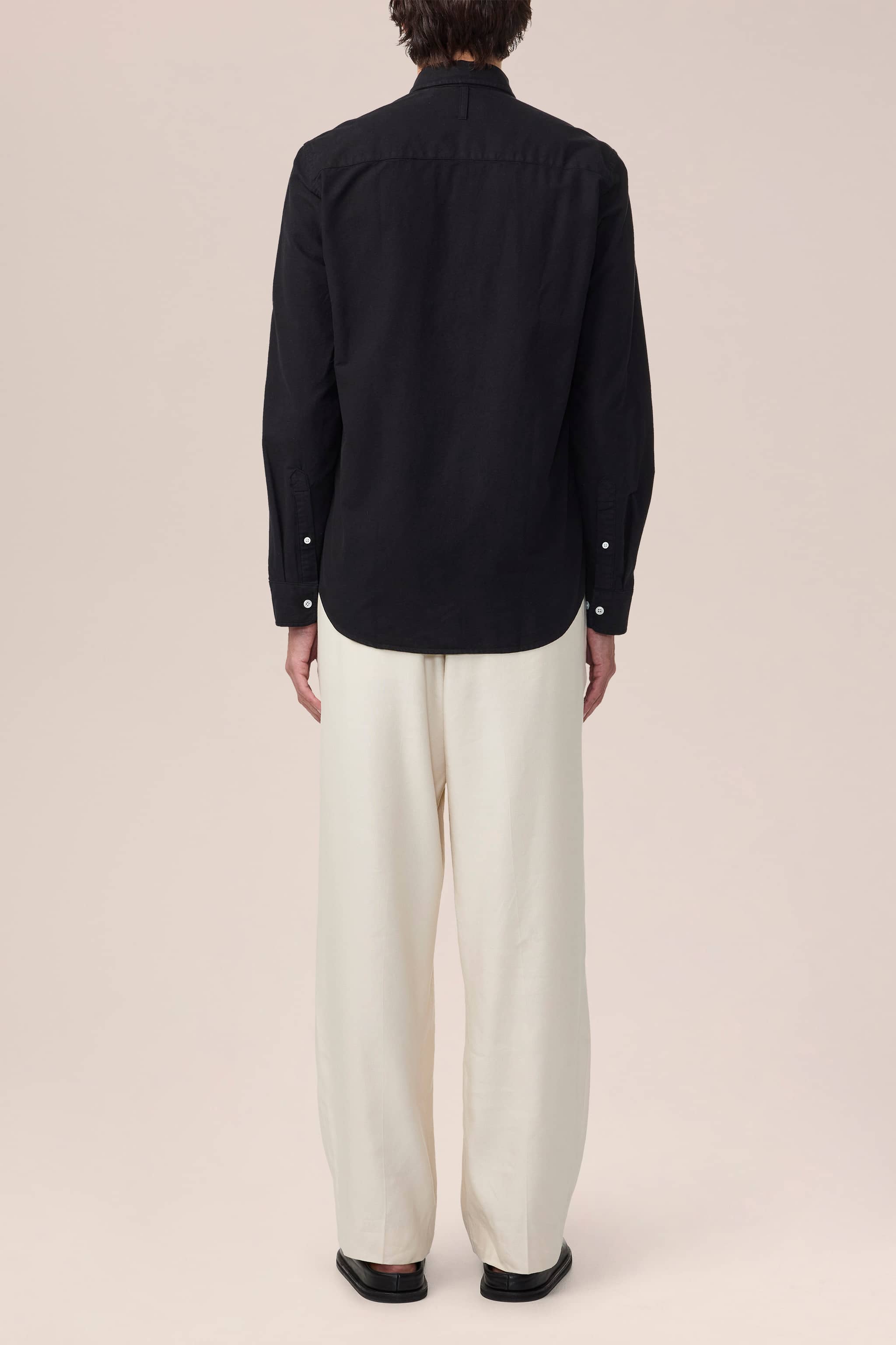 Shirt made in a peachy soft organic cotton oxford. Topped with Mother-of-Pearl buttons. This piece has been garment dyed for a subtle patina, well-laundered look.