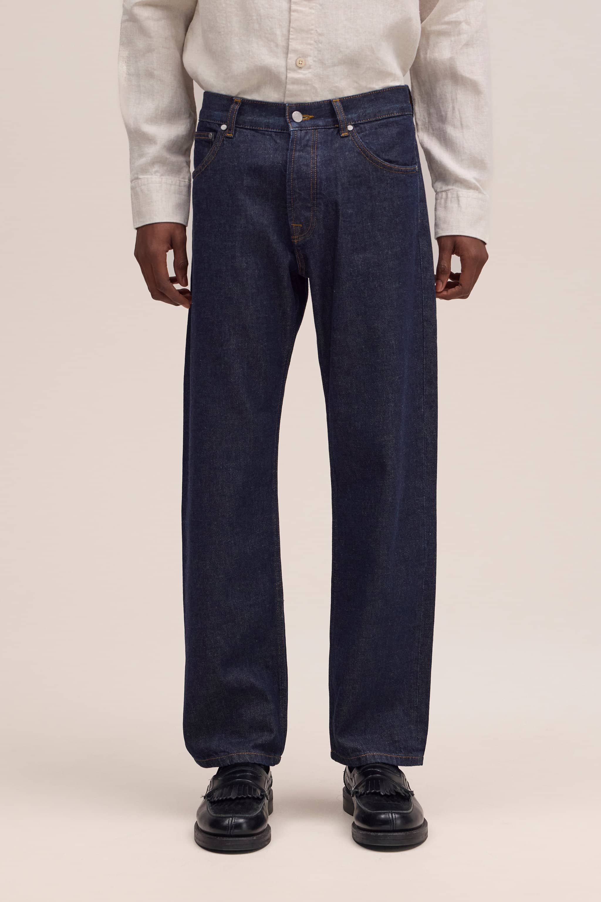 Regular, straight-leg jeans crafted from a midweight 12.4 oz cotton denim. Featuring five-pocket styling, button closure with matching rivets, and finished with blue embroidery stitching along the back pocket.