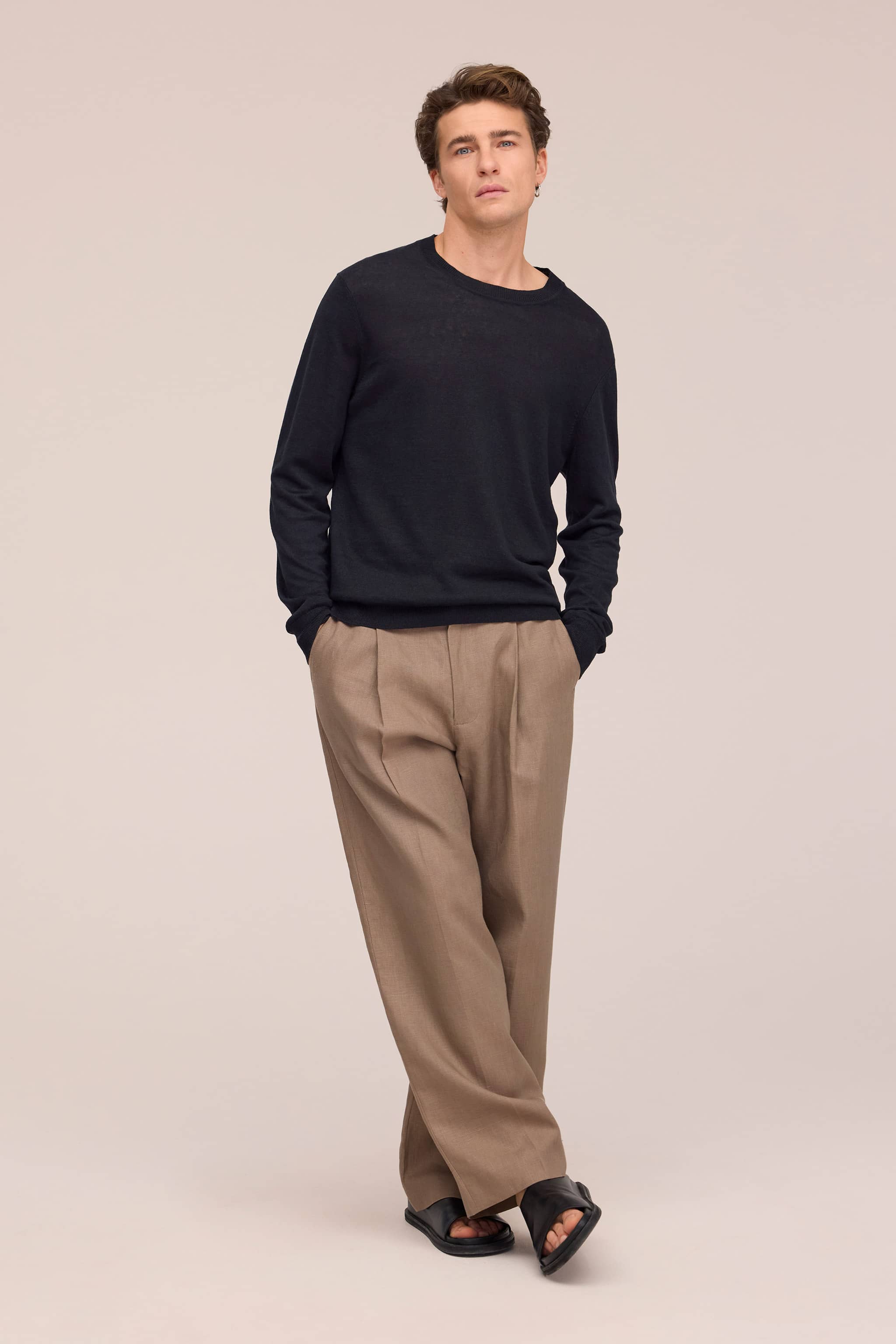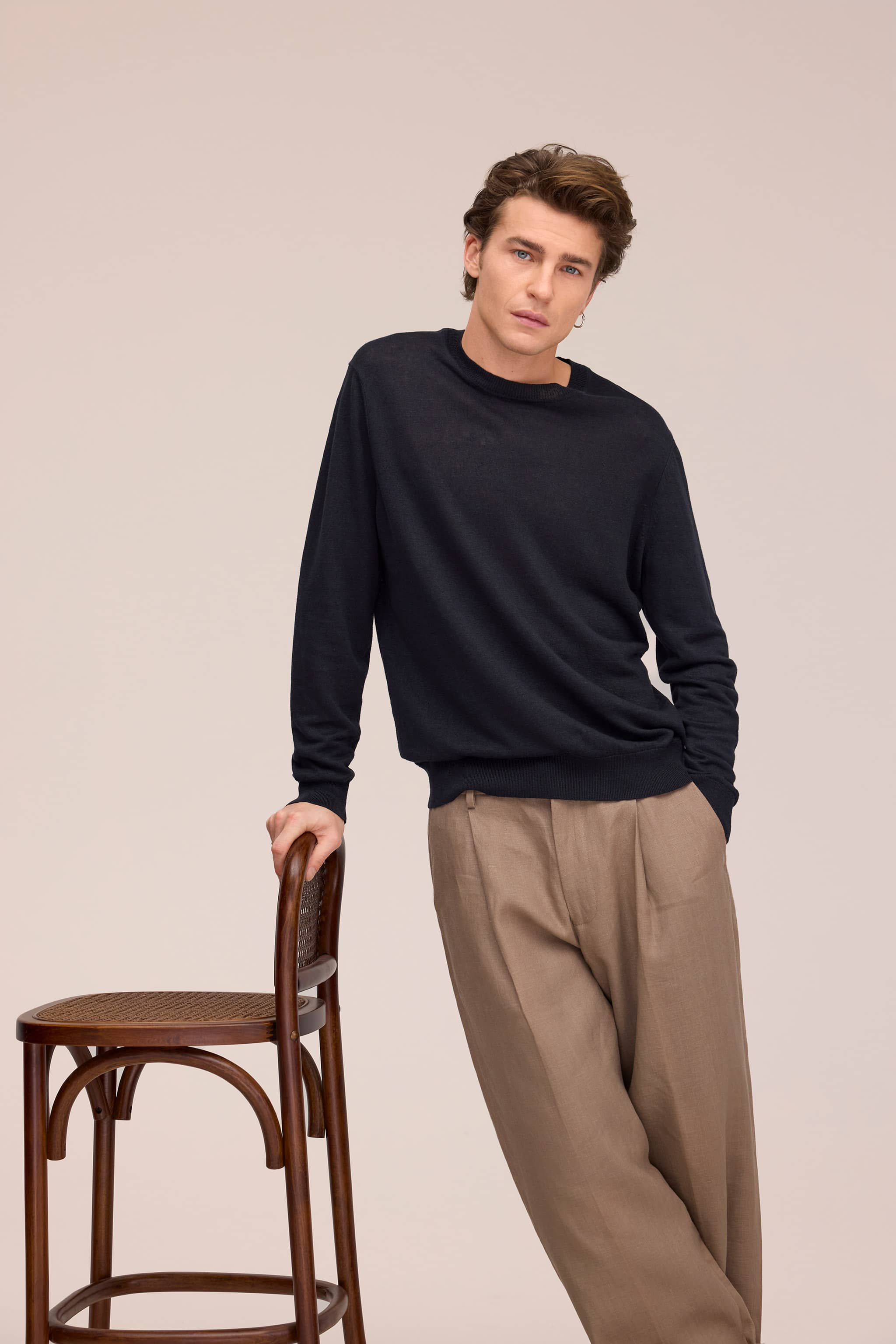 Crew neck knit sweater crafted in super fine European linen with a plain jersey finish. The soft, fine linen fabric offers a light and breathable feel, perfect for classic everyday styling.