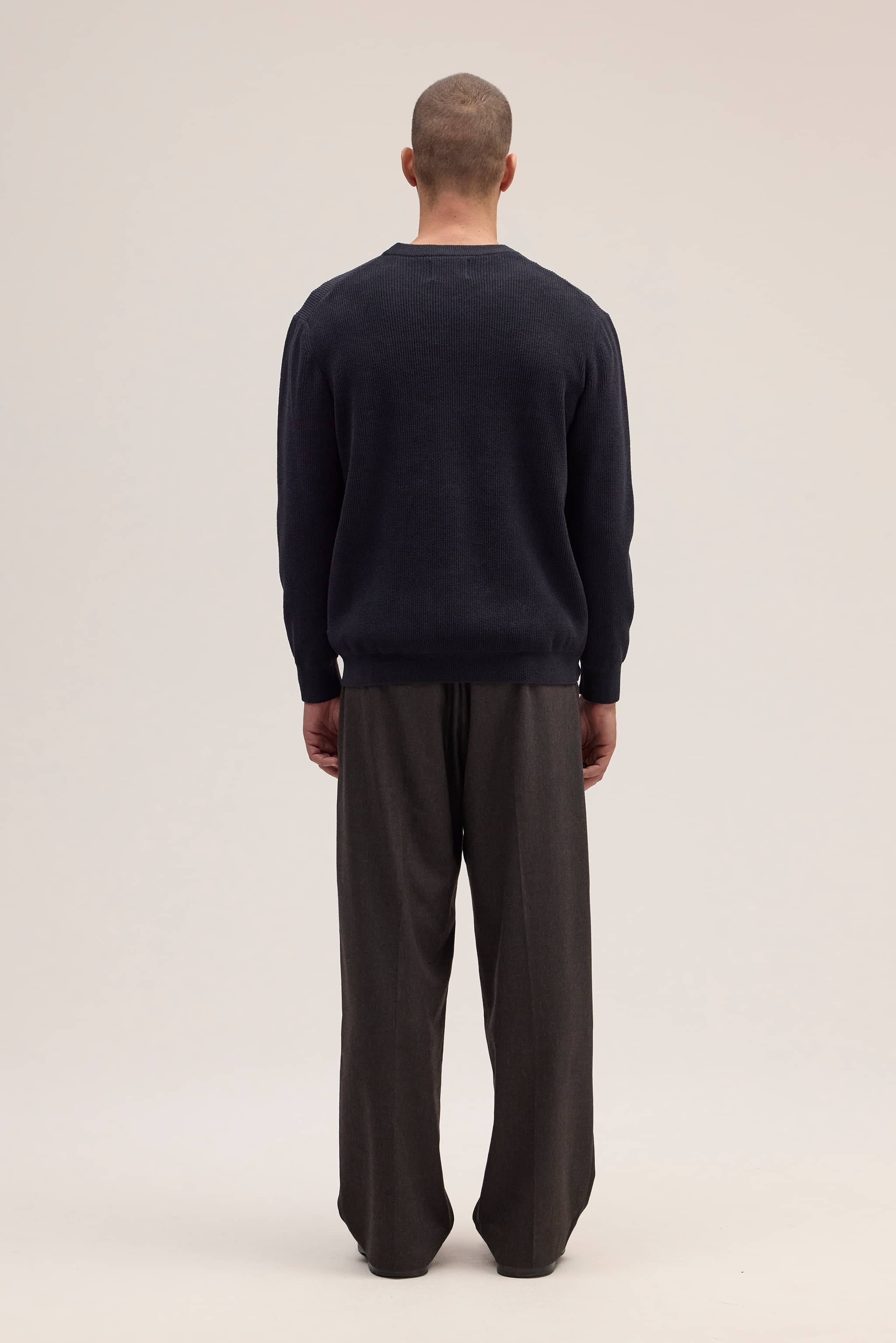 A soft crewneck sweater crafted in a lightweight polyester blend, designed with a neat rib and fashion detailing along the arm and neckline.