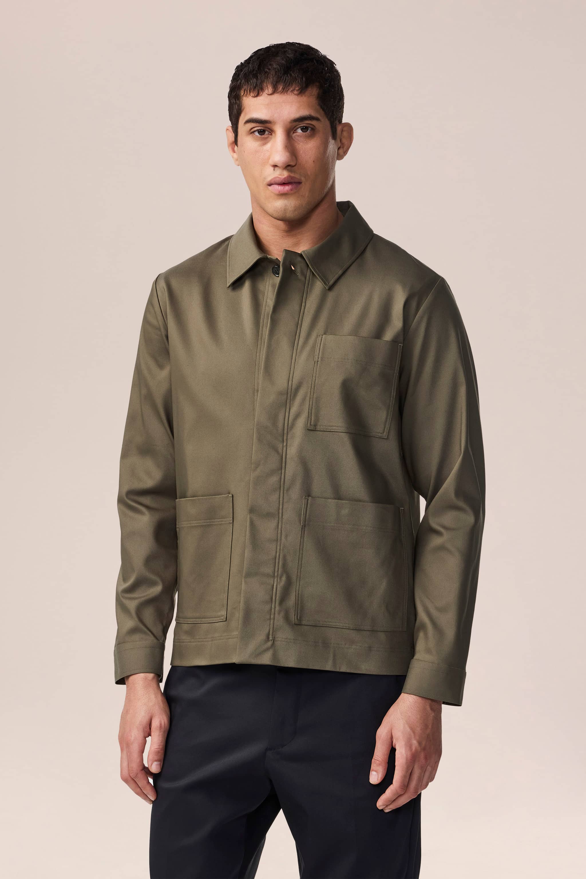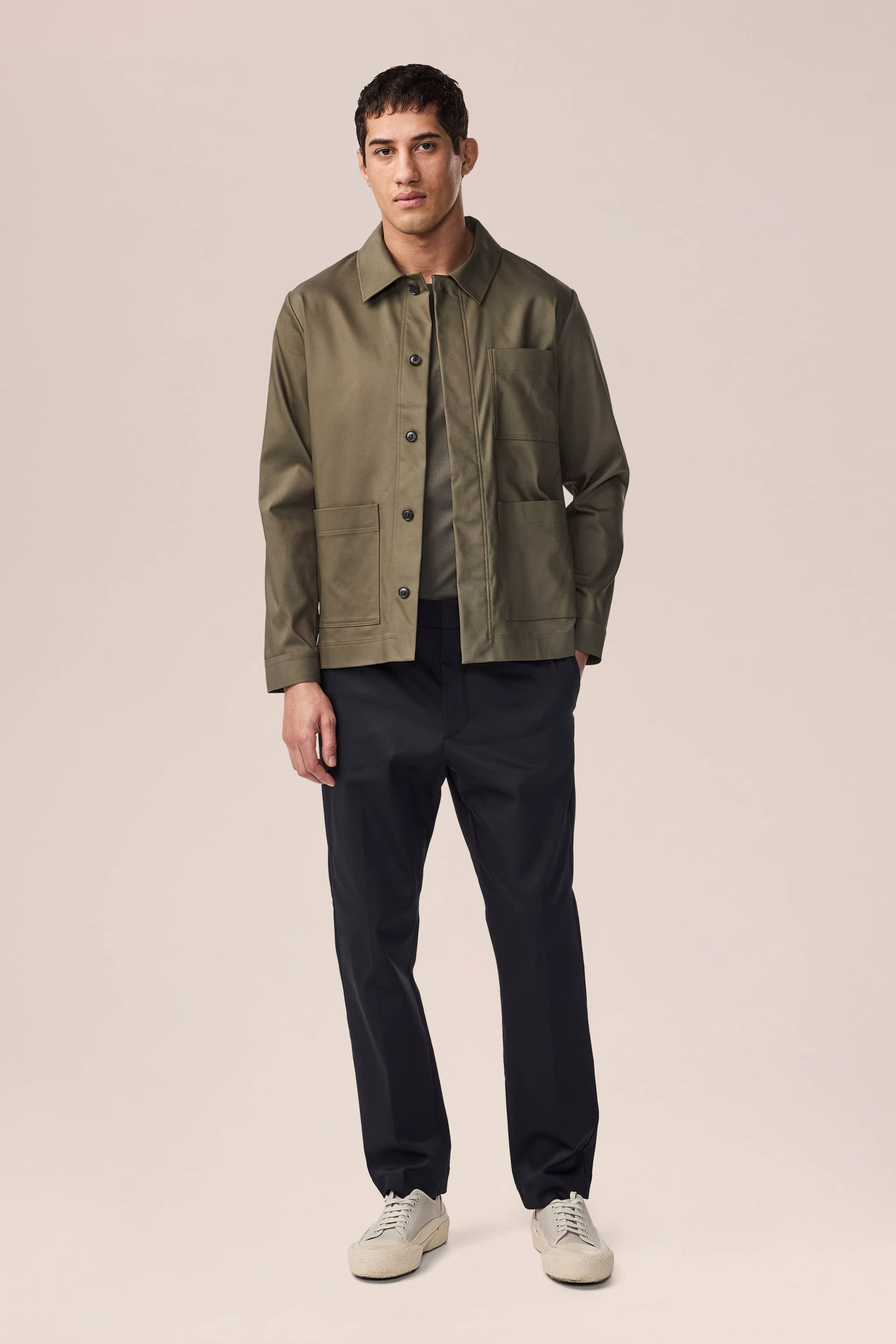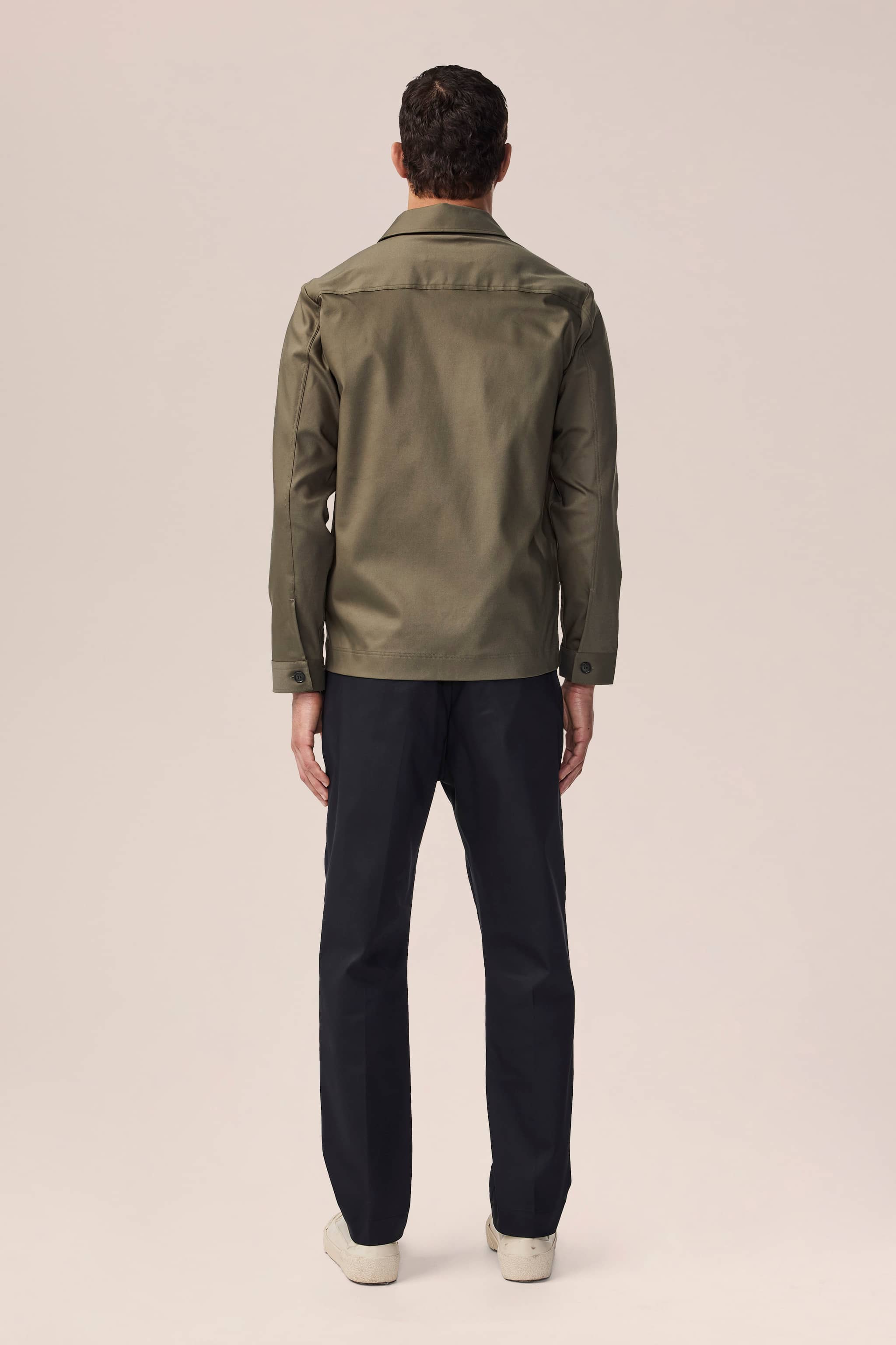 Workwear-inspired overshirt crafted in a cotton blend with a touch of stretch. Designed with a soft collar, a single chest pocket, and twin patch pockets at the waist.